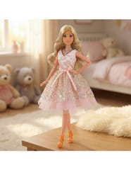 - - Lalka z długimi włosami w różowej sukni
