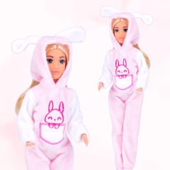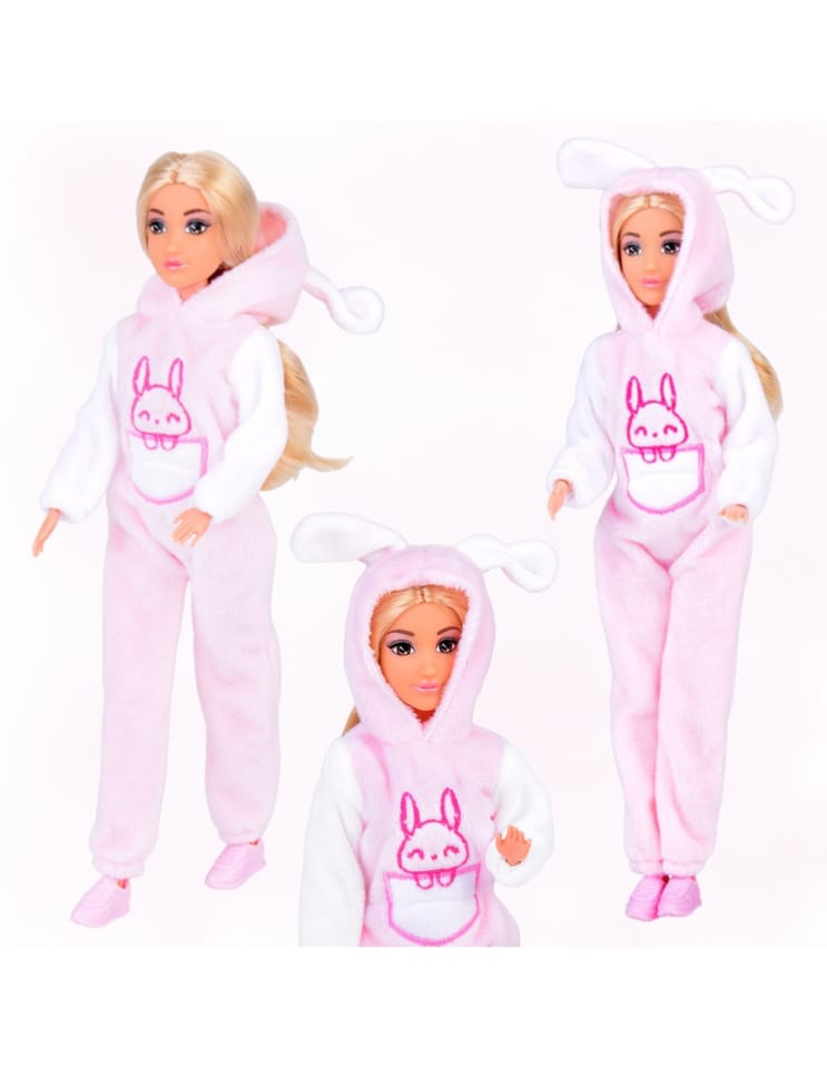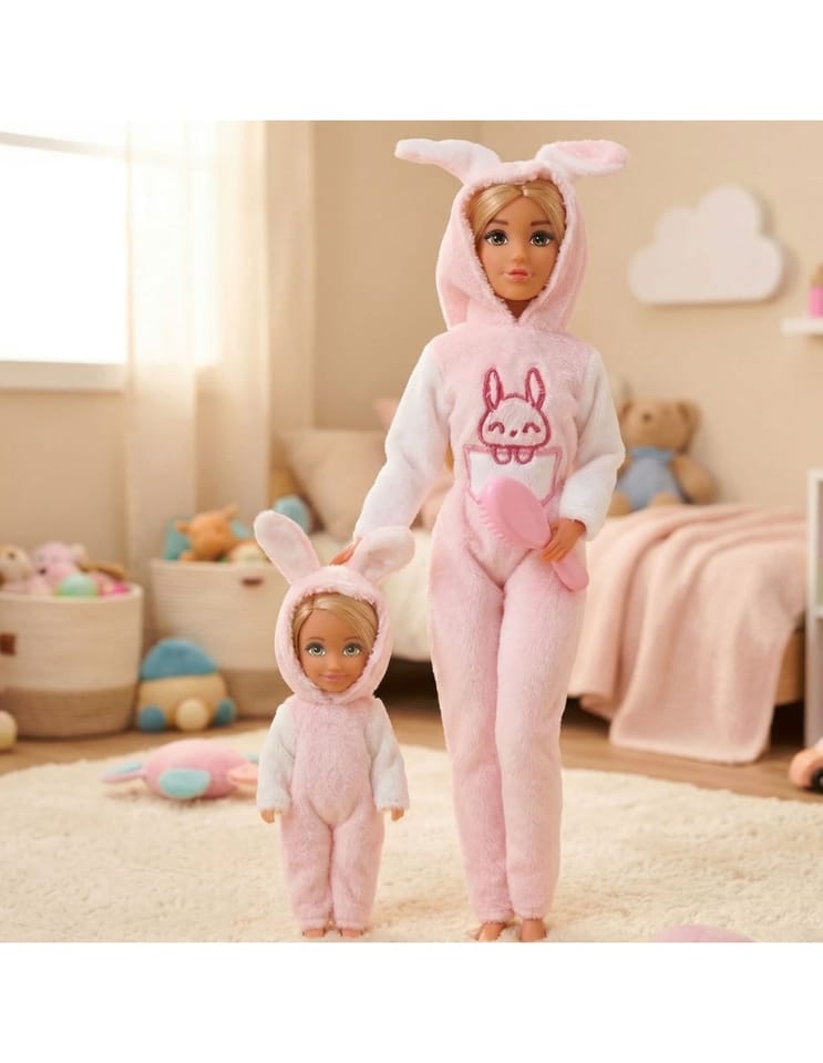 - - lalki ubrane w dopasowane różowe kombinezony króliczki