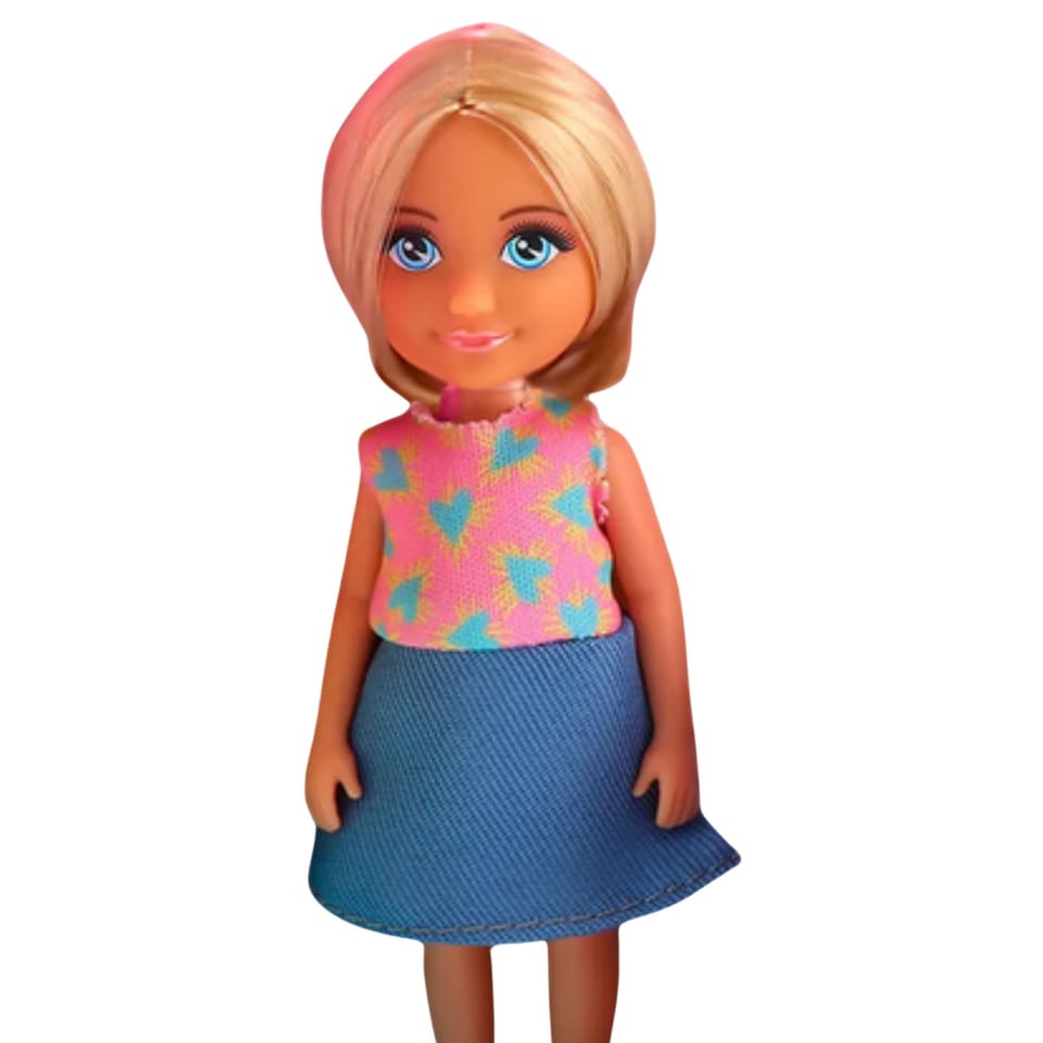- - Lalka Ankiki z blond włosami, ubrana w spódnicę i top w serduszka.