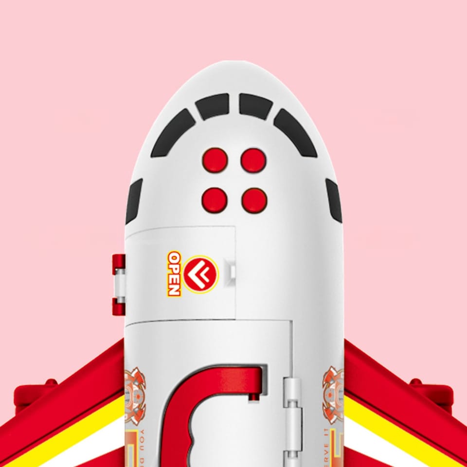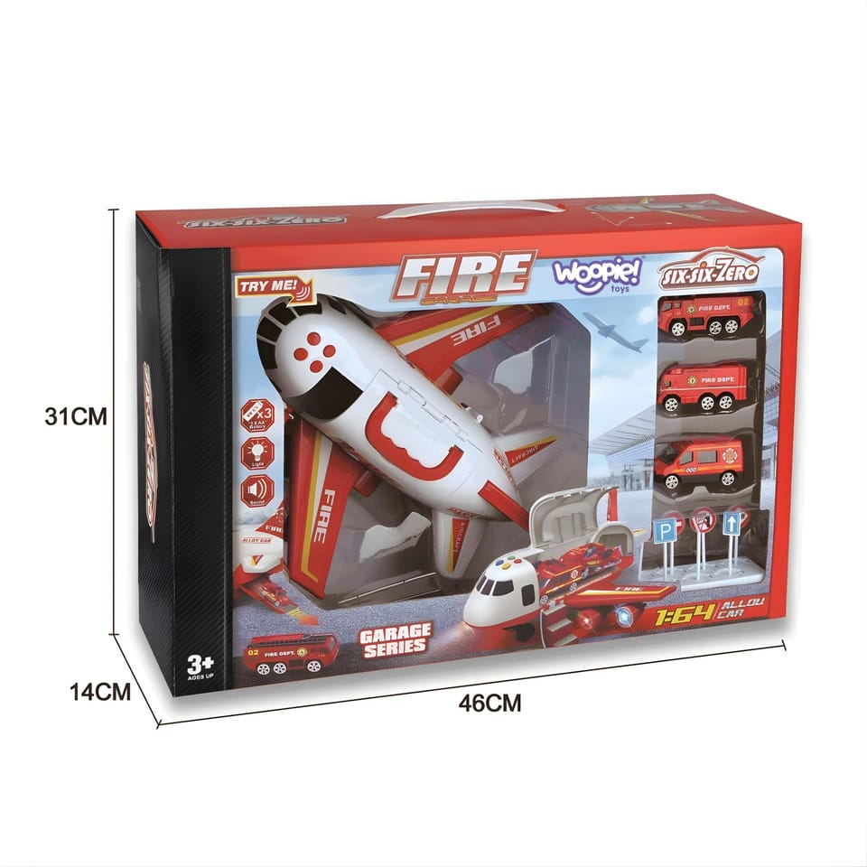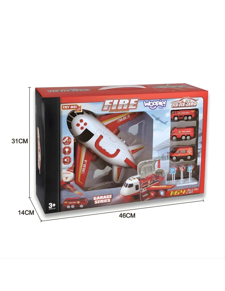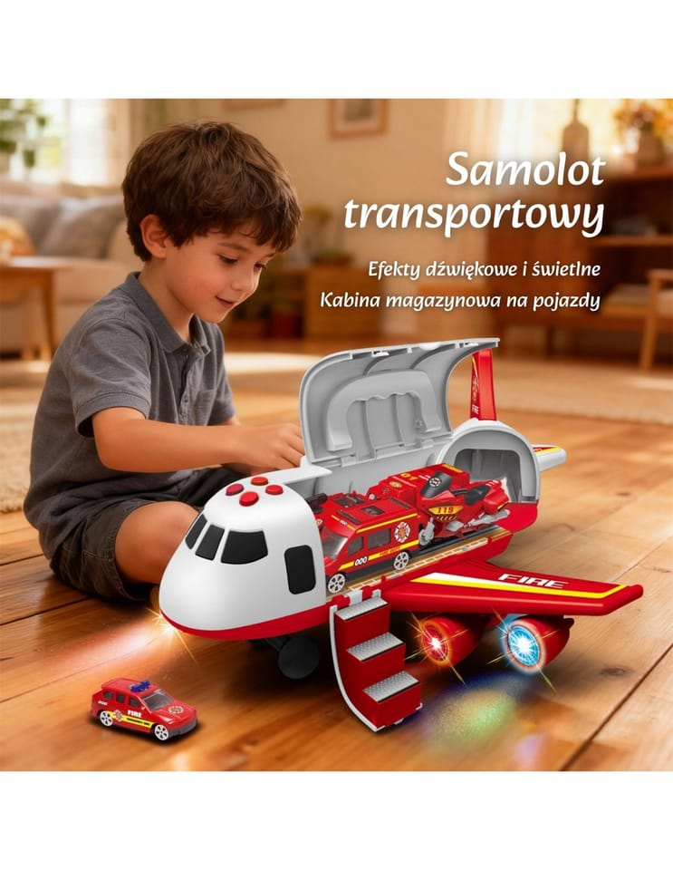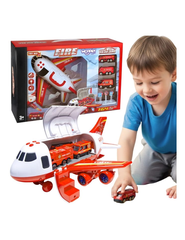 Poznaj transporter-samolot strażacki od marki WOOPIE!, który zabierze dziecko w emocjonującą misję ratunkową! W przestronnym kadłubie samolotu umieszczone się trzy auta strażackie oraz komplet znaków drogowych, co daje pełną swobodę zabawy. Dzięki czterem przyciskom uruchamiającym realistyczne dźwięki i migające diody LED, zabawka ożywa jak prawdziwy sprzęt ratunkowy. Otwierane drzwi i opuszczana rampa dodają dynamiki akcji. To idealny prezent dla małego bohatera od 3. roku życia, który rozwija wyobraźnię i uczy odpowiedzialności.