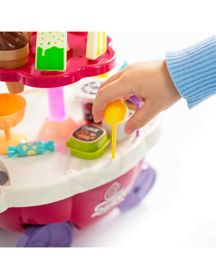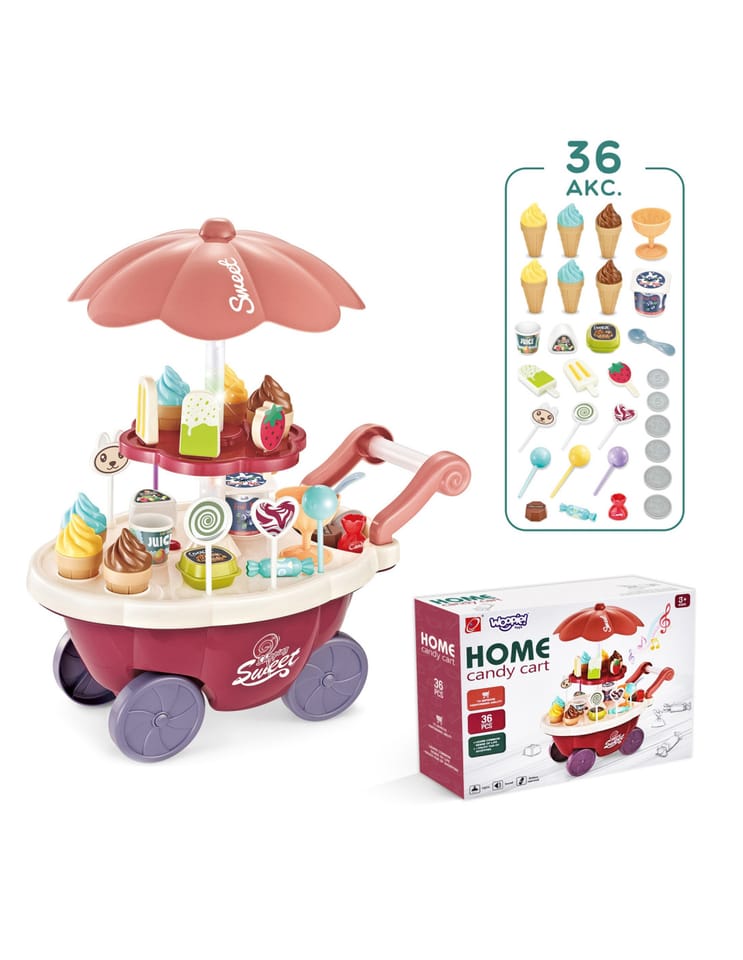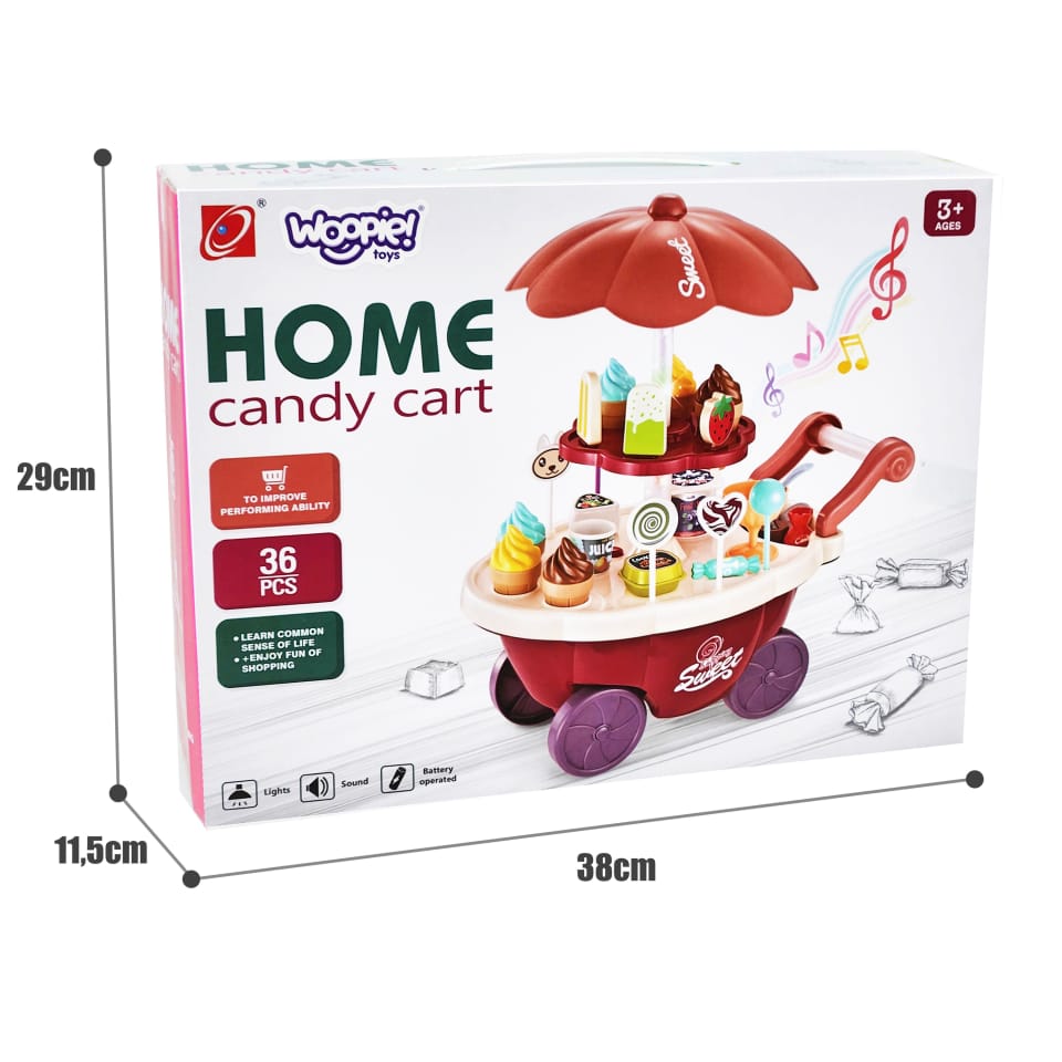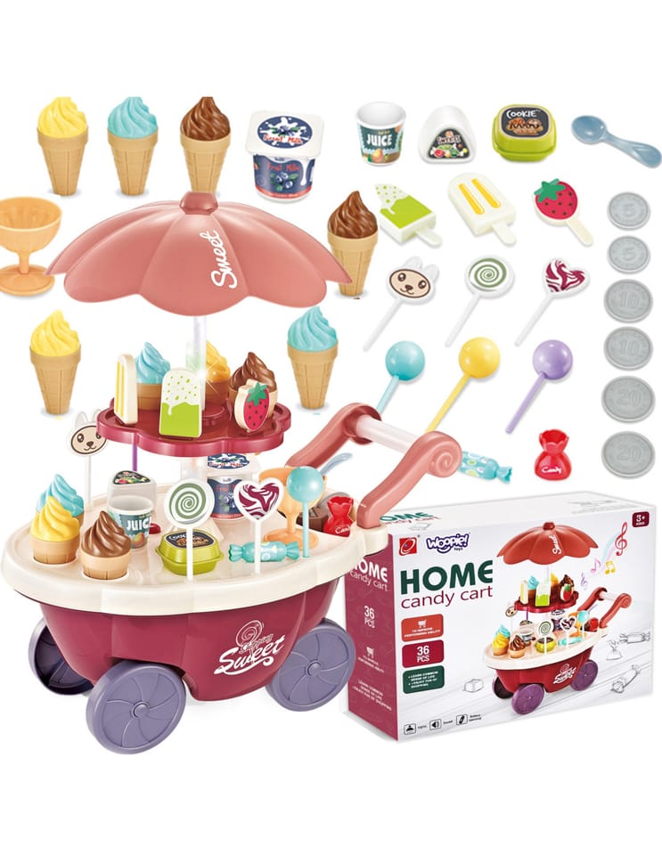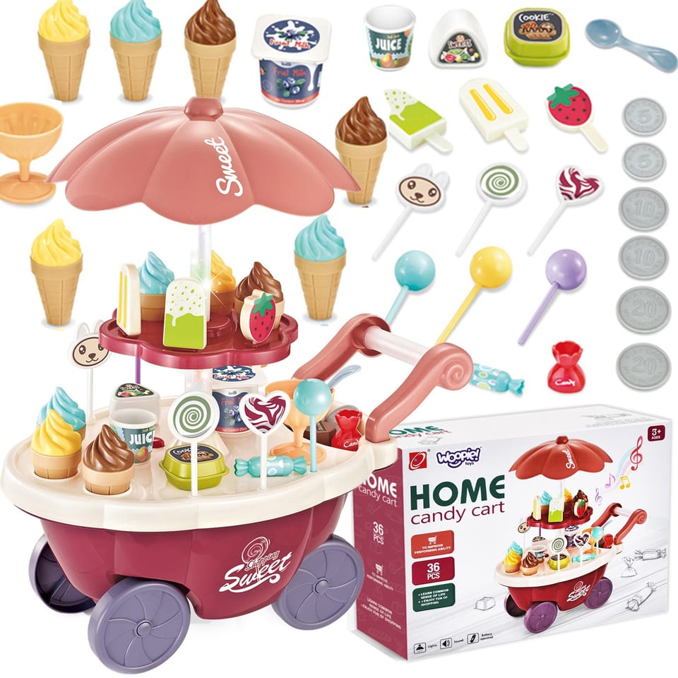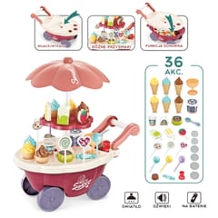 Wózek z Lodami marki Woopie będzie idealna zabawką dla Twojego maluszka i jego przyjaciół - nie tylko w upalne dni! Zabawka zapewnia kreatywną zabawę, odgrywanie ról, rozwija wyobraźnie i inne zdolności do prawidłowego rozwoju dziecka. Zabawa w "sprzedawcę" i "kupującego" pomoże rozwinąć świadomość i zdolności społeczne. Posiada wiele akcesoriów z najwyższej jakości dodatkami/naklejkami do zabawy/"sprzedaży" ze szczegółowymi modelami rożków do lodów, patyczków do lodów, lizaków lodowych, słodkich lizaków z rysunkowymi twarzami oraz innymi elementami, jak kanapki, pudełka na słodycze i przekąski, pucharki na lody, pudełko popcornów i butelka na sok. Dodatkowo niezbędnymi elementami zestawu są monety, które zachęcą dzieci do nauki podstawowych umiejętności matematycznych i finansowych podczas dokonywania zakupów. Oprócz bogatych dodatków posiada liczne specjalne funkcje: dźwiękowe (melodie włączane za pomocą guzika na blacie wózka), świetlne (kolorowy świecący trzon parasolki), w pełni obracająca się o 360 stopni parasolkę z półką, a samo stoisko po złożeniu parasolki i akcesoriów może przechowywać elementy wewnątrz wózka.