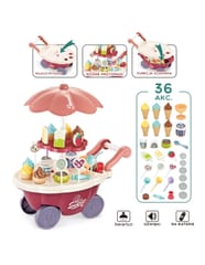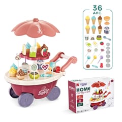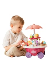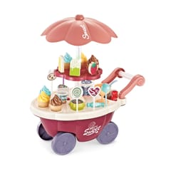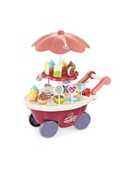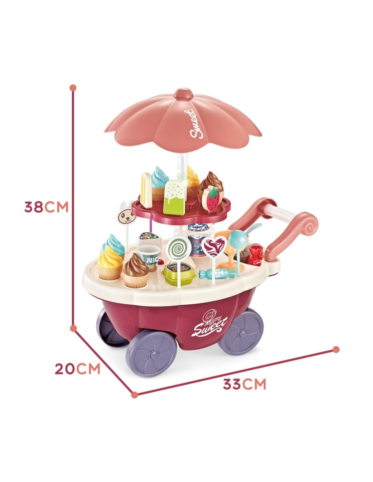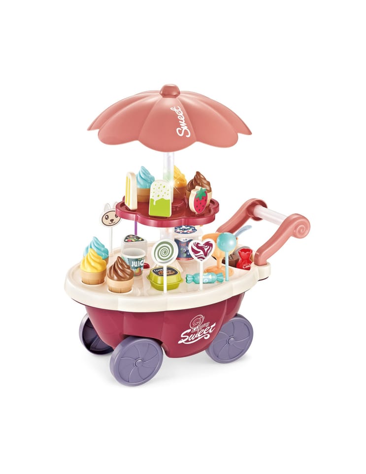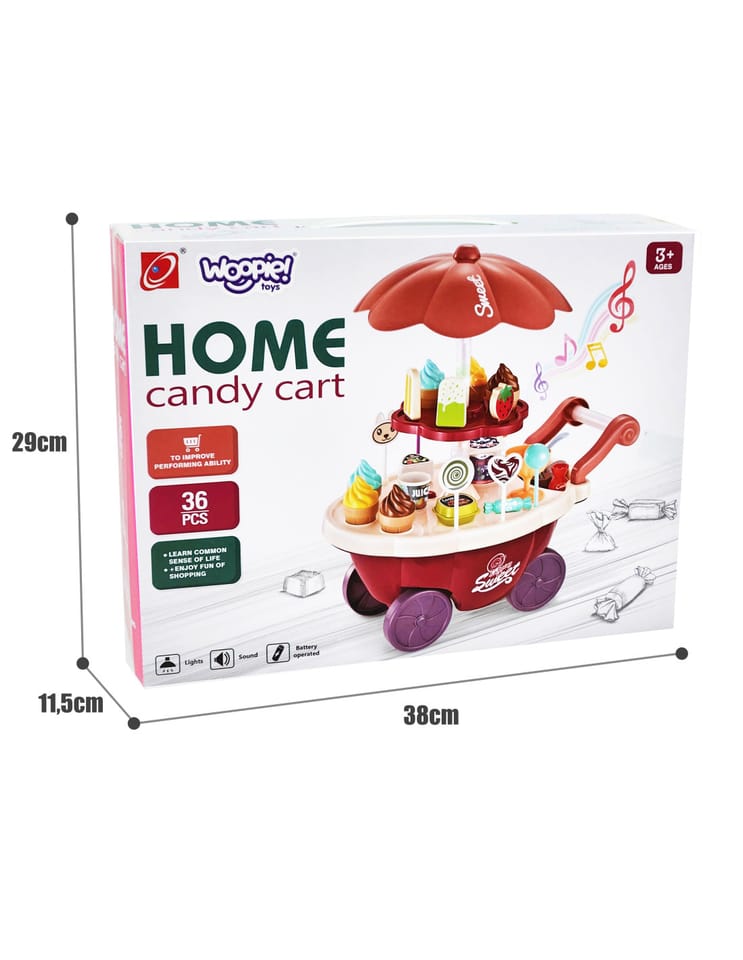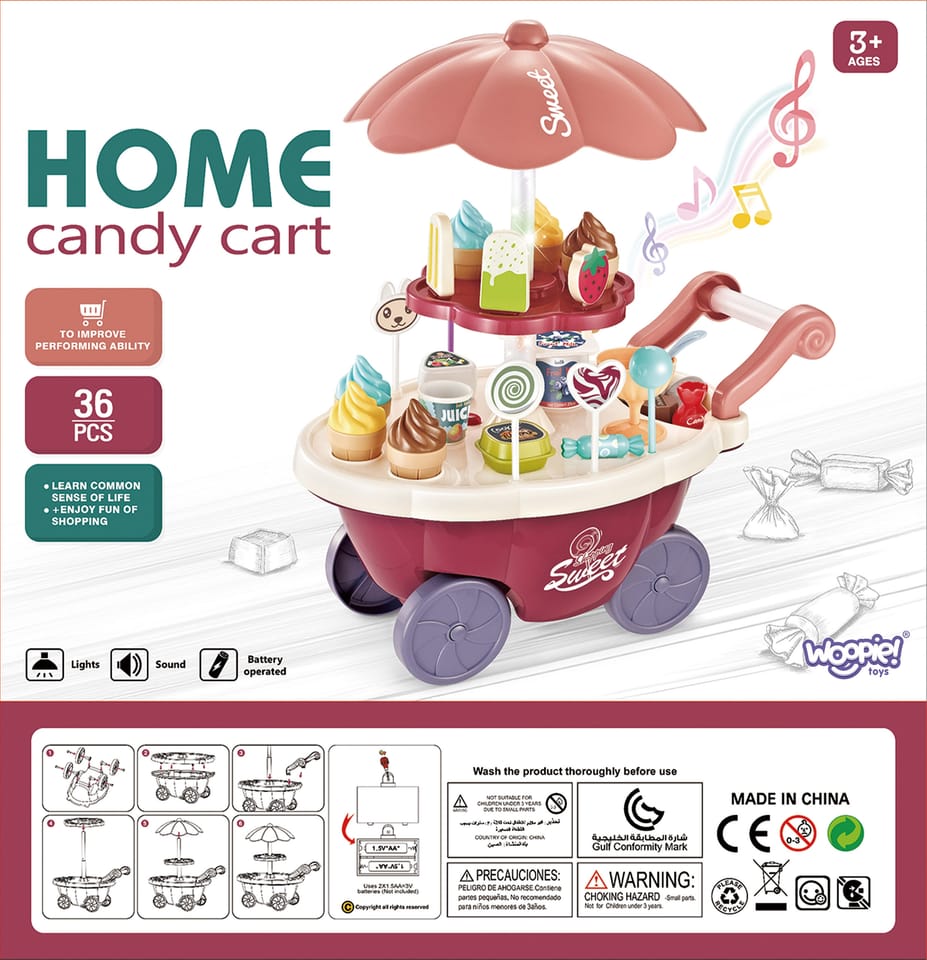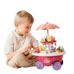 Wózek z Lodami marki Woopie będzie idealna zabawką dla Twojego maluszka i jego przyjaciół - nie tylko w upalne dni! Zabawka zapewnia kreatywną zabawę, odgrywanie ról, rozwija wyobraźnie i inne zdolności do prawidłowego rozwoju dziecka. Zabawa w "sprzedawcę" i "kupującego" pomoże rozwinąć świadomość i zdolności społeczne. Posiada wiele akcesoriów z najwyższej jakości dodatkami/naklejkami do zabawy/"sprzedaży" ze szczegółowymi modelami rożków do lodów, patyczków do lodów, lizaków lodowych, słodkich lizaków z rysunkowymi twarzami oraz innymi elementami, jak kanapki, pudełka na słodycze i przekąski, pucharki na lody, pudełko popcornów i butelka na sok. Dodatkowo niezbędnymi elementami zestawu są monety, które zachęcą dzieci do nauki podstawowych umiejętności matematycznych i finansowych podczas dokonywania zakupów. Oprócz bogatych dodatków posiada liczne specjalne funkcje: dźwiękowe (melodie włączane za pomocą guzika na blacie wózka), świetlne (kolorowy świecący trzon parasolki), w pełni obracająca się o 360 stopni parasolkę z półką, a samo stoisko po złożeniu parasolki i akcesoriów może przechowywać elementy wewnątrz wózka.