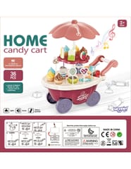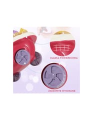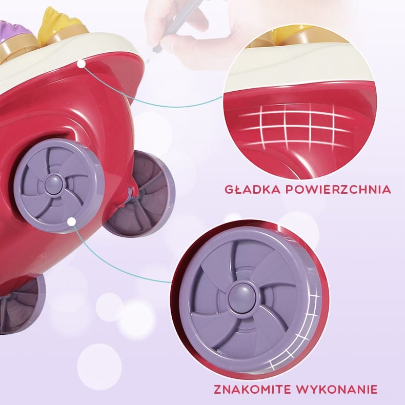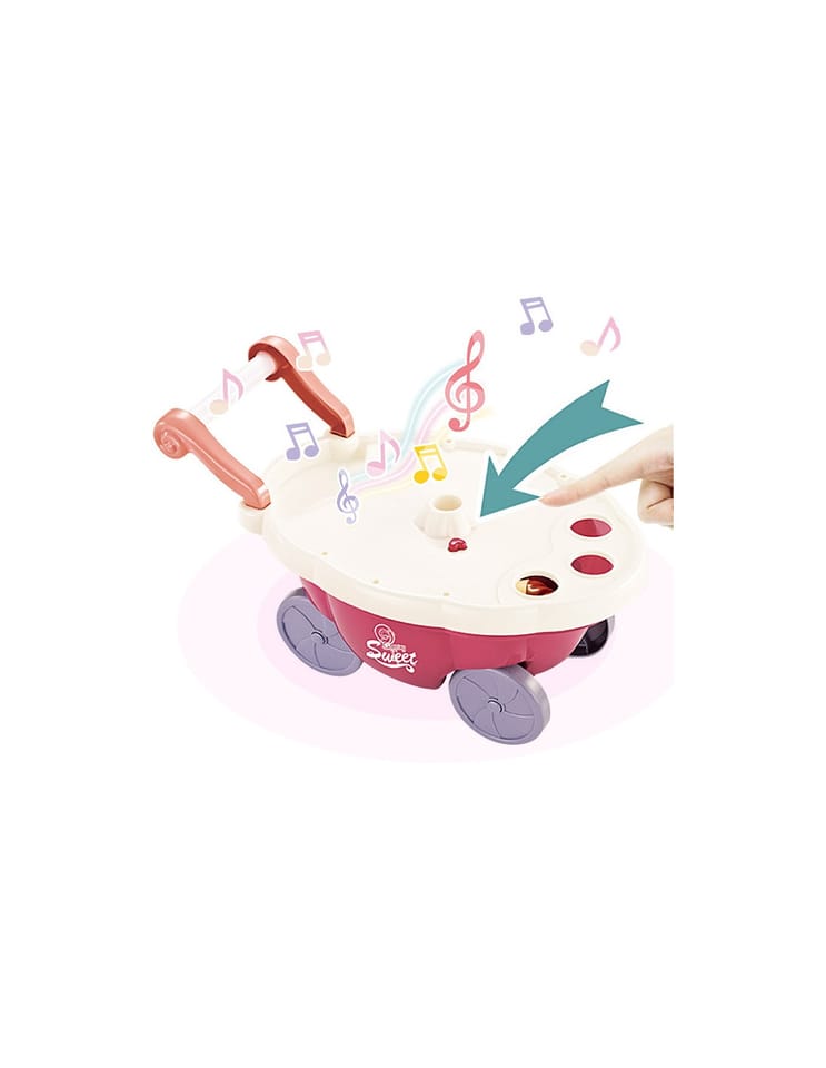 - - posiada funkcję dźwiękowe (melodie włączane za pomocą guzika na blacie wózka) oraz świetlne (kolorowy świecący trzon parasolki)
