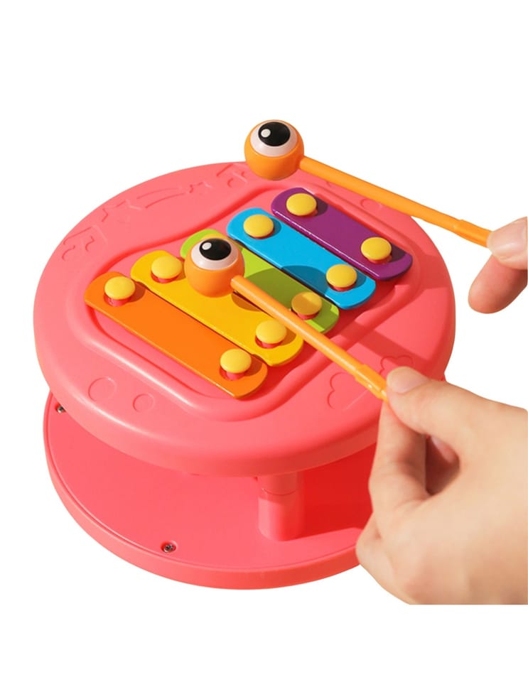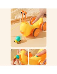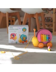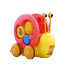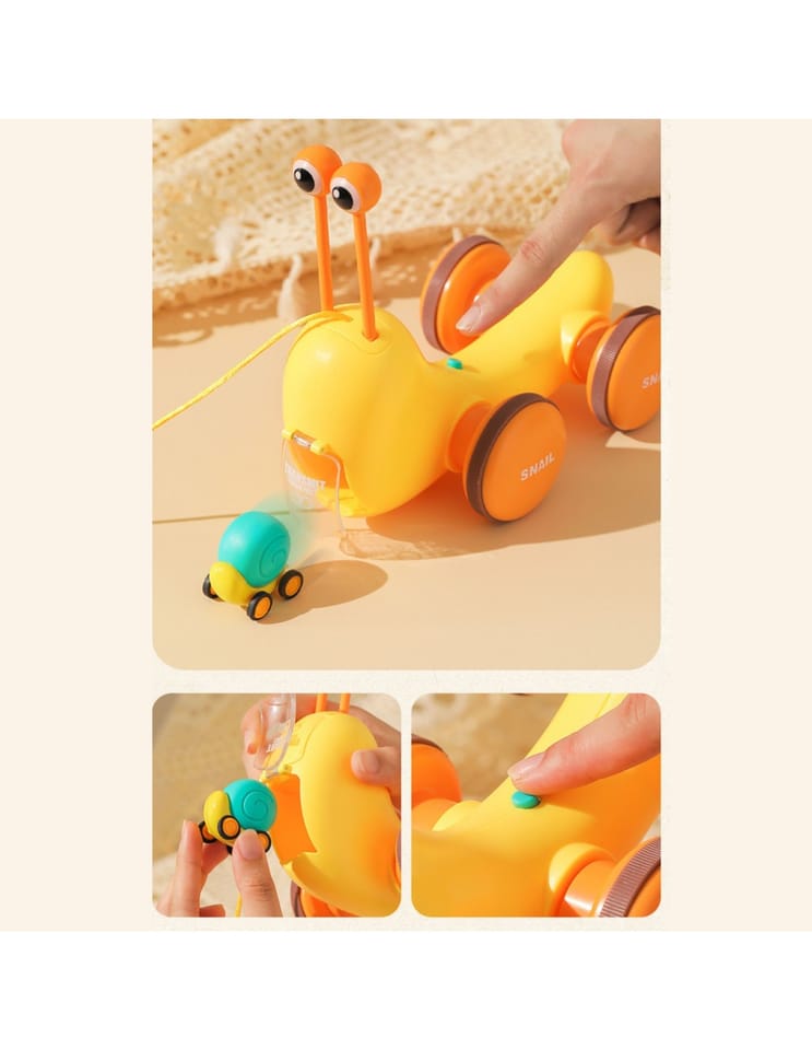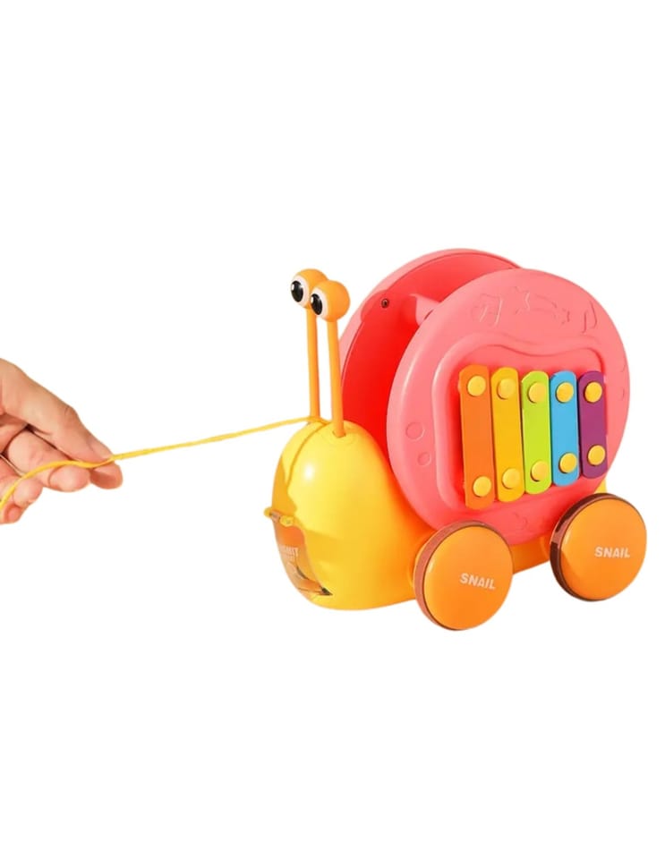 Wielofunkcyjna zabawka do pchania ślimaka od marki WOOPIE która przyciąga uwagę dzieci i stymuluje ich wyobraźnię. Jasne kolory poprawiają także ich percepcję wzrokową i zmysł estetyczny. Zabawka do ciągnięcia ślimaka zapewnia różne sposoby zabawy i nauki. Możesz uderzać w klawisze aby ćwiczyć słuch dzieci i koordynację wzrokowo-ruchową. Możesz także ciągnąć ślimaka na smyczy lub popchnąć go i pozwolić mu ślizgać się po podłodze, co zwiększa zabawę i wyzwanie.Podczas zabawy dzieci poznają zwierzęta, muzykę oraz związki przyczynowo-skutkowe. Zachęcaj do obserwacji, umiejętności logicznego myślenia i koordynacji fizycznej, podczas gdy dziecko będzie mogło cieszyć się godzinami kreatywnej zabawy. Zabawka do ciągnięcia ślimaka to świetny sposób na dzielenie się szczęśliwym czasem z dziećmi. Mamy mogą bawić się ze swoimi pociechami i patrzeć, jak chichoczą, gdy ślimak się porusza. Ta zabawka nadaje się do interakcji rodzinnych i może wzmacniać wzajemne uczucia. Zabawka składa się z dwóch części: muszli ślimaka- która zawiera cymbałki, oraz pałeczki do nich w kształcie oczu ( umieszczone są w środku muszli). Druga część to wyrzutnia małego autka z ciała ślimaka- na grzbiecie zabawki umieszczony jest przycisk, który otwiera wyrzutnię dla autka.