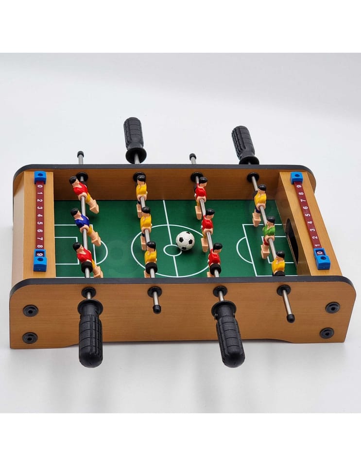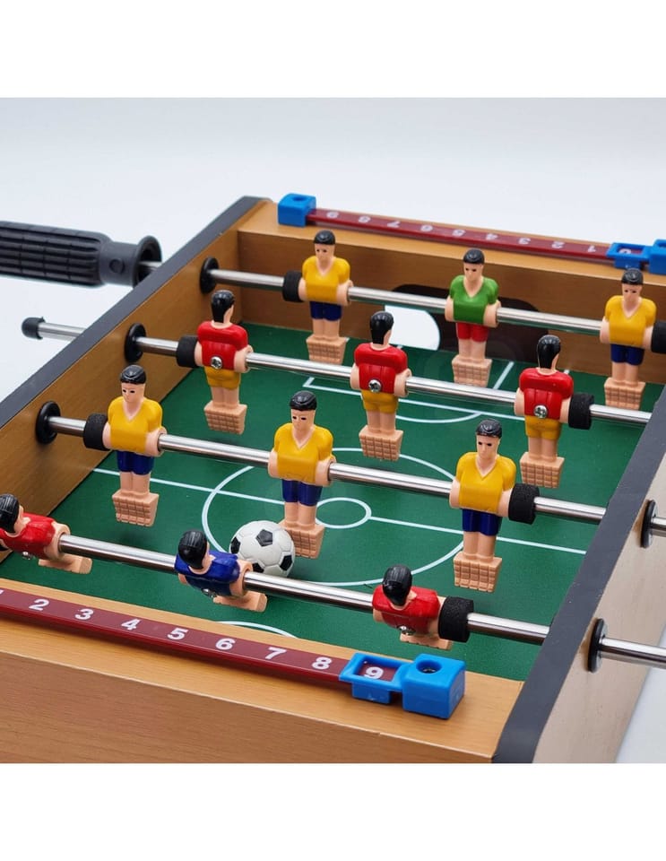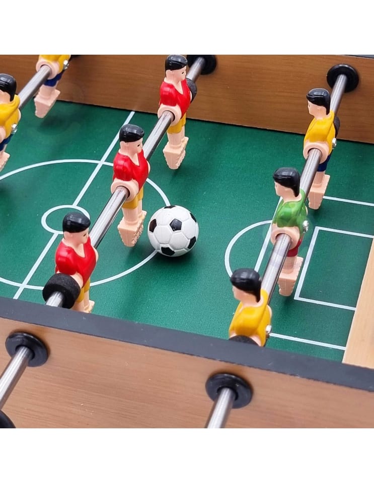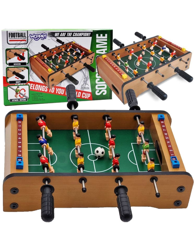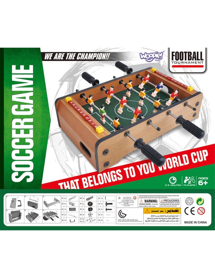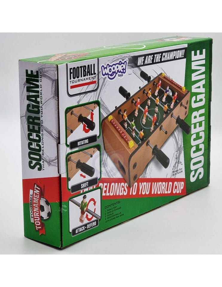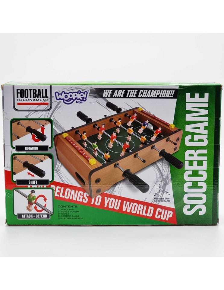 Stół do gry w piłkarzyki firmy Woopie sprawi że Twój maluch będzie miał zajęcie na długie godziny. Gra przeznaczona dla dwóch osób. Na każdej prowadnicy mamy ustawionych po 3 piłkarzy którzy dzielnie grają na boisku. Całość zapakowana w bardzo ładne i schludne opakowanie. Wygodny uchwyt-rączka pozwala na wygodne przenoszenie pudełka z jego zawartością. Całość przeznaczona dla dzieci od lat 6.