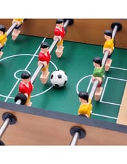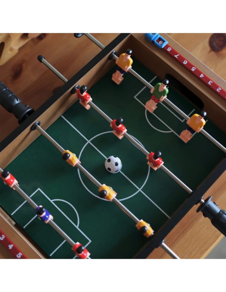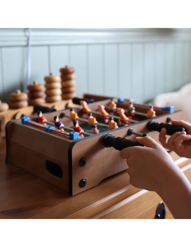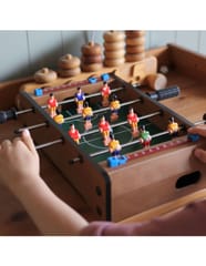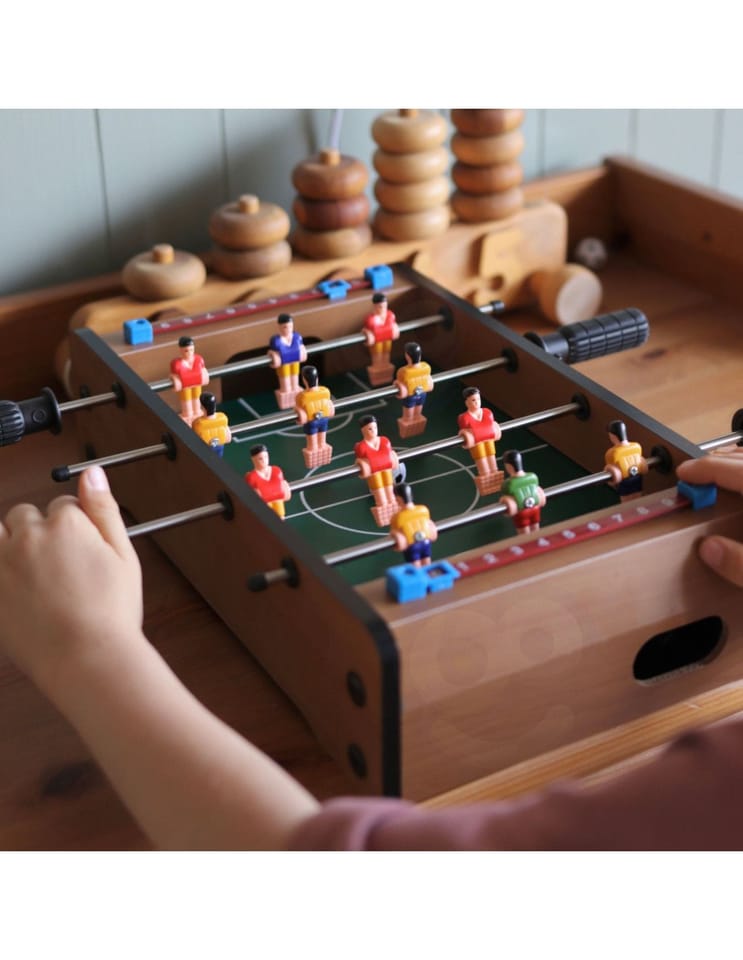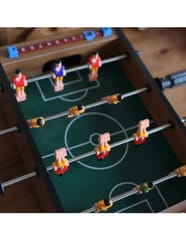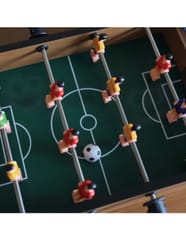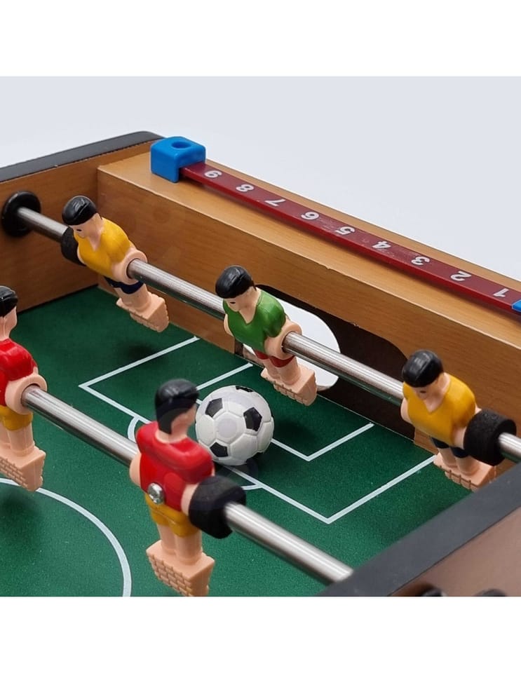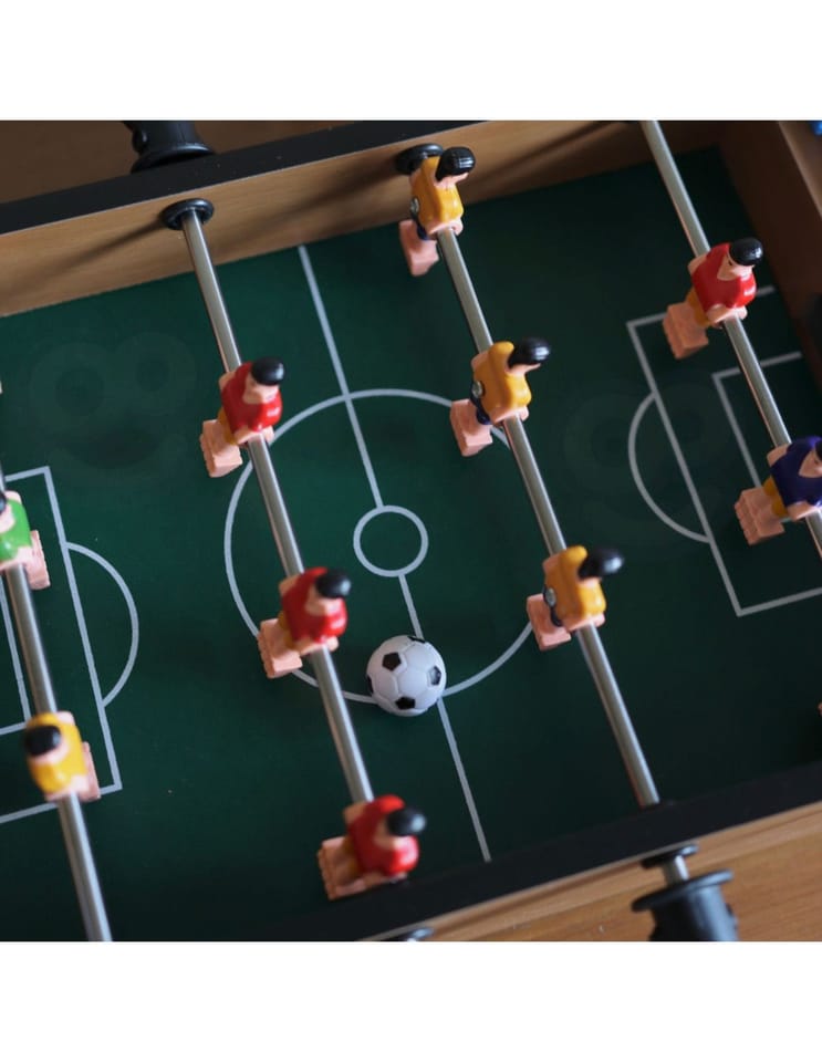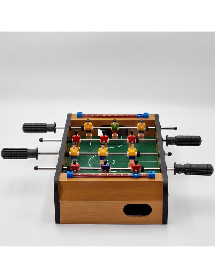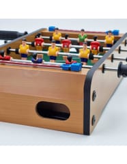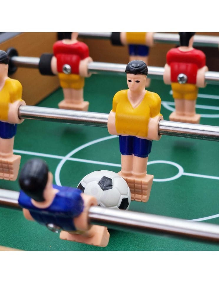 Stół do gry w piłkarzyki firmy Woopie sprawi że Twój maluch będzie miał zajęcie na długie godziny. Gra przeznaczona dla dwóch osób. Na każdej prowadnicy mamy ustawionych po 3 piłkarzy którzy dzielnie grają na boisku. Całość zapakowana w bardzo ładne i schludne opakowanie. Wygodny uchwyt-rączka pozwala na wygodne przenoszenie pudełka z jego zawartością. Całość przeznaczona dla dzieci od lat 6.