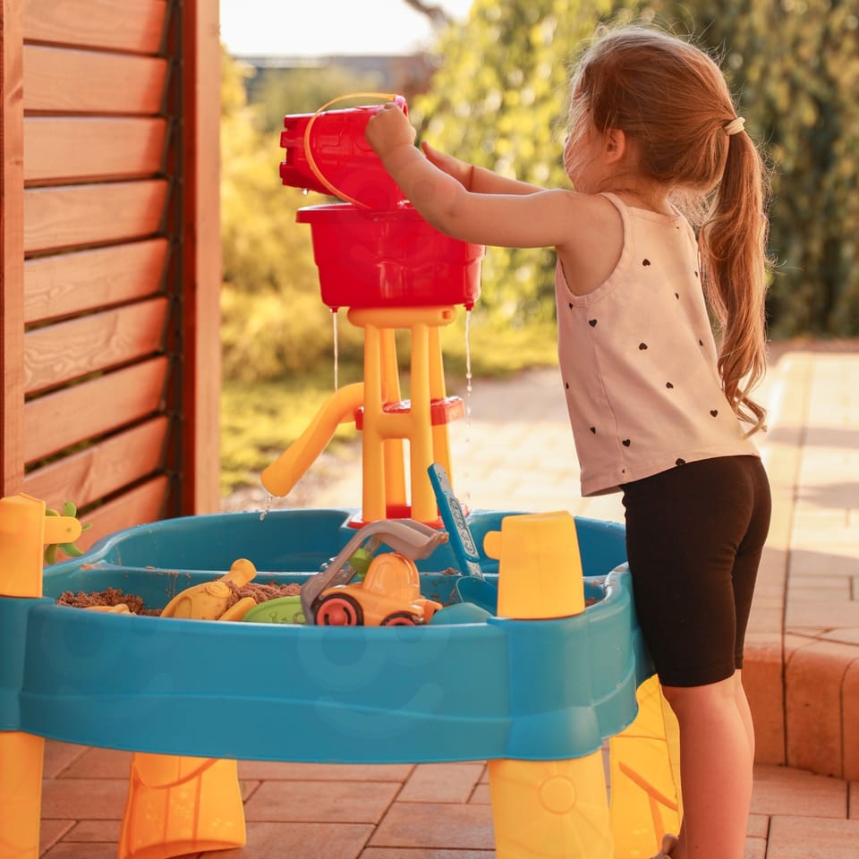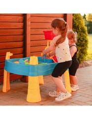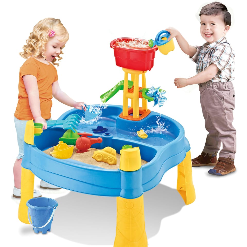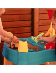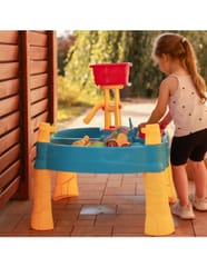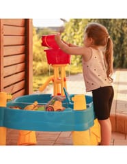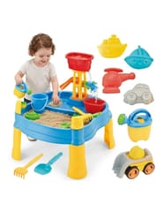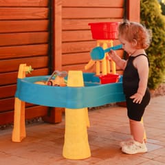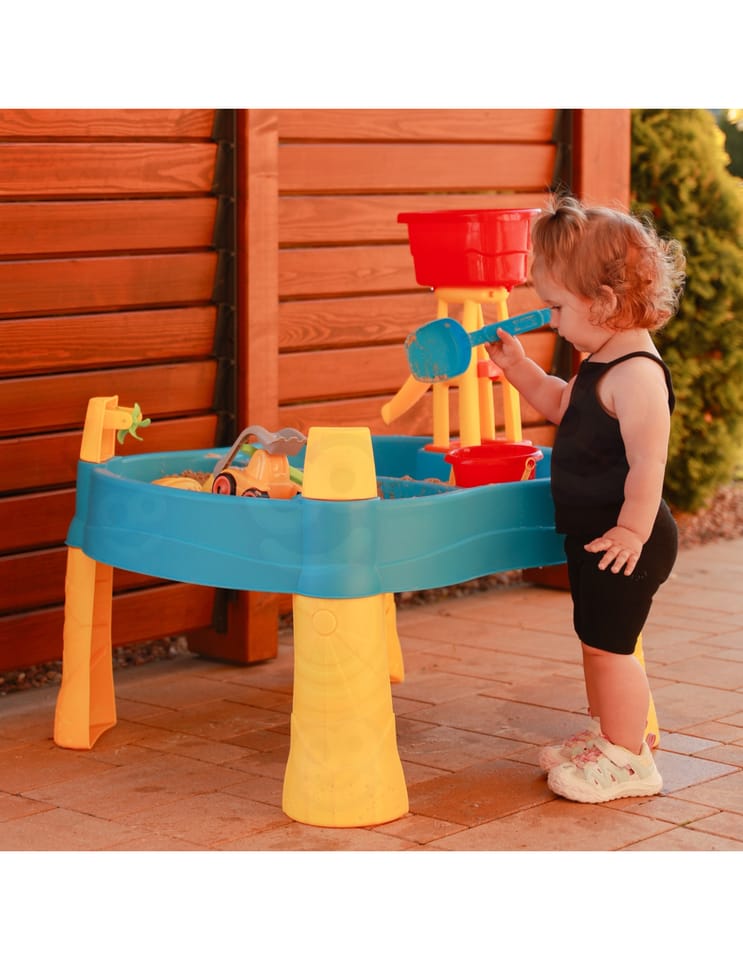 Stół Wodny 2w1 Piaskownica od marki WOOPIE jest idealną zabawka do zabawy z wodą i piaskiem. Zestaw zawiera 14 akcesoriów: 4 foremki, konewkę, młynek, łopatkę, grabki, samochodzik i 2 statki. Stolik posiada 2 wgłębienia, które jedno wypełnij wodą, a drugie piaskiem, co pozwala na zabawę wszędzie. Dziecko może wlewać wodę do młynka i patrzeć jak woda spływa. Zestaw jest przeznaczony do zabawy w domu, jak i na zewnątrz. Idealne do zabawy w domu i na plaży lub w piaskownicy.
