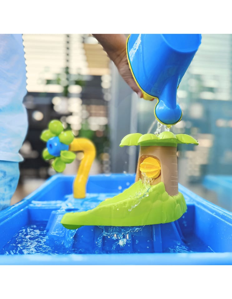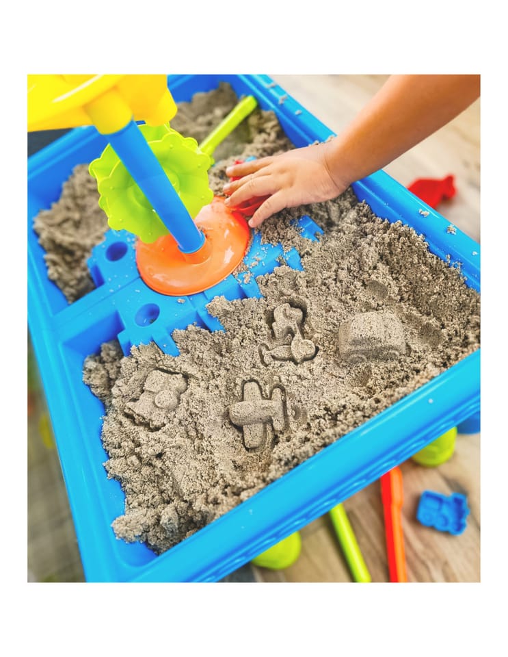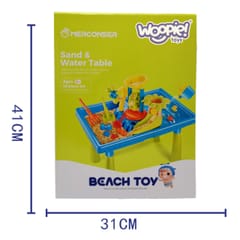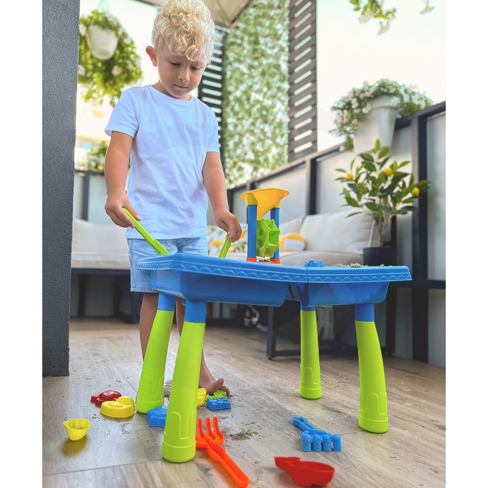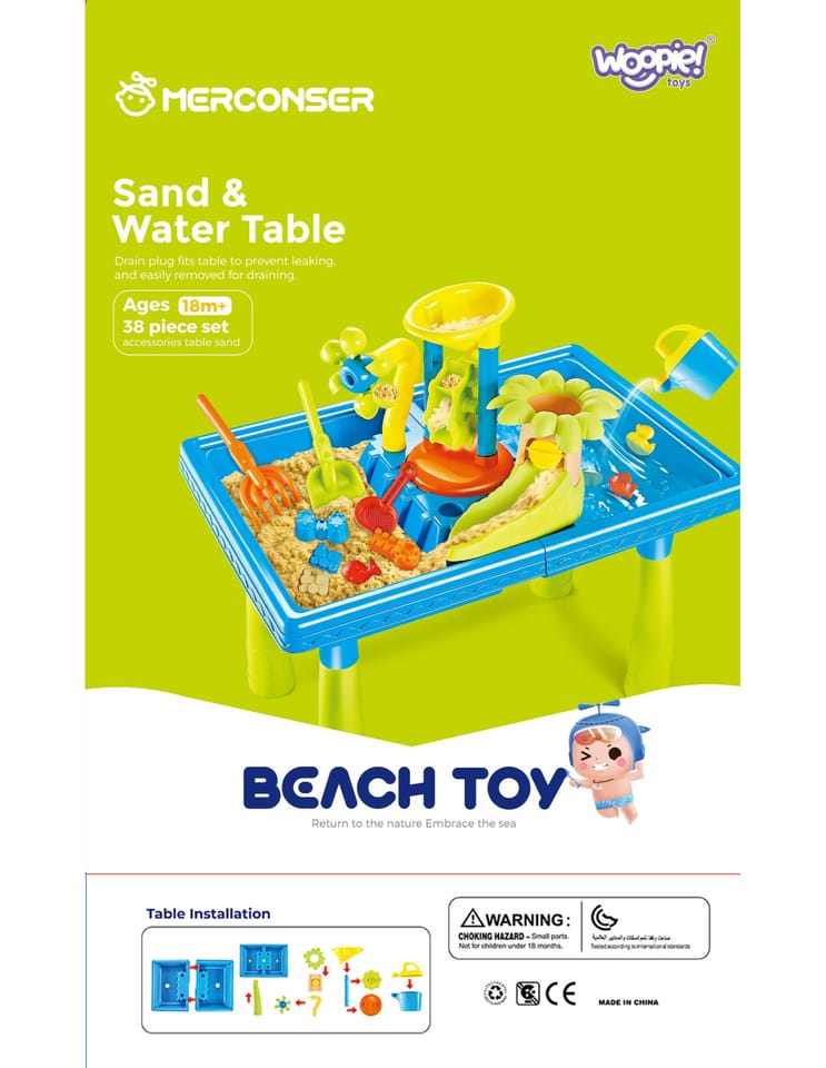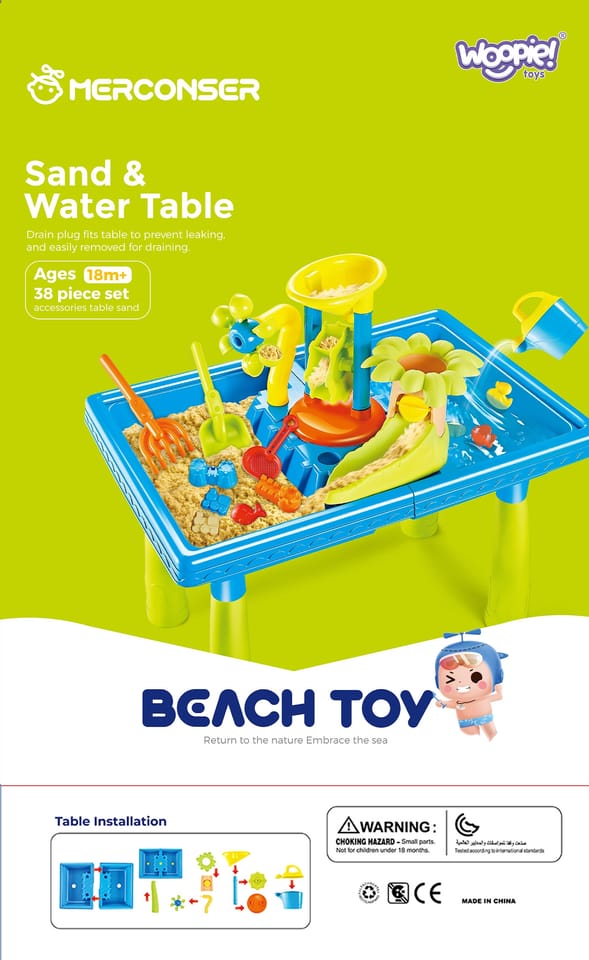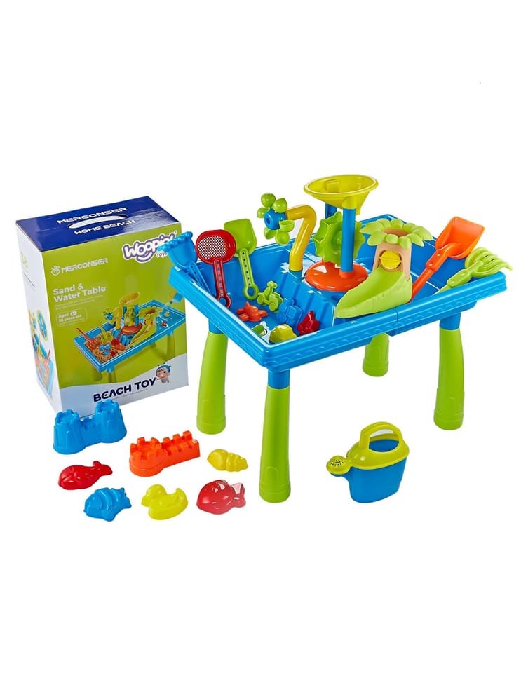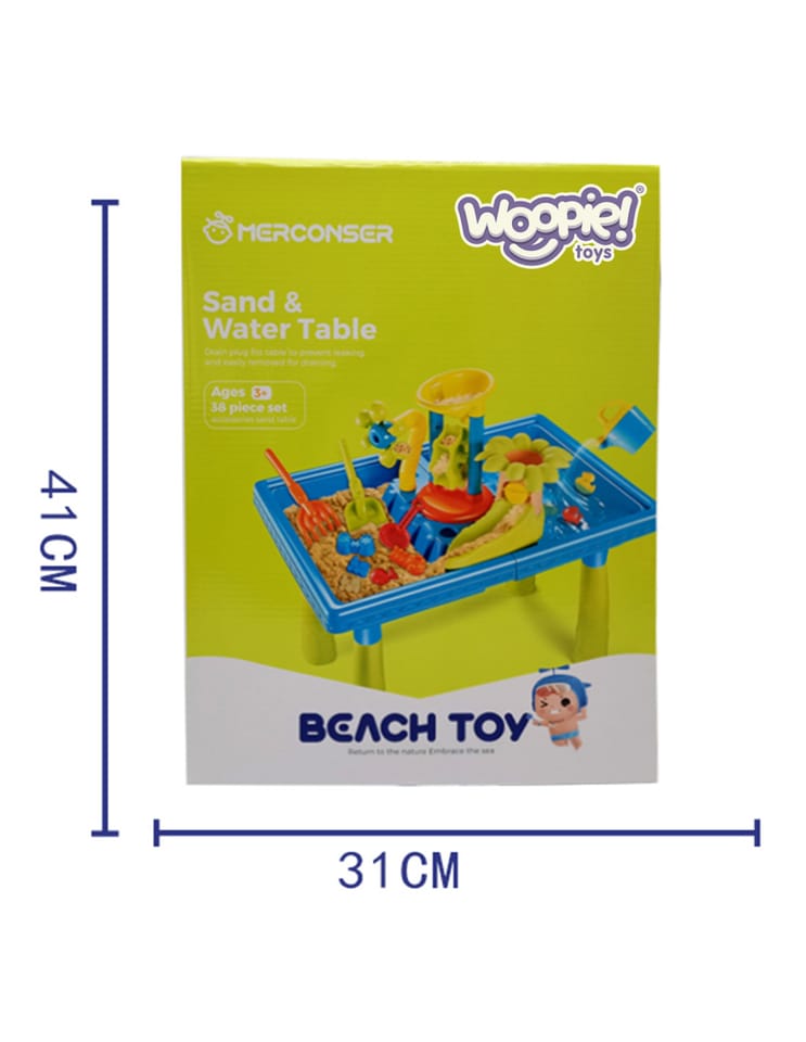 Stół Wodny 2w1 Piaskownica od marki WOOPIE jest idealna do zabawy z wodą i piaskiem. Zestaw zawiera 18 akcesoriów: foremki, konewkę, młynek, łopatki, sitko i wiele więcej. Stolik posiada 2 wgłębienia, jedno wypełnij wodą, a drugie piaskiem. Dziecko może wlewać wodę do młynka i obserwować jak woda wpędza w ruch wirnik. Idealne do zabawy w domu i na plaży lub piaskownicy.Charakterystyka: