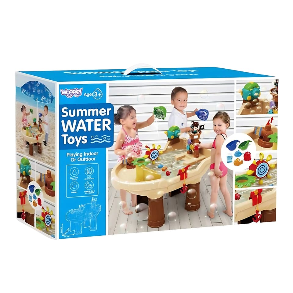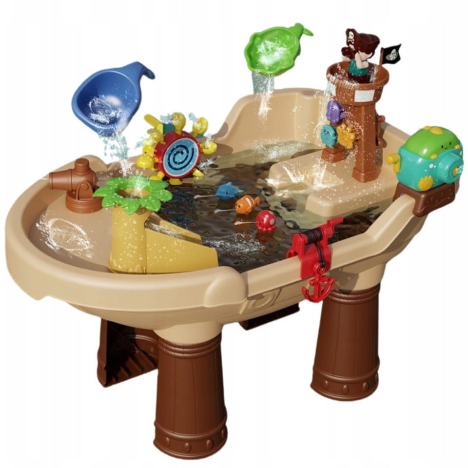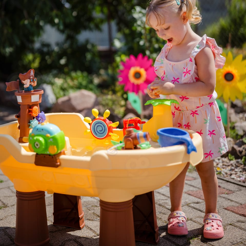 Stolik Wodny Piracka Łódź marki Woopie to niezwykła zabawka, która przenosi dzieci w świat pirackich przygód i zapewnia godziny kreatywnej zabawy na świeżym powietrzu. Dzięki bogatemu zestawowi kolorowych akcesoriów, ruchomym elementom i pirackiej wieży maluchy mogą eksperymentować z wodą, bawić się bąbelkami, kręcić kołem wodnym i odkrywać mnóstwo możliwości zabawy. Prosta, solidna konstrukcja oraz duże rozmiary sprawiają, że stolik jest wygodny i atrakcyjny nawet dla kilku dzieci jednocześnie.