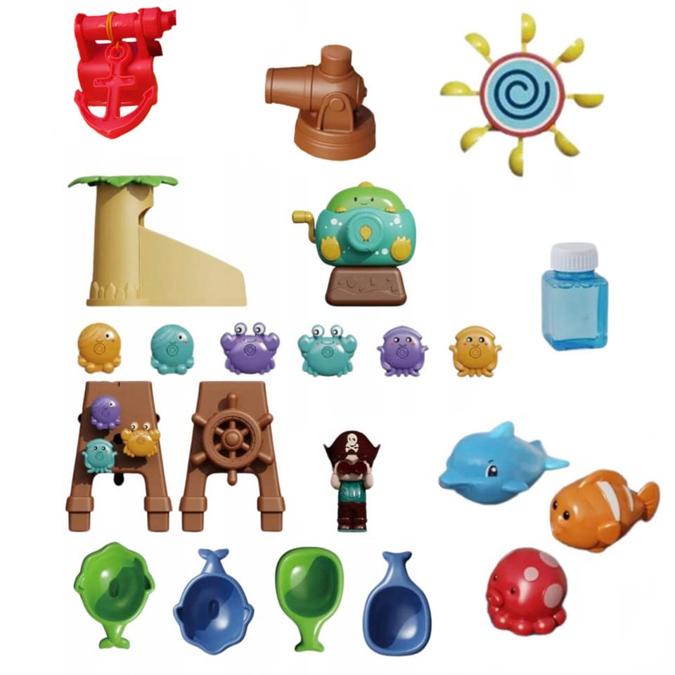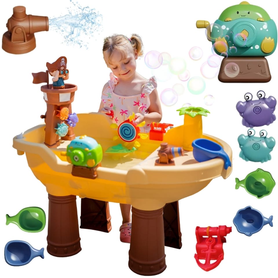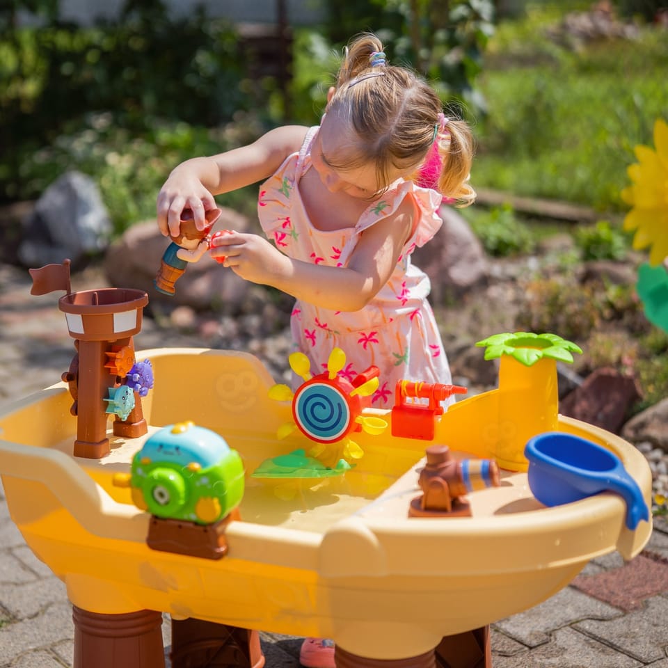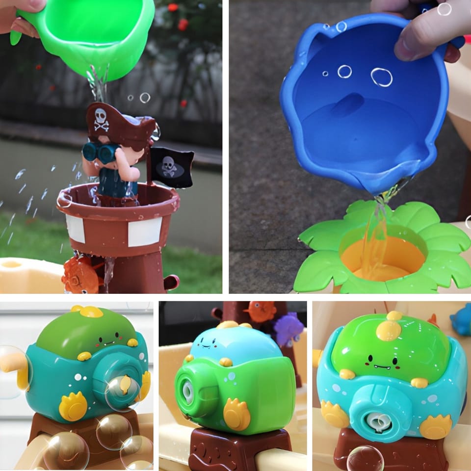 Stolik Wodny Piracka Łódź marki Woopie to niezwykła zabawka, która przenosi dzieci w świat pirackich przygód i zapewnia godziny kreatywnej zabawy na świeżym powietrzu. Dzięki bogatemu zestawowi kolorowych akcesoriów, ruchomym elementom i pirackiej wieży maluchy mogą eksperymentować z wodą, bawić się bąbelkami, kręcić kołem wodnym i odkrywać mnóstwo możliwości zabawy. Prosta, solidna konstrukcja oraz duże rozmiary sprawiają, że stolik jest wygodny i atrakcyjny nawet dla kilku dzieci jednocześnie.