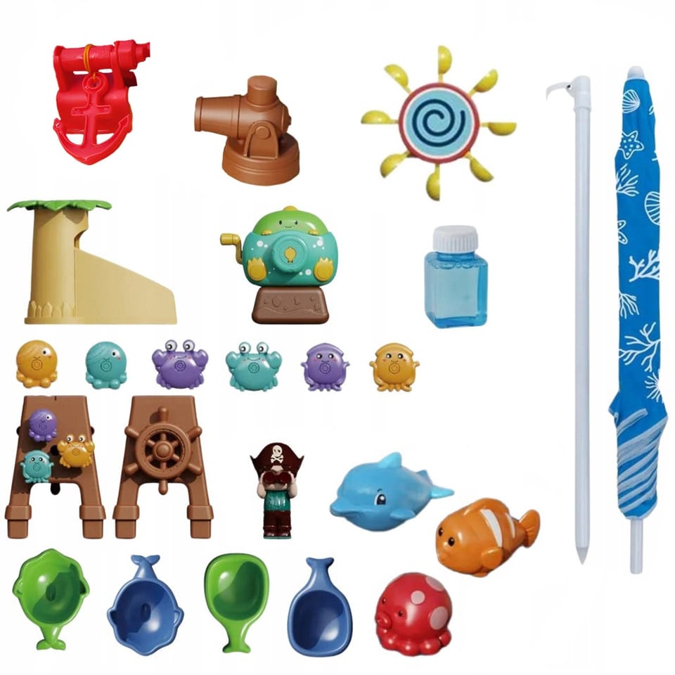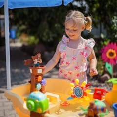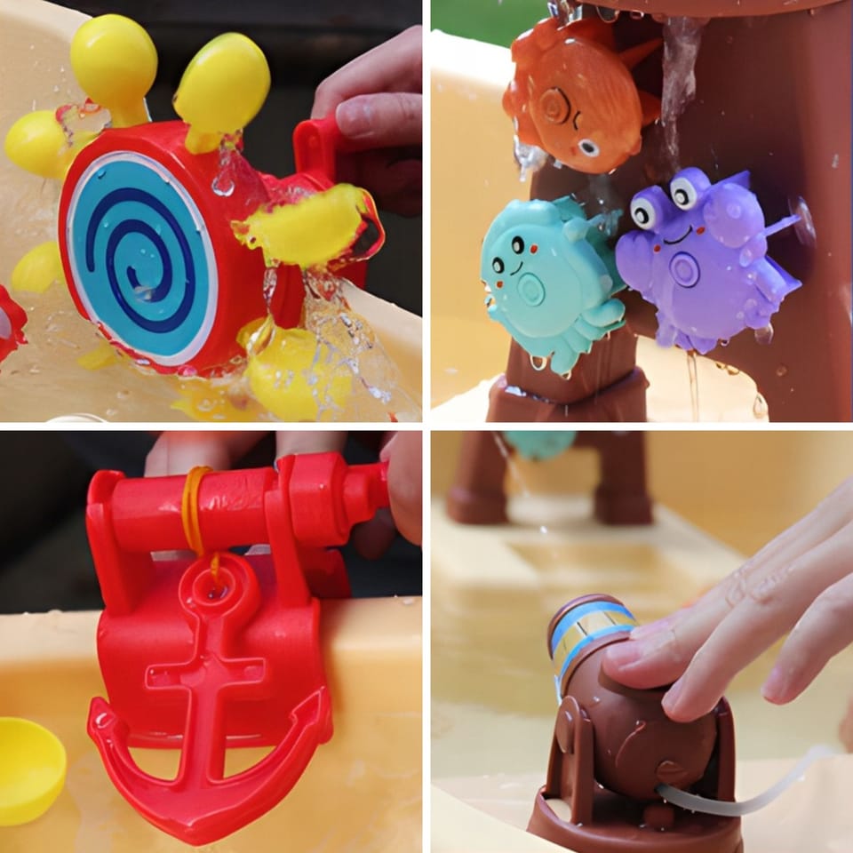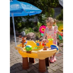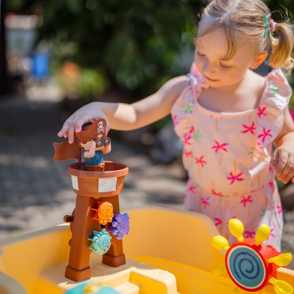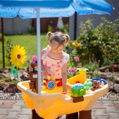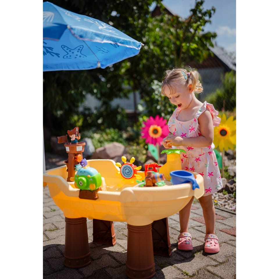 Stolik Wodny Piracka Łódź marki Woopie to niezwykła zabawka, która przenosi dzieci w świat pirackich przygód i zapewnia godziny kreatywnej zabawy na świeżym powietrzu. Dzięki bogatemu zestawowi kolorowych akcesoriów, ruchomym elementom i pirackiej wieży maluchy mogą eksperymentować z wodą, bawić się bąbelkami, kręcić kołem wodnym i odkrywać mnóstwo możliwości zabawy. Dołączony parasol pozwoli na komfortową zabawę w nawet najgorętsze dni. Prosta, solidna konstrukcja oraz duże rozmiary sprawiają, że stolik jest wygodny i atrakcyjny nawet dla kilku dzieci jednocześnie.