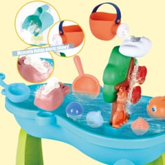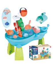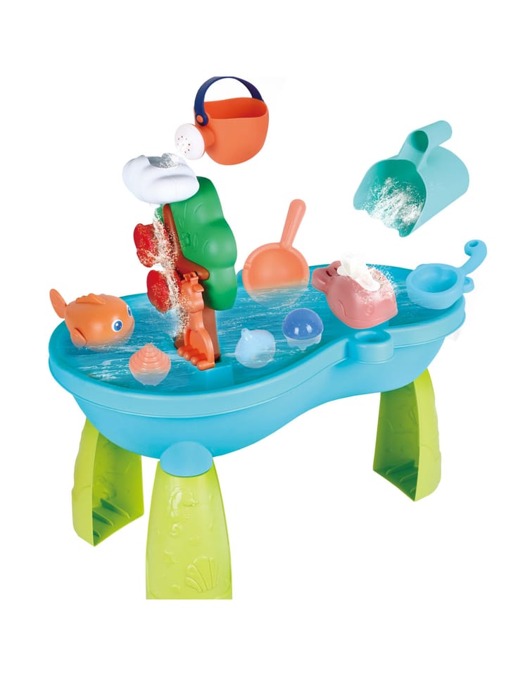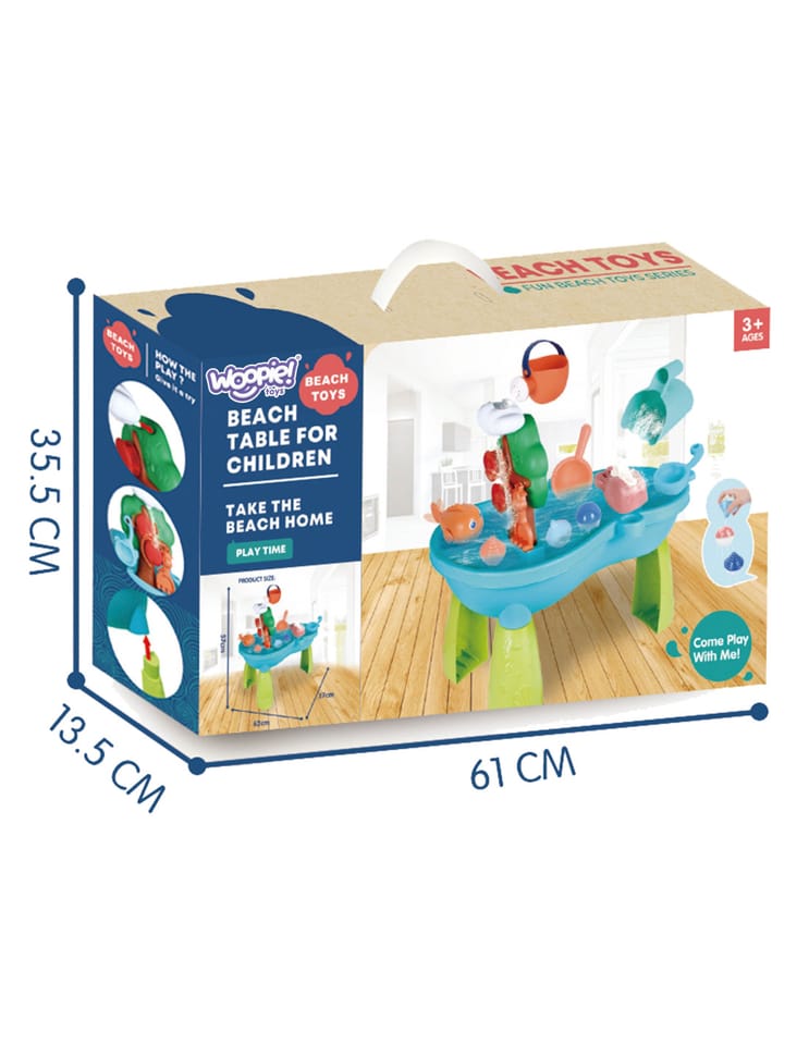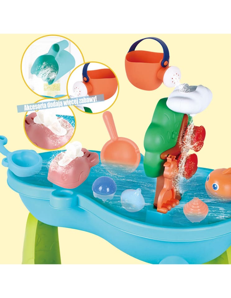 Stół Wodny 2w1 Piaskownica od marki WOOPIE jest idealną zabawka do zabawy z wodą i piaskiem. Zestaw zawiera akcesoria takie jak: rybki, konewkę, wiaderko, pływaki i wiele innych. Stolik posiada kołowrotek, który się obraca podczas polewania go wodą. Zestaw jest przeznaczony do zabawy w domu, jak i na zewnątrz.
