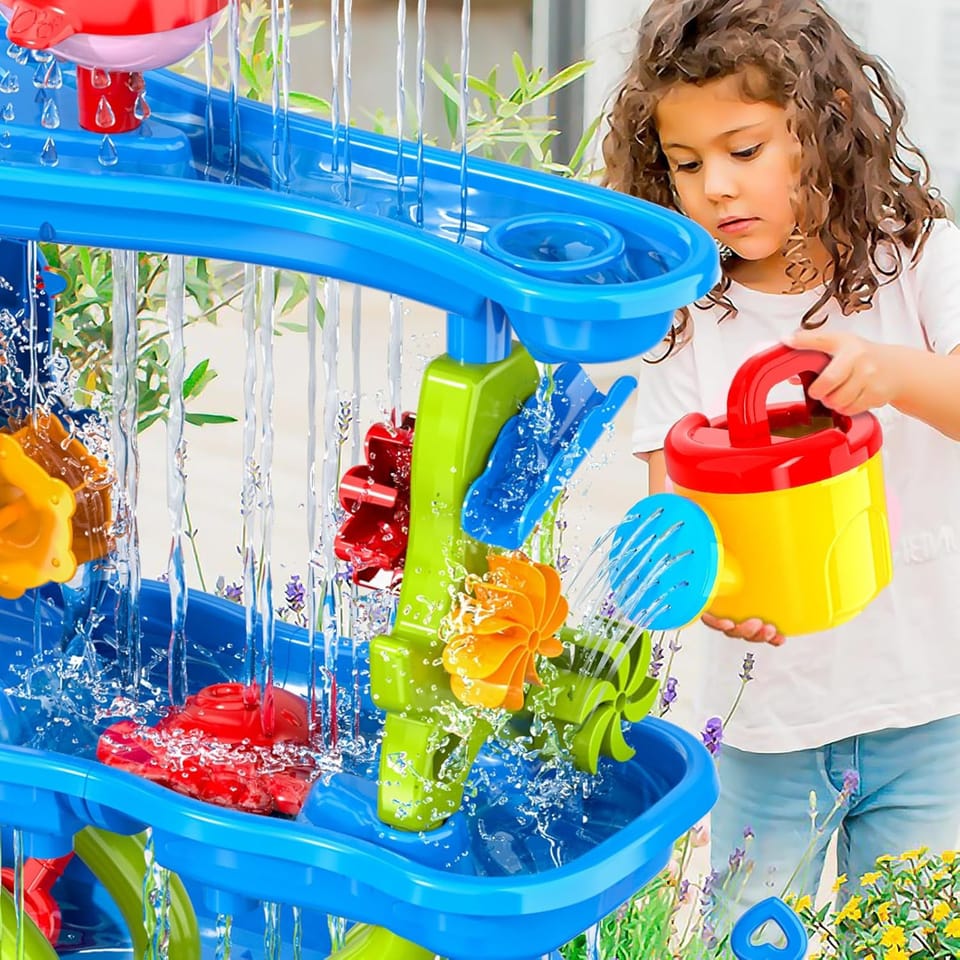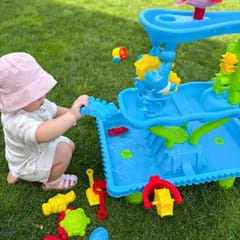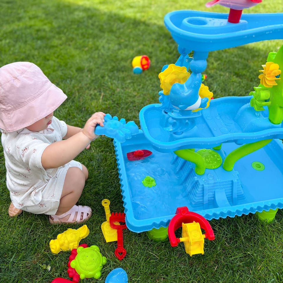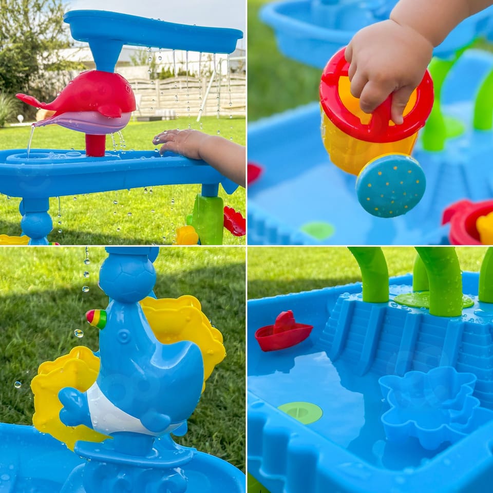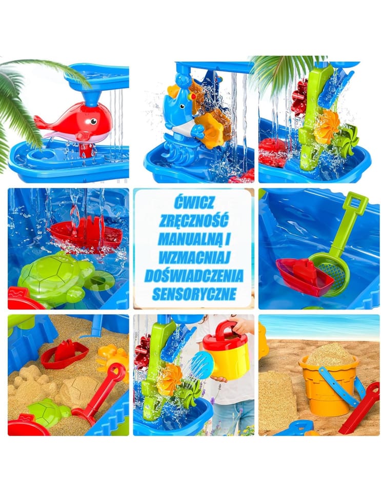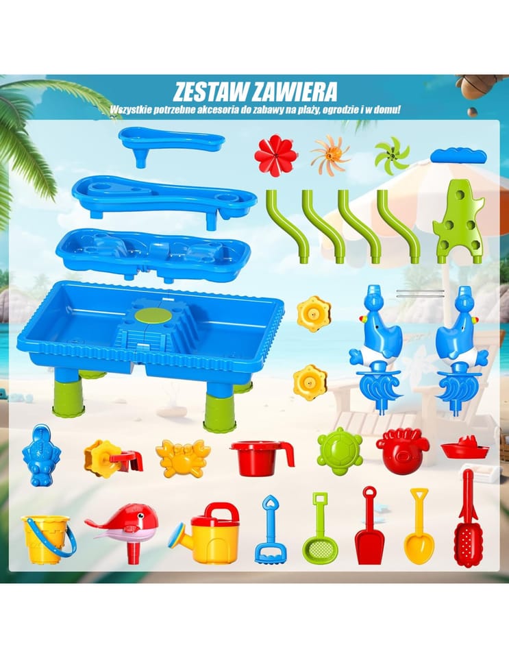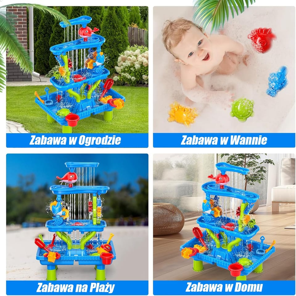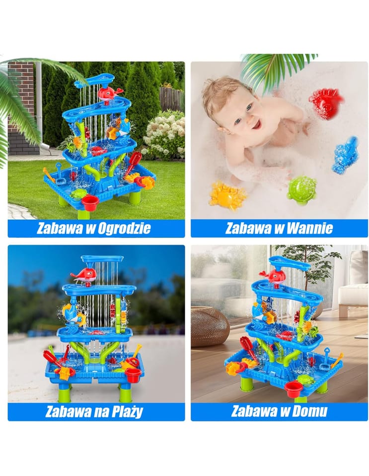 - - Wielofunkcyjność 4w1: Stolik wodny, piaskownica, zestaw plażowy i zabawka do kąpieli