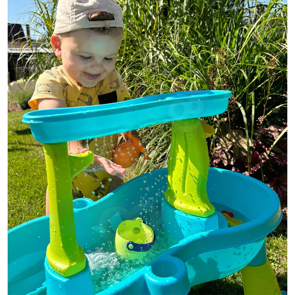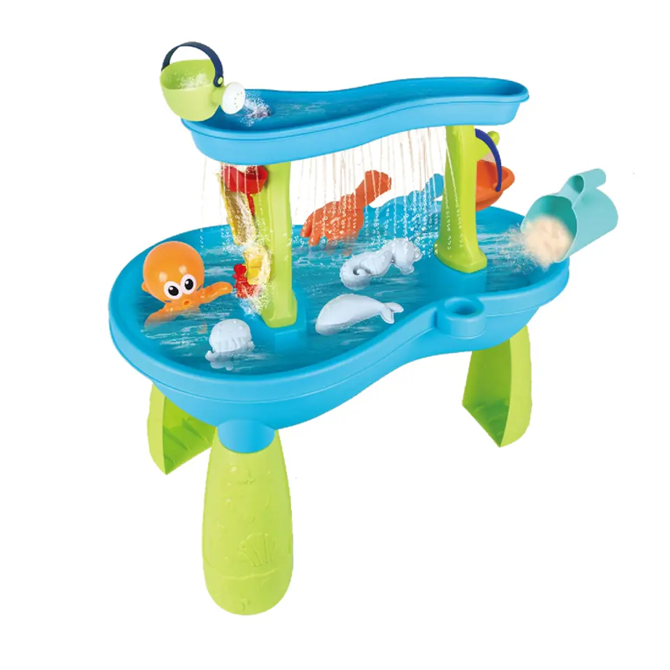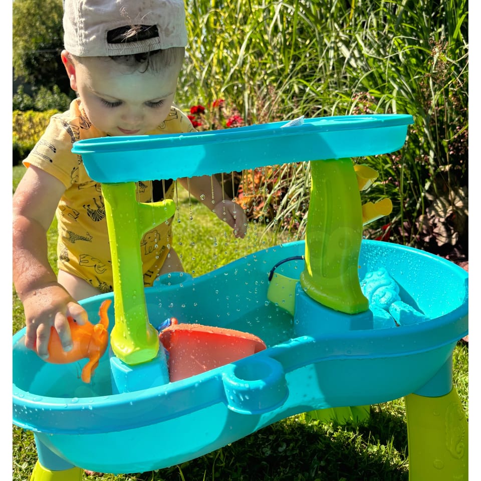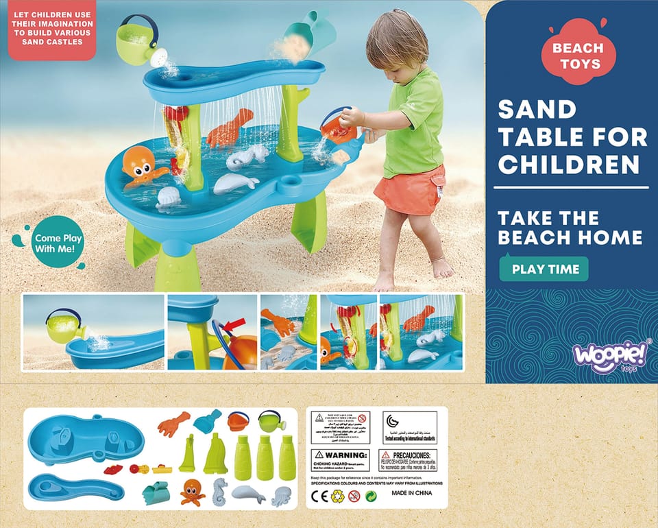 Stół Wodny Ośmiornica od marki WOOPIE jest idealną zabawka do zabawy z wodą i piaskiem. Zestaw zawiera 18 akcesoriów: 3 foremki, ośmiornicę, konewkę, koszyk, pojemnik do nabierania piasku i 2 łopatki. Dziecko może wlewać wodę do górnej części stołu, aby woda uciekała przez dziurki w dnie lub ściekała po wodnych młynkach. Zestaw jest przeznaczony do zabawy w domu, jak i na zewnątrz. Idealne do zabawy w domu i na plaży lub piaskownicy.