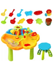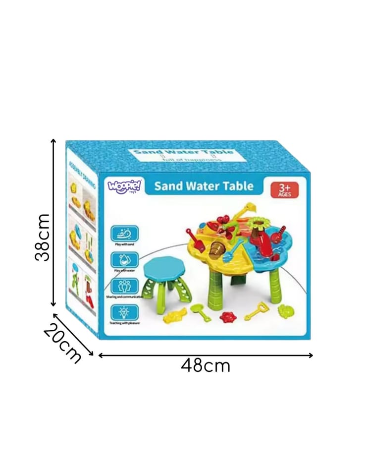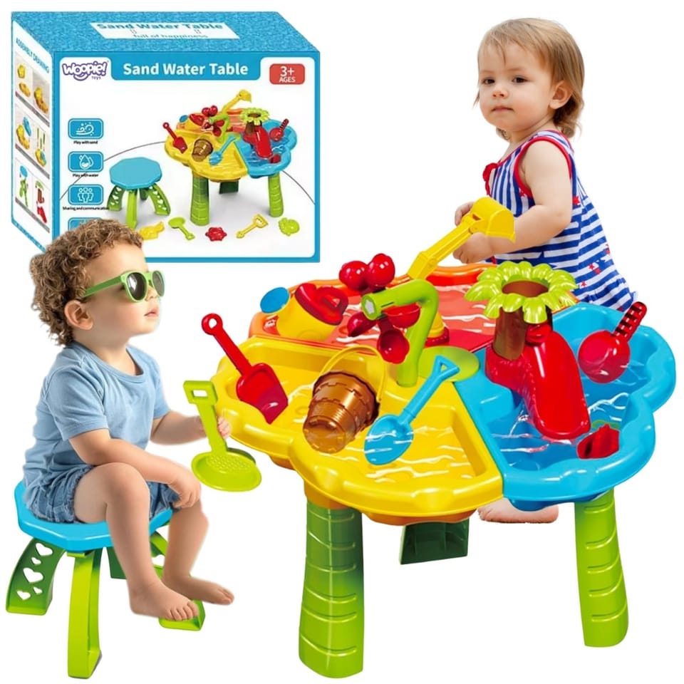 Stolik Wodny 2w1 z krzesełkiem od marki Woopie to wszechstronny zestaw do zabawy wodą i piaskiem, który został zaprojektowany z myślą o potrzebach najmłodszych odkrywców. Idealnie sprawdzi się zarówno w domu, na balkonie, tarasie, jak i w ogrodzie czy na plaży. Zabawka rozwija kreatywność, wyobraźnię i zdolności manualne, zapewniając godziny pełne uśmiechu i nauki. Dzięki bogatemu wyposażeniu oraz solidnemu wykonaniu, ten kolorowy zestaw sprawdzi się zarówno w ogrodzie, jak i w pokoju dziecięcym. Wykonana z bezpiecznego, wytrzymałego i łatwego do utrzymania w czystości tworzywa, pozbawionego ostrych krawędzi jest całkowicie bezpieczna dla maluchów. Trójdzielna konstrukcja stolika pozwala dzieciom jednocześnie eksperymentować z różnymi strukturami i materiałami – piaskiem, wodą i akcesoriami z zestawu. Każdy z elementów zestawu został zaprojektowany tak, by pobudzać dziecięcą wyobraźnię – znajdziemy tu minikoparkę, lejek-drzewko, wiatraczek wodny, foremki do piasku, stateczek, łopatki i wiele innych kolorowych akcesoriów. Dzięki temu dziecko może odgrywać scenki, tworzyć piaskowe kształty, przelewać wodę, budować i eksperymentować – ucząc się przez zabawę. W zestawie znajduje się również kolorowe i ergonomiczne krzesełko, które zapewnia wygodę podczas zabawy. Całość jest łatwa do złożenia i rozłożenia, co czyni ją doskonałym rozwiązaniem zarówno na co dzień, jak i w podróży. Zabawka nie wymaga użycia narzędzi – wszystko łączy się intuicyjnie i stabilnie. Stolik to nie tylko miejsce do zabawy, ale także narzędzie do nauki – wspiera rozwój motoryki, koordynacji wzrokowo-ruchowej, zdolności manualnych, logicznego myślenia, a także komunikacji i umiejętności społecznych, szczególnie podczas zabawy z rówieśnikami. To idealna zabawka na wspólne, radosne chwile, które jednocześnie rozwijają i uczą.