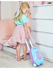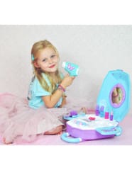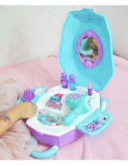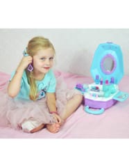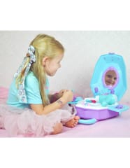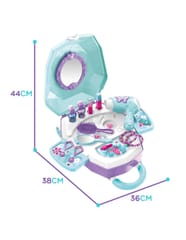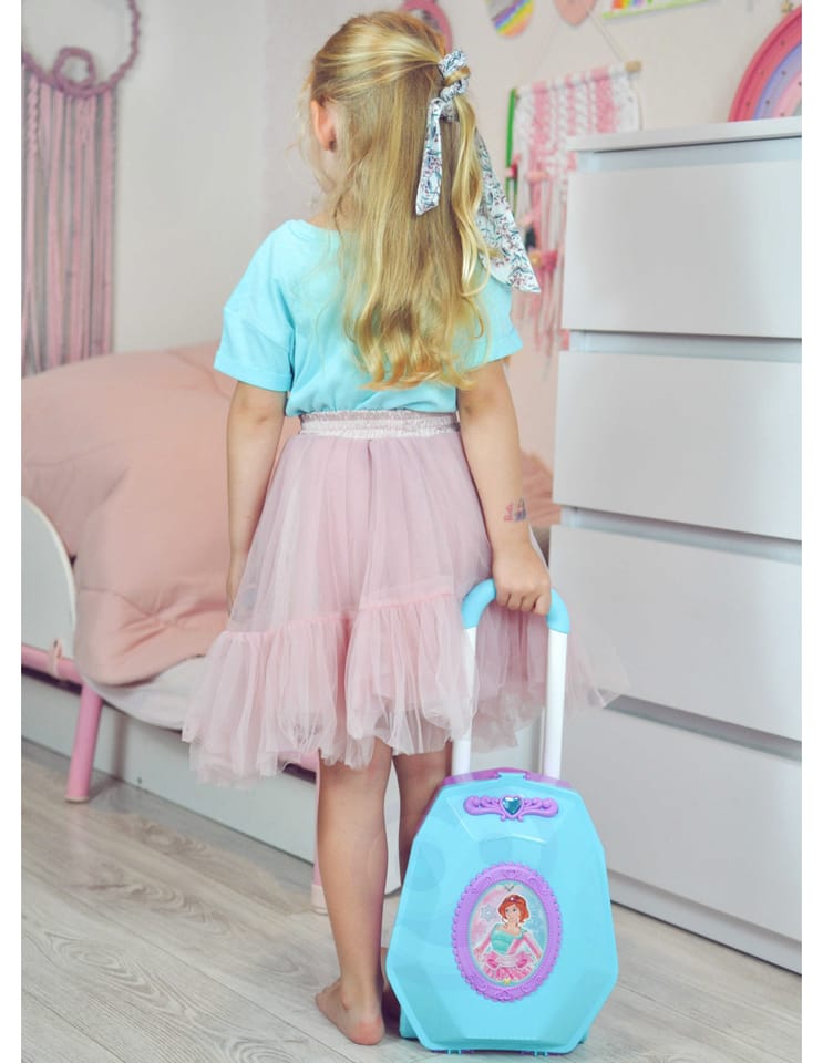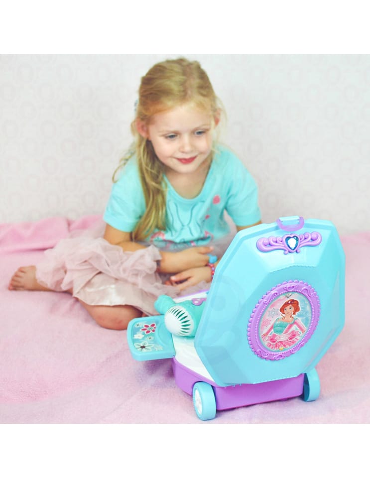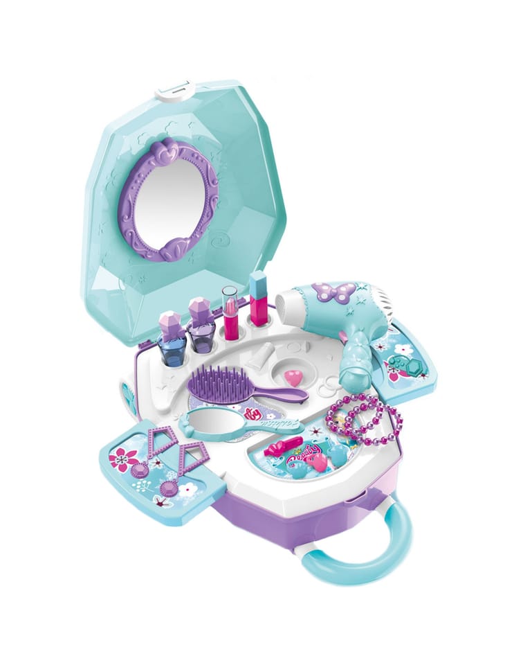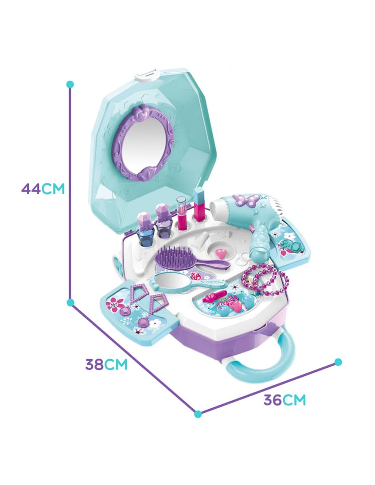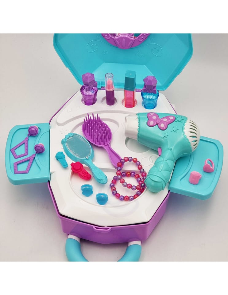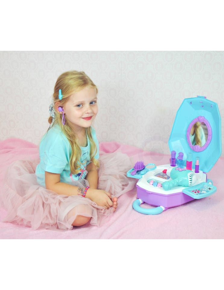 Toaletka dla Dziewczynki 2w1 Salon Piękności w Walizce od marki WOOPIE to idealna propozycja dla wszystkich małych księżniczek. Dzięki temu zestawowi dziecko może poczuć się jak prawdziwa księżniczka oraz posiada wszystko, aby przygotować się na wielki bal lub wyjście z przyjaciółmi. Wewnątrz walizki znajduje się lusterko i rozkładany blat toaletki. Zestaw oprócz akcesoriów jak lusterko, spinki czy szczotkę posiada, również suszarkę na baterię, która działa jak prawdziwa - dmucha powietrzem. Kosmetyki i inne akcesoria idealnie odwzorowują rzeczywiste przedmioty, co pozwoli wcielić się w małą księżniczkę!