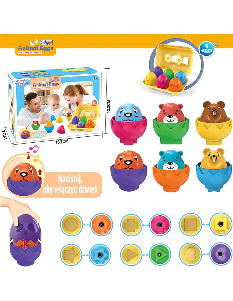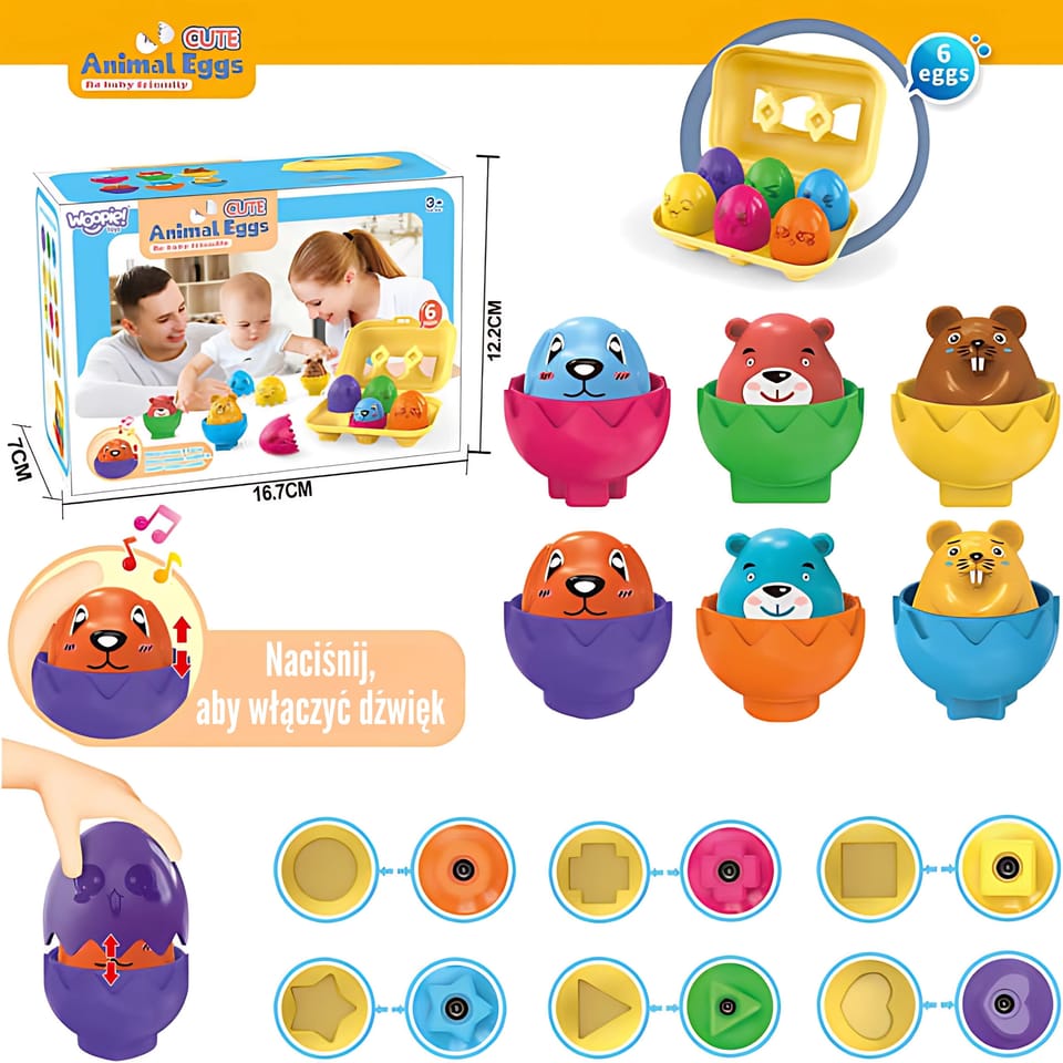 Odkryj magiczny świat Uroczych Zwierzęcych Jajek Woopie! – zabawki, która zachwyci Twoje dziecko i otworzy drzwi do fascynującej nauki poprzez zabawę! Ten uroczy zestaw 6 jajek, w których ukrywają się śliczne zwierzątka, to idealny sposób na rozwijanie zmysłów i zdolności manualnych malucha. Zadaniem malucha jest nie tylko otwarcie jajka, ale przede wszystkim dopasowanie go do odpowiedniego miejsca w wytłaczance. Każde jajko ma na spodzie unikalny kształt geometryczny, który odpowiada jednemu otworowi w pudełku. Dodatkowo po wciśnięciu na figurkę zwierzaka usłyszymy efekt dźwiękowy. Zabawne minki umieszczone na skorupkach to świetny sposób, aby nauczyć dzieci rozpoznawania i nazywania emocji. Dzięki nim maluchy w łatwy i przyjemny sposób przyswajają, jak wyglądają i co oznaczają różne uczucia. Przygotuj się na godziny wciągającej i edukacyjnej rozrywki!