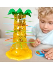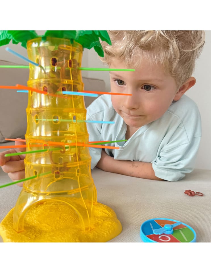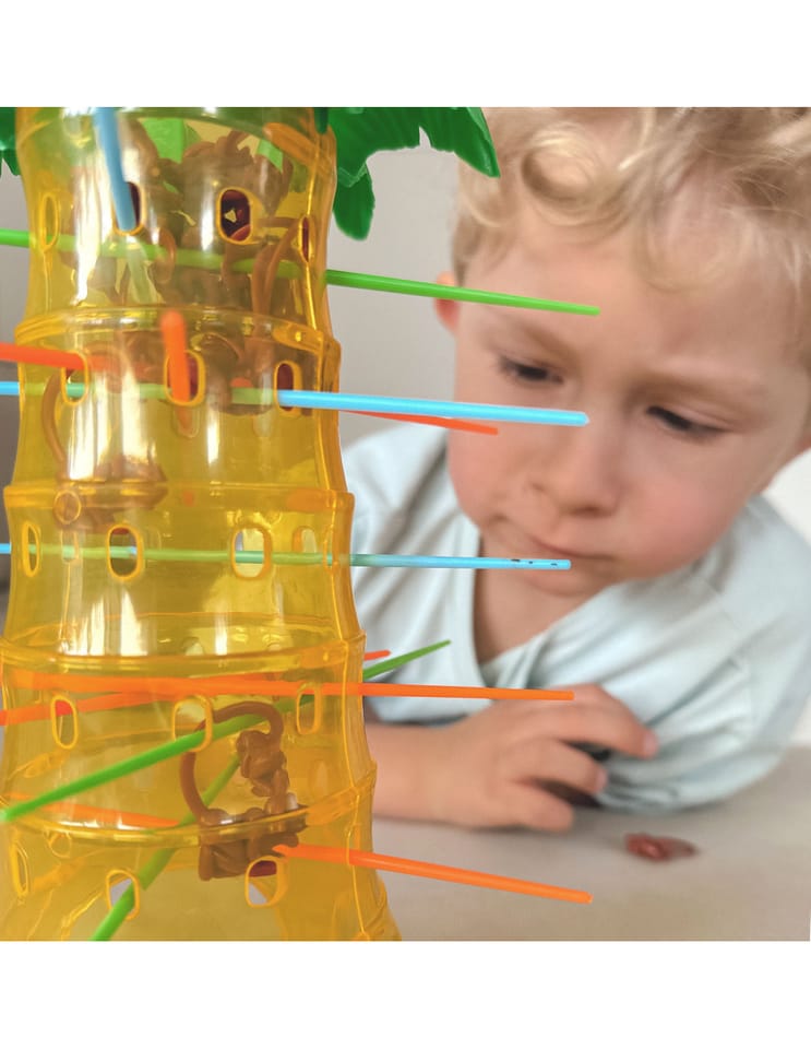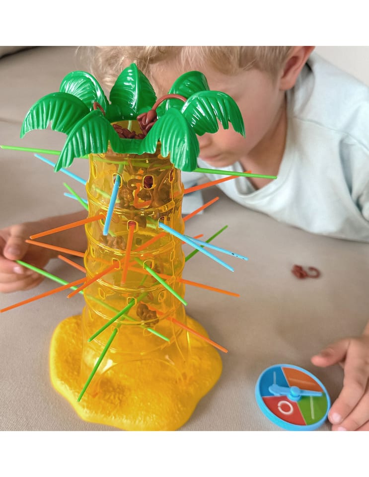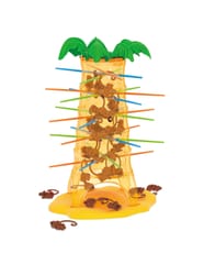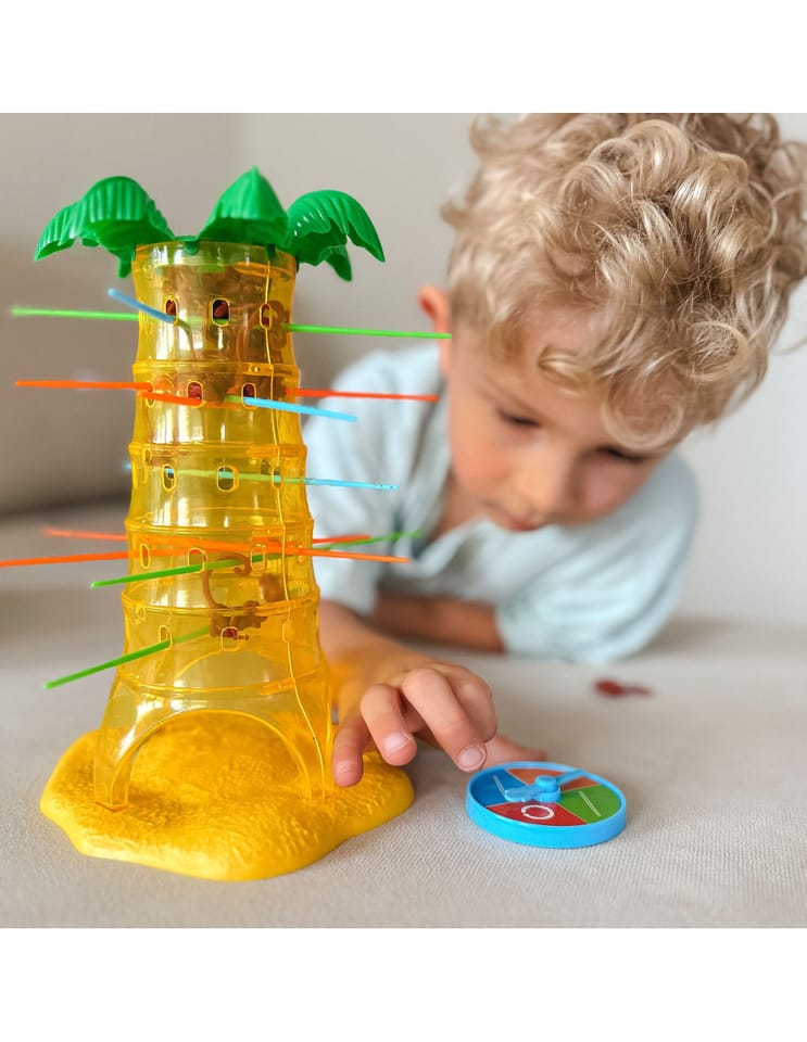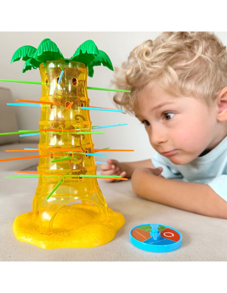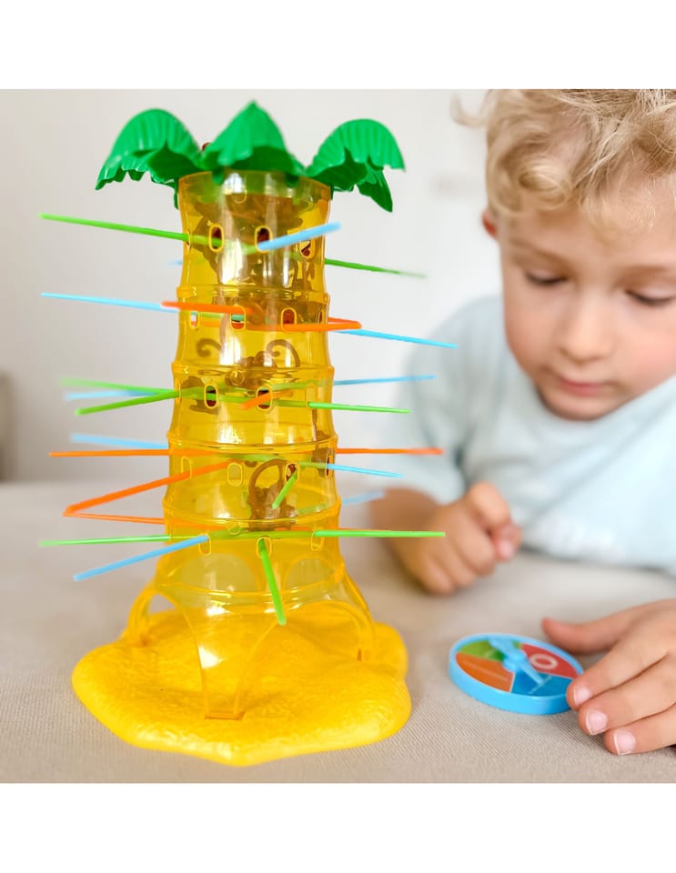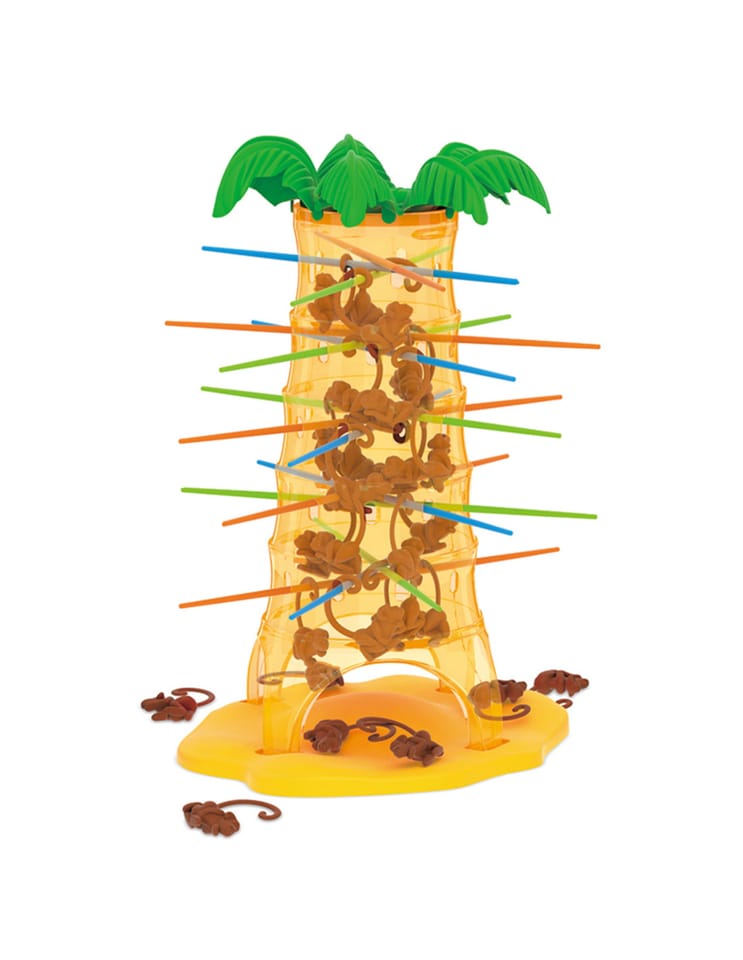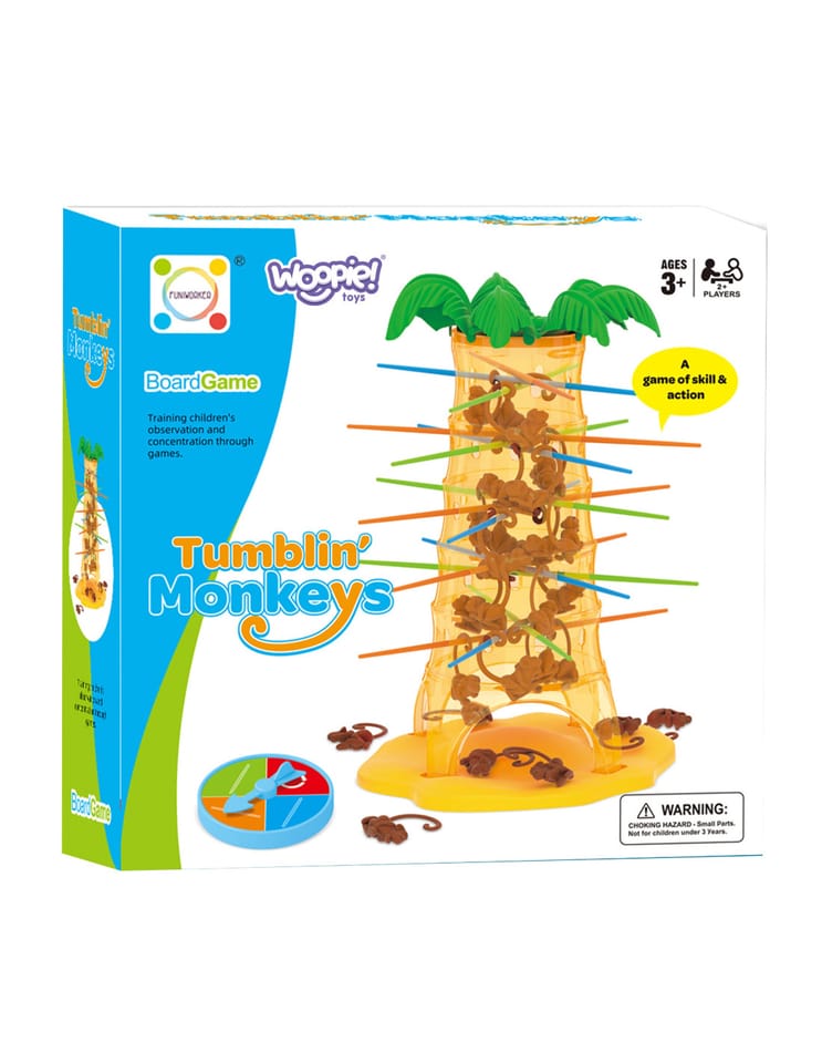 Gra Upadające Małpki od marki Woopie to wspaniała zabawa dla całej rodziny, poprawiająca zręczność i trzymająca w napięciu. Umieść patyczki w otworach palmy a następnie wrzuć małpki do środka drzewa. Zakręć kołem, strzałka pokaże Ci jaki kolor patyczka musisz wyciągnąć, w taki sposób aby jak najmniej małpek spadło z palmy. Wygrywa ta osoba, która strąci jak najmniej małpek z drzewa. Zagraj i nie pozwól małpkom spaść z palmy.