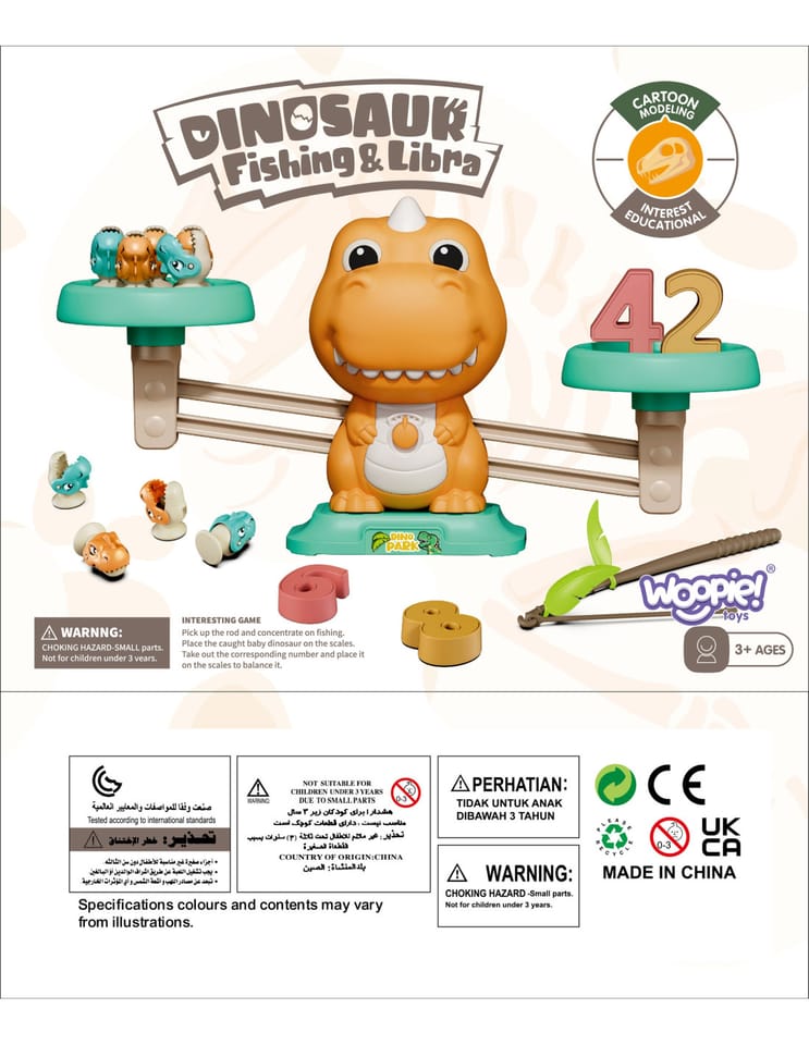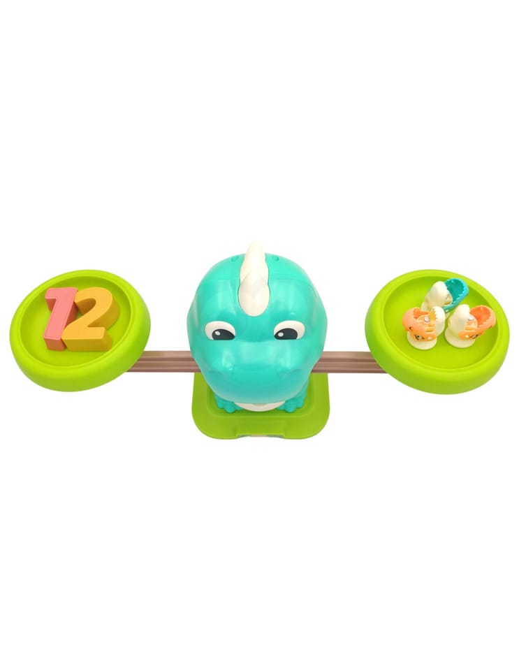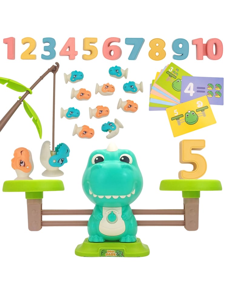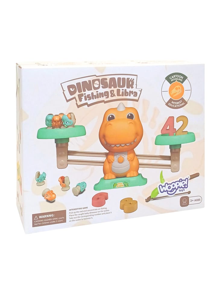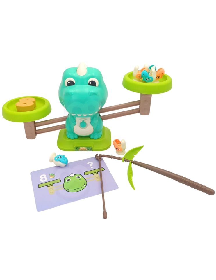 Dinozaur z równoważnią od marki WOOPIE zachęci do poznawania świata, liczb i działań matematycznych, a między nauką przerwa na grę łowienie dinozaurów!. Na podstawce umieszczony jest duży dinozaur, na którym możemy bawić się wagą. Za dinozaurem jest miejsce na wędki do łowienia, można dołączyć do nich listki z zestawu. Ciężarków w zestawie jest 10, jeden ciężar odpowiada jednemu zwierzęciu z zestawu, czyli ciężarek 1 odpowiada jednemu dinozaurowi, ciężarek 2 - odpowiada dwóm dinozaurom, itd. Dodatkowo znajdziemy tu też karty z działaniami i odpowiedziami. Ta zabawka doskonale pobudza wyobraźnię, zachęca do kreatywnego i nieszablonowego myślenia, a także wspaniale rozwija zdolności manualne u najmłodszych, dodatkowo zapewnia wiele frajdy podczas nauki.