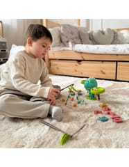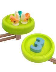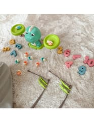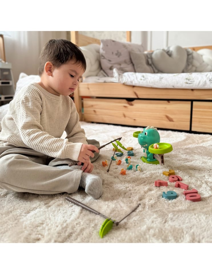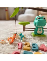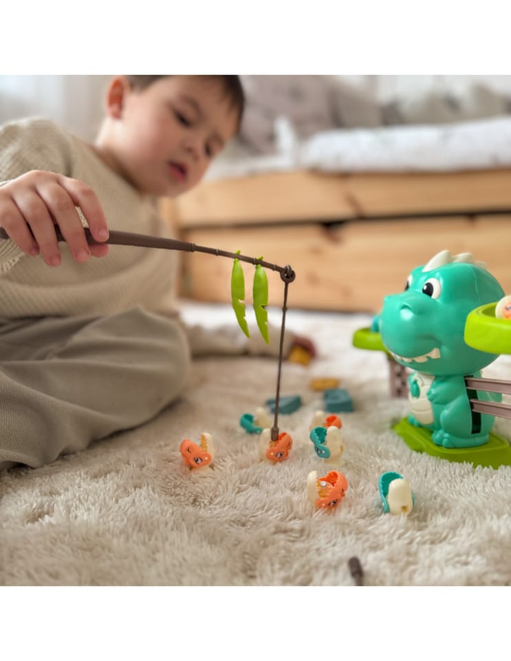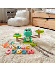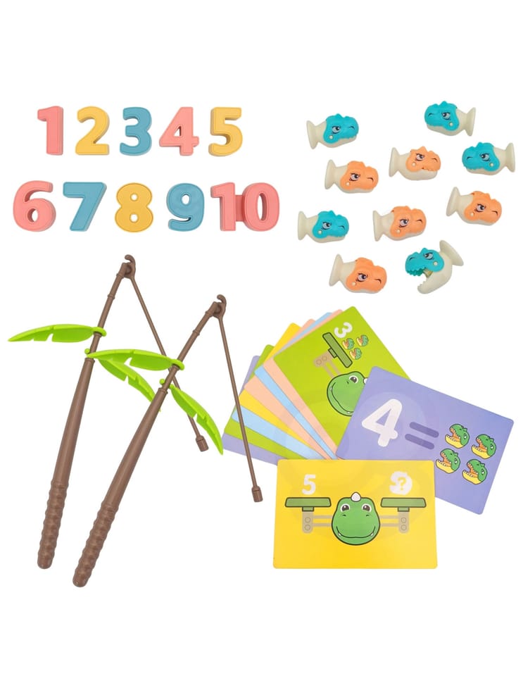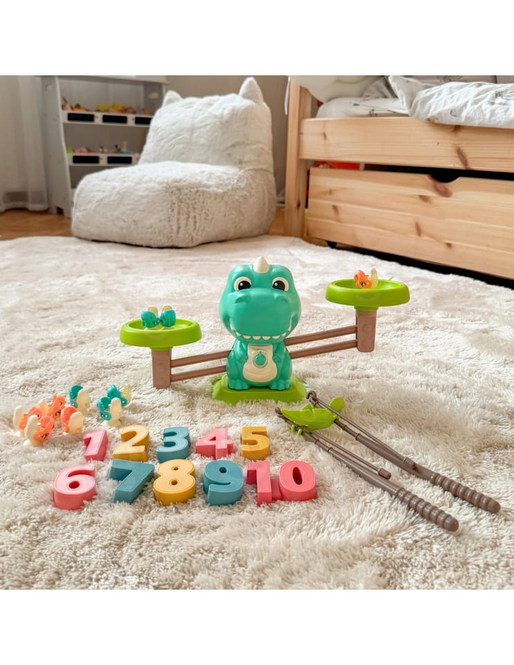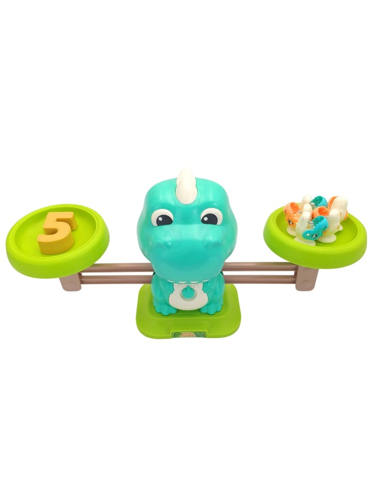 Dinozaur z równoważnią od marki WOOPIE zachęci do poznawania świata, liczb i działań matematycznych, a między nauką przerwa na grę łowienie dinozaurów!. Na podstawce umieszczony jest duży dinozaur, na którym możemy bawić się wagą. Za dinozaurem jest miejsce na wędki do łowienia, można dołączyć do nich listki z zestawu. Ciężarków w zestawie jest 10, jeden ciężar odpowiada jednemu zwierzęciu z zestawu, czyli ciężarek 1 odpowiada jednemu dinozaurowi, ciężarek 2 - odpowiada dwóm dinozaurom, itd. Dodatkowo znajdziemy tu też karty z działaniami i odpowiedziami. Ta zabawka doskonale pobudza wyobraźnię, zachęca do kreatywnego i nieszablonowego myślenia, a także wspaniale rozwija zdolności manualne u najmłodszych, dodatkowo zapewnia wiele frajdy podczas nauki.