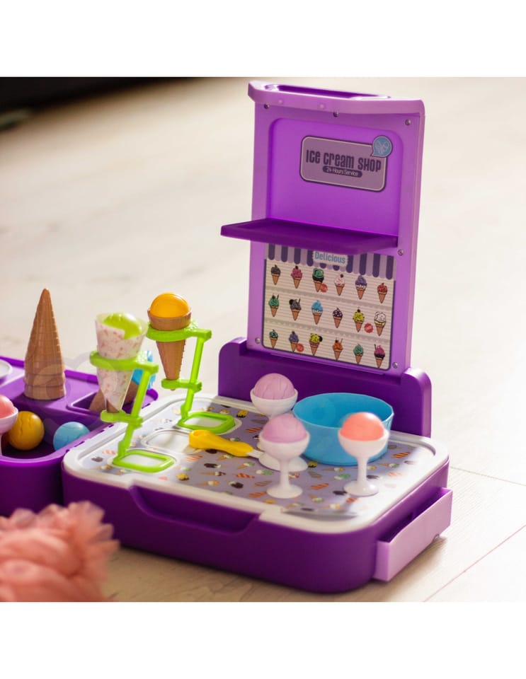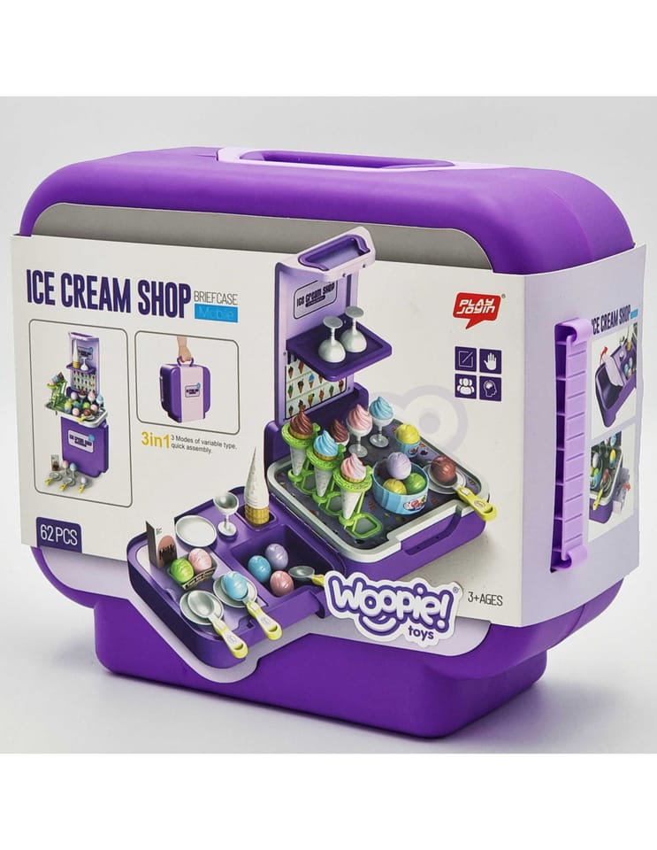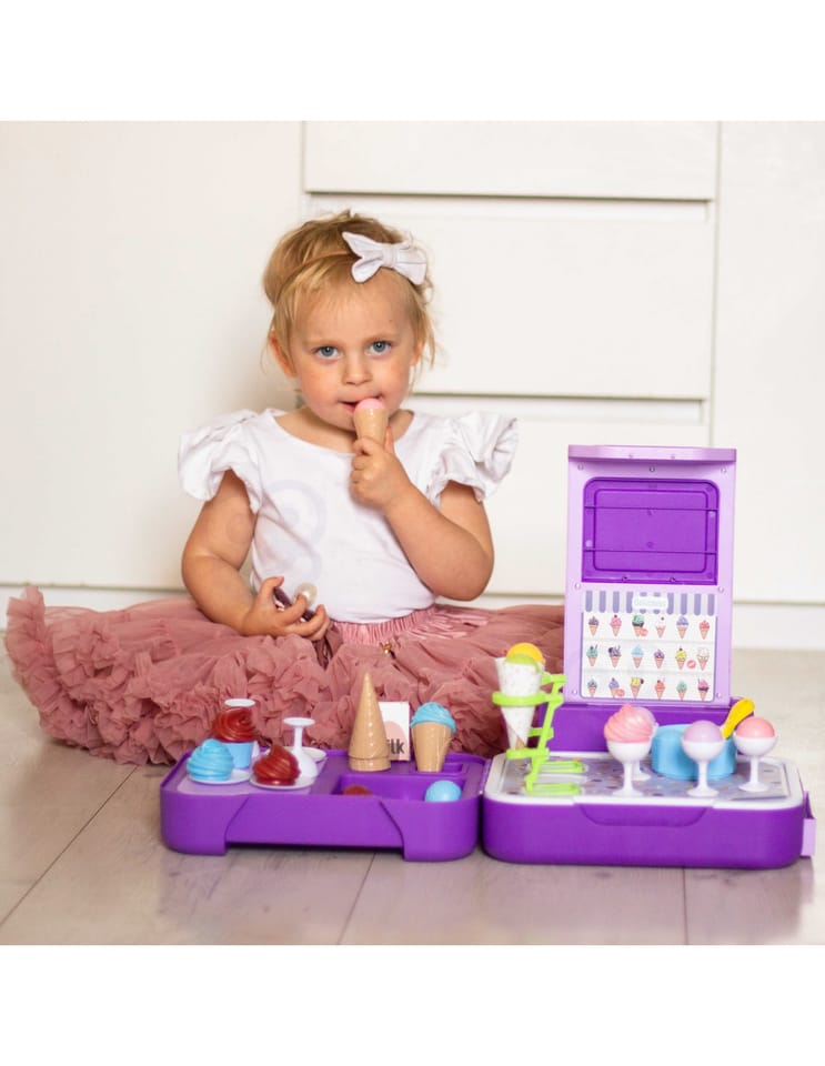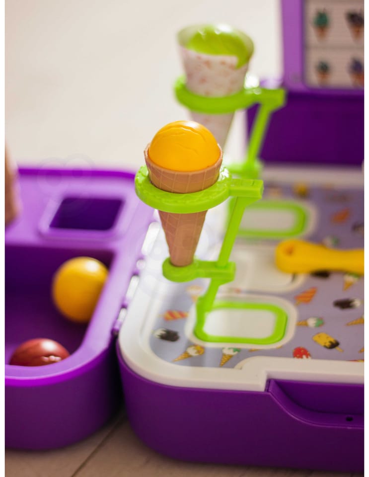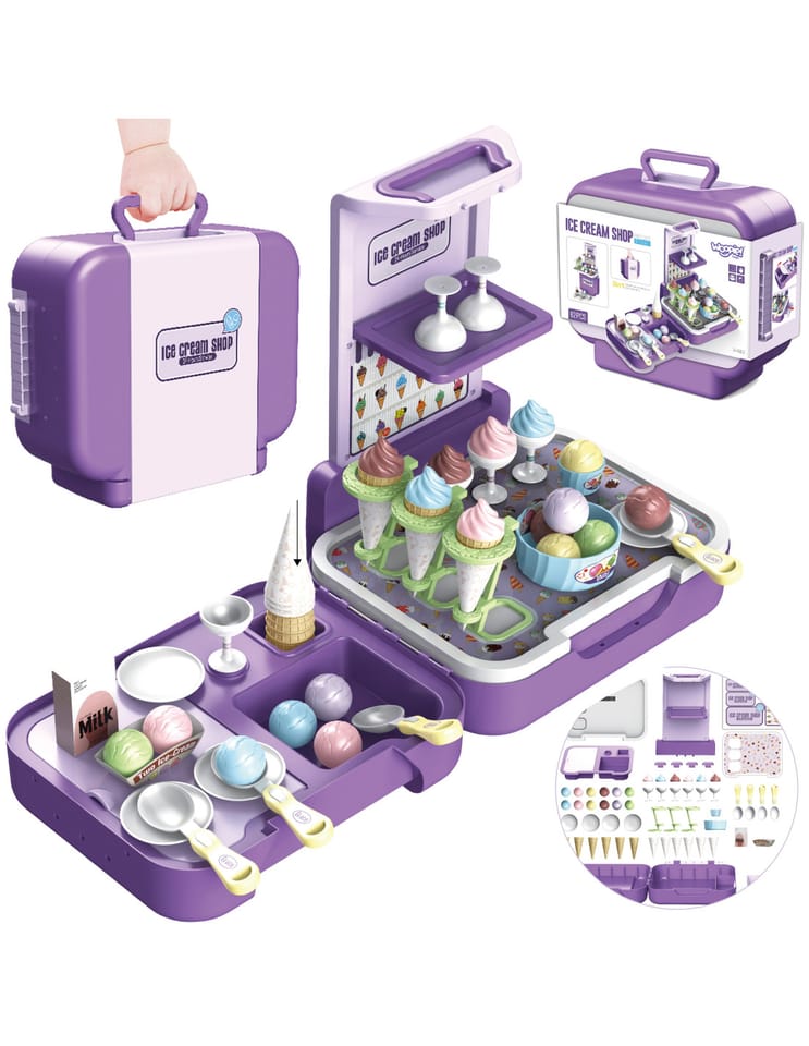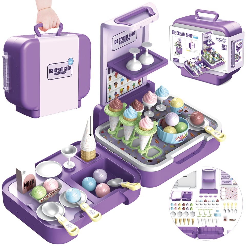 Stoisko z lodami zostało stworzone, by sprostać najbardziej wymagającym dzieciom. Sklep dla maluchów został zaprojektowany z myślą o sprzedaży lodów. Ty i Twoje dzieci pokochacie oryginalność projektu i sposób, w jaki pobudza wyobraźnię. Sklepik-lodziarnia dla dzieci nie tylko zachęca do zabawy, ale również służy jako zabawka edukacyjna dla dzieci. Zestaw świetnie się sprawdzi na przyjęcia urodzinowe, imprezy przy basenie, plac zabaw, w klasie lub przedszkolu. Ten super produkt świetnie się sprawdzi jako prezent dla Twoich pociech! Całość zapakowana w stylową walizkę.