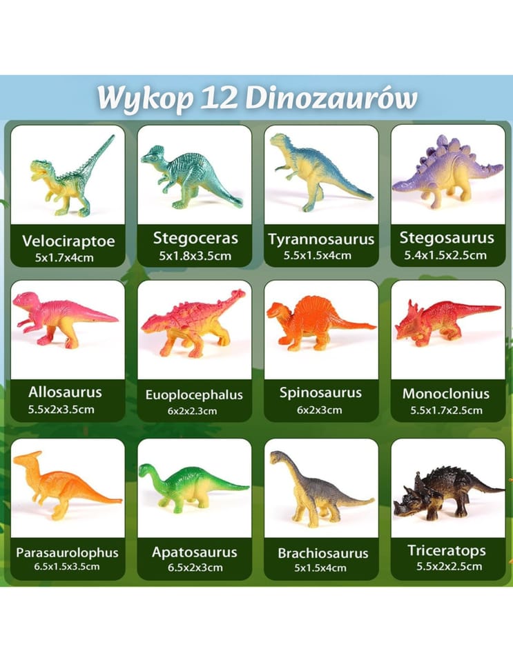 - - 12 figurek dinozaurów do odkrycia.