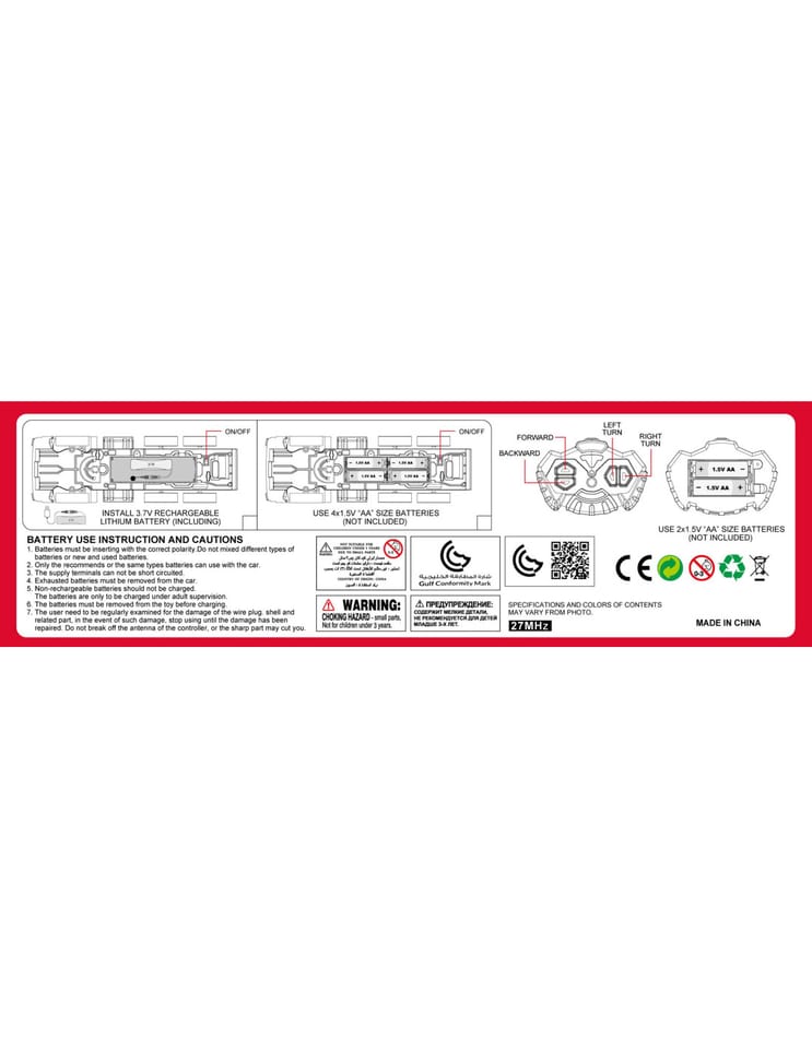 - -funkcja pilota R/C- W zestawie znajduje się pilot, który pozwala na pełną kontrolę nad pojazdem. Dziecko może z łatwością kierować wozem w przód, tył, lewo oraz prawo, włączać sygnały dźwiękowe za pomocą przycisków na samochodzie.