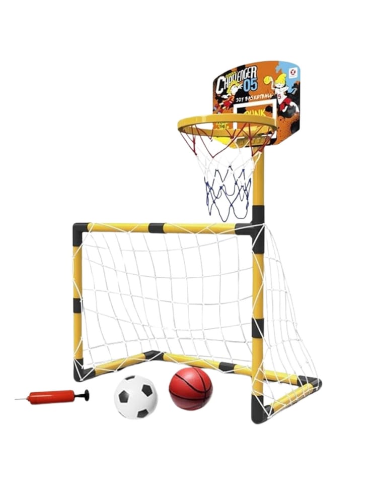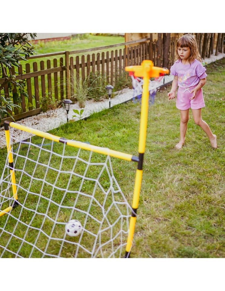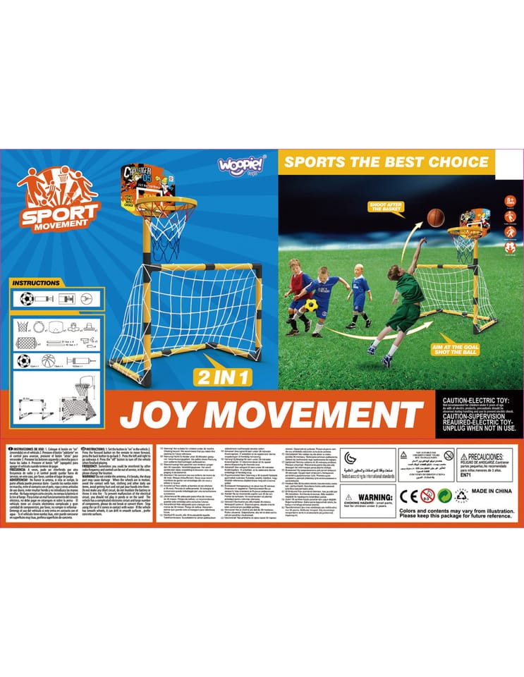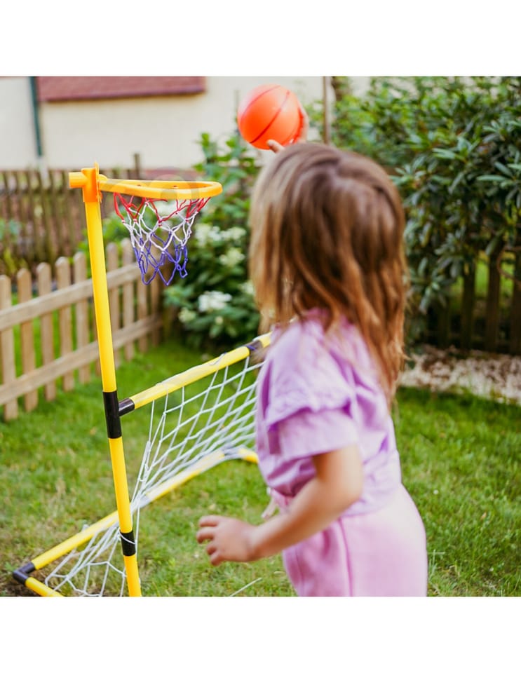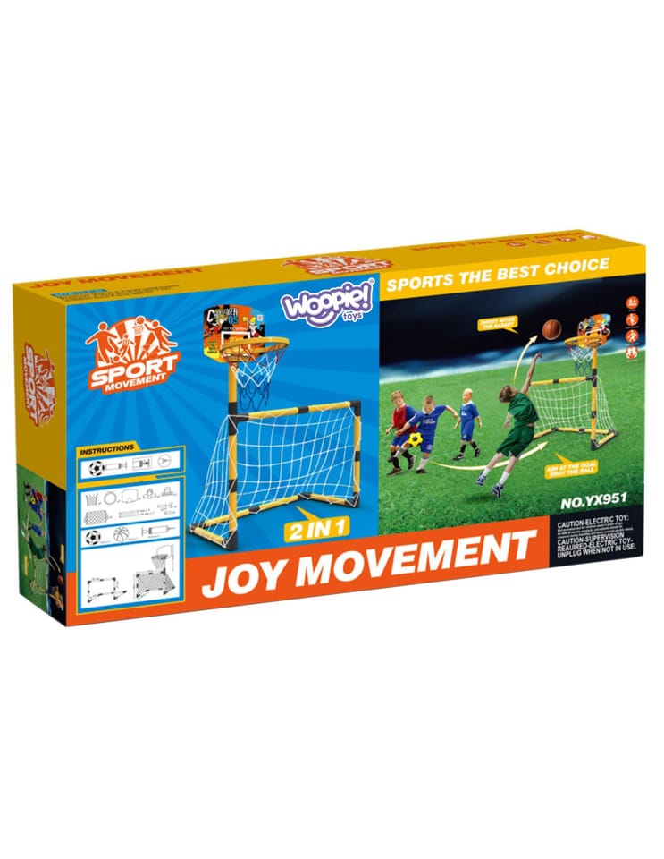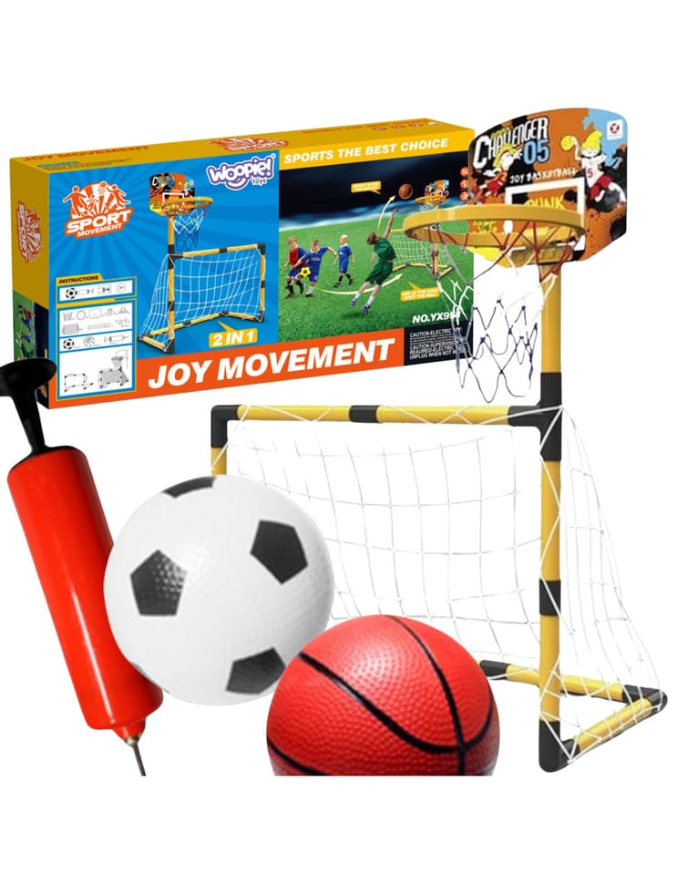 Zestaw 2w1 od Woopie to świetnej jakości zestaw, który łączy w sobie 2 dyscypliny- piłkę nożną i koszykówkę. Zestaw sportowy dla dzieci to doskonały sposób na zachęcenie najmłodszych do aktywności fizycznej. Montaż jest łatwy, a konstrukcja stabilna. Materiały użyte do produkcji są przyjazne dla dzieci. Wysokość koszykówki wynosi 125 cm, co sprawia, że jest to idealne rozwiązanie dla najmłodszych graczy. Zestaw można używać zarówno w domu, jak i na zewnątrz, dzięki czemu Twoje dziecko będzie mogło cieszyć się aktywnością bez względu na pogodę.