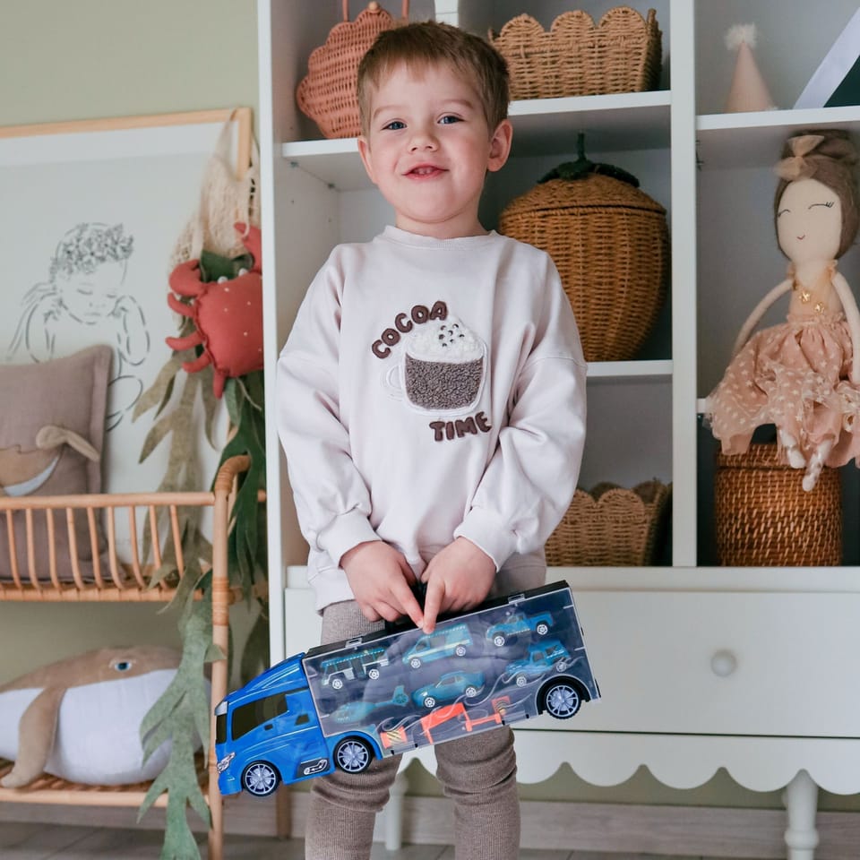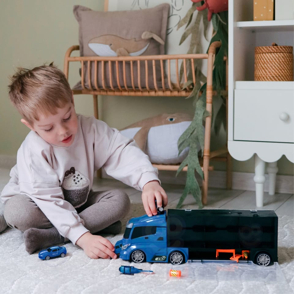 Ciężarówka 3w1 Policja od marki WOOPIE To idealna zabawka dla każdego małego fana pojazdów Policji, transportu i akcji! Zestaw składa się z dużej lawety TIR, która pomieści w sobie aż 5 samochodów Policyjnych, helikopter oraz dodatkowe znaki ostrzegawcze, które dodają realizmu zabawie. Dzięki wyrzutni umieszczonej na lawecie, dzieci mogą wysunąć samochody i wystrzeliwać je na różne odległości. Laweta ma aż 40 cm długości, co sprawia, że jest wystarczająco duża, by pomieścić wszystkie pojazdy i akcesoria. Zestaw doskonale rozwija wyobraźnię dziecka, pomagając w tworzeniu własnych scenariuszy zabawy. Dzięki znakom ostrzegawczym mogą uczyć się podstaw bezpieczeństwa na drodze, co czyni zabawę zarówno edukacyjną, jak i pełną emocji.