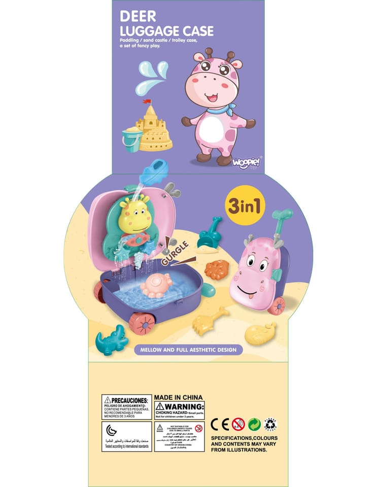 Zestaw do zabawy piaskiem i wodą od marki WOOPIE zaspokoi wszystkie potrzeby podczas podróży, zabawy w piaskownicy oraz plaży! Zestaw 3w1 - wszystko zapakowane jest w walizkę, w której znajdują się akcesoria do piasku i zabawka wodna. Walizkę wystarczy położyć na tył wypełnić spód wodą i dzięki kubeczkowi wlać wodę do głowy i obserwować jak ścieka woda. Taka zabawa rozwija zmysły dziecka oraz pozwala dziecku skupić się na zabawie. Akcesoria pozwalają na kompletną zabawę w piasku, nawet we dwoje! Zabawka spełnia wszystkie potrzeby do zabawy na dworze!
