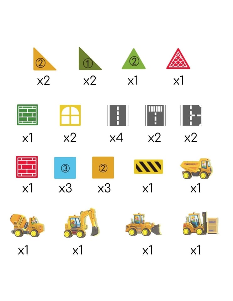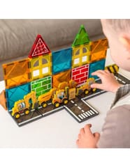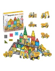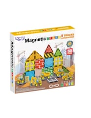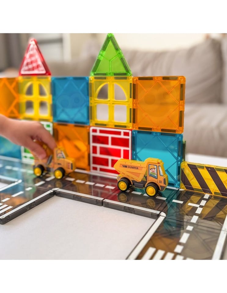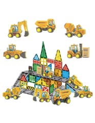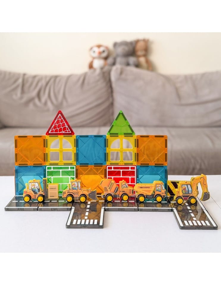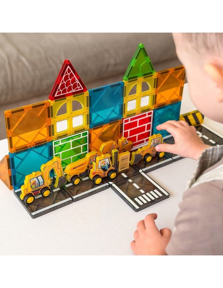 - - Zestaw konstrukcyjny z magnetycznymi klockami i pojazdami budowlanymi