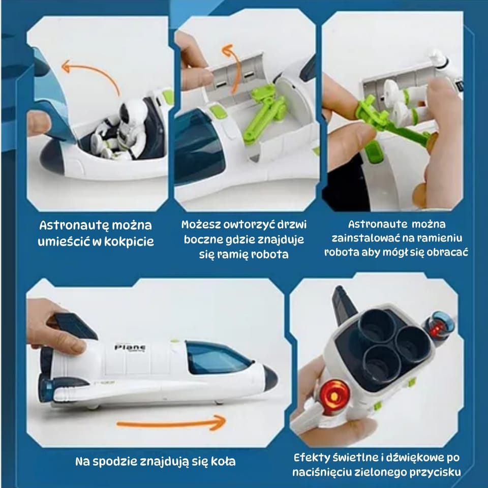 - - Interaktywny prom kosmiczny z otwieraną osłoną kokpitu, w którym można umieścić figurkę astronauty