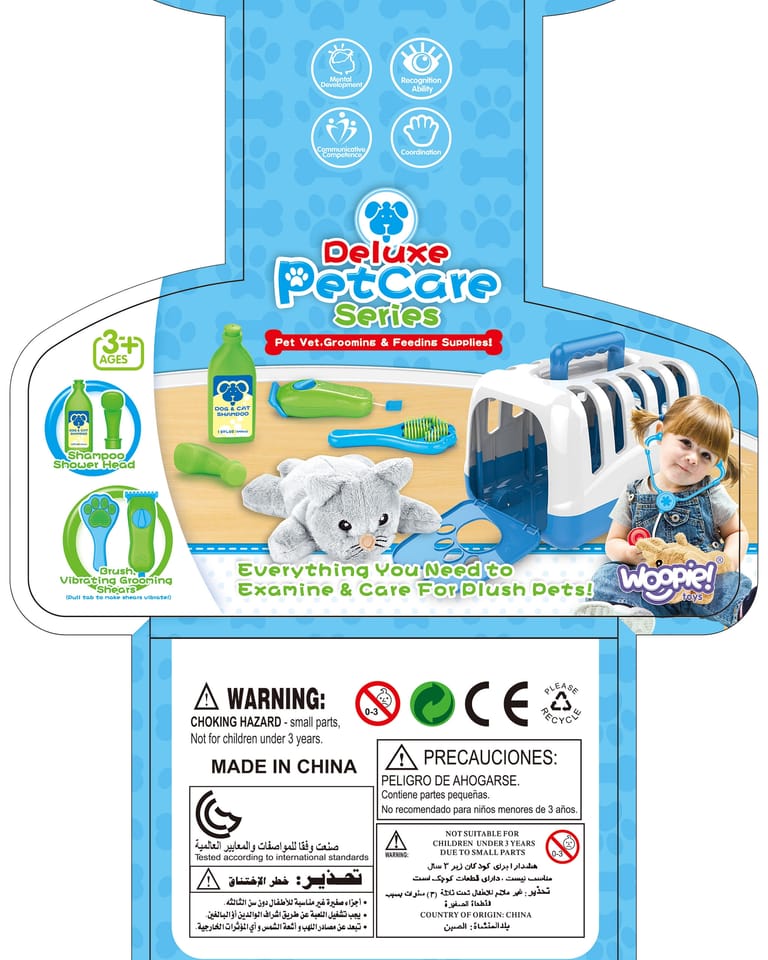 Przenośny Zestaw Małego Weterynarza od marki WOOPIE to idealna propozycja dla wszystkich lubiących zwierzęta i zabawy w odgrywanie ról. Zestaw zawiera 6 elementów, w tym: pluszaka/pieska, transporter, szczotkę, golarkę, szampon oraz dozownik do szamponu. Zestaw pozwoli wyleczyć ulubionego zwierzaka, a przy tym dziecko będzie uczyło się empatii i nabywało umiejętności społecznych. Opieka nad zwierzętami to także nauka odpowiedzialności. Dziecko będzie mogło zabrać i bawić się swoim pupilem wszędzie, dzięki przenośnemu transporterowi z wygodną rączką. Zabawka w weterynarza - odgrywanie ról - pozytywnie wpływa na rozwój dziecka, pobudza wyobraźnię oraz kreatywność.