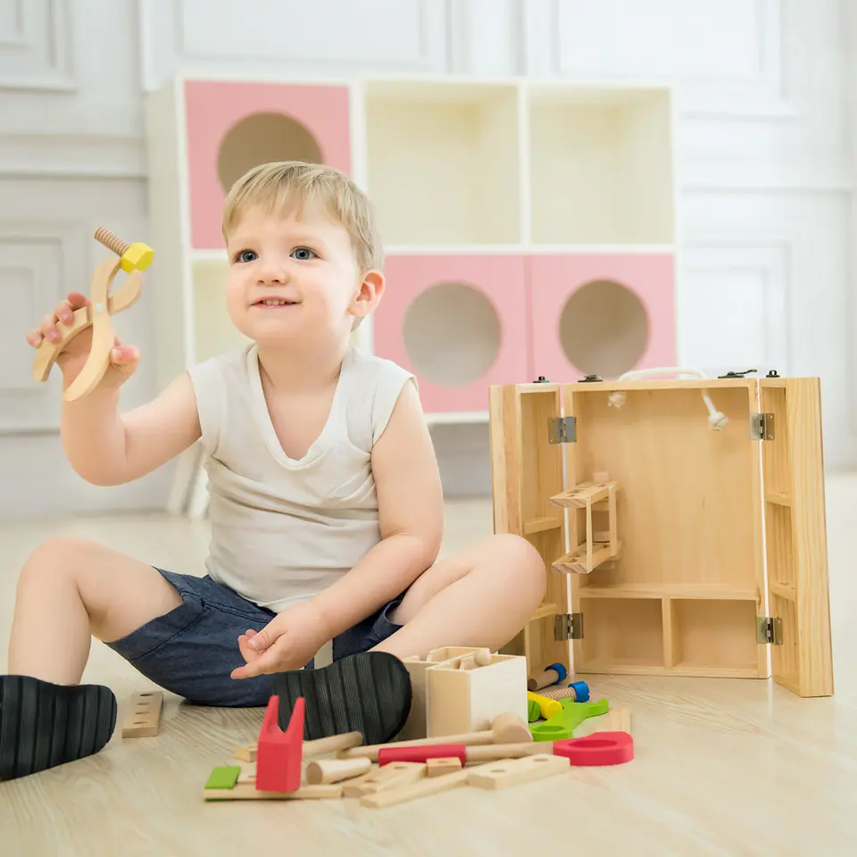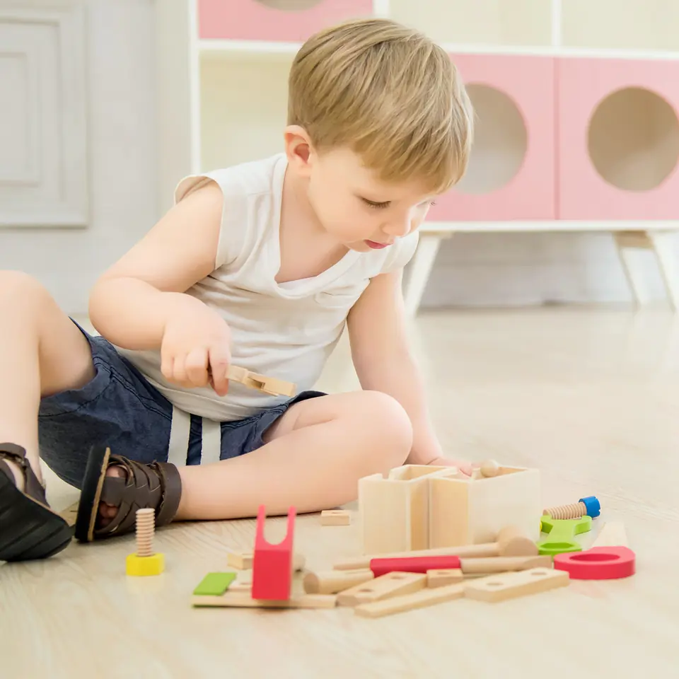 - - Narzędzia w odcieniach szarości i pomarańczowego/żółtego, przyciągające uwagę dziecka