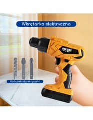 • - Cechy: Zestaw zawiera wkrętarkę elektryczną z wymiennymi końcówkami, akcesoria jak gogle i maska ochronna, oraz skrzynkę narzędziową do przechowywania