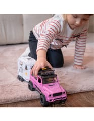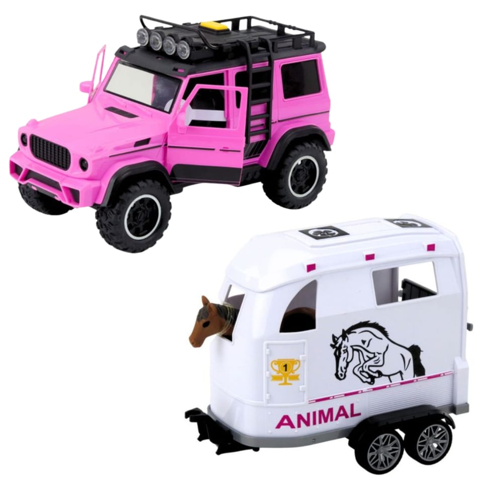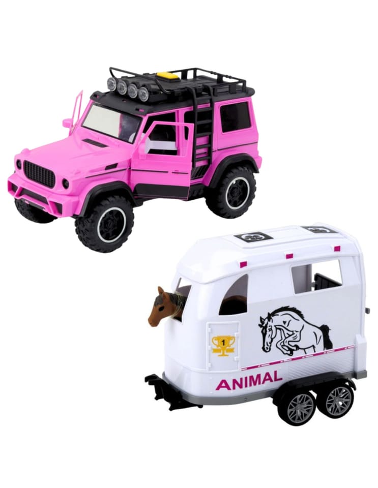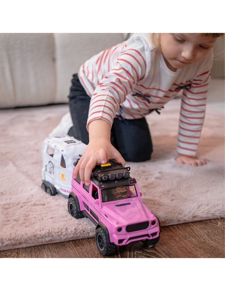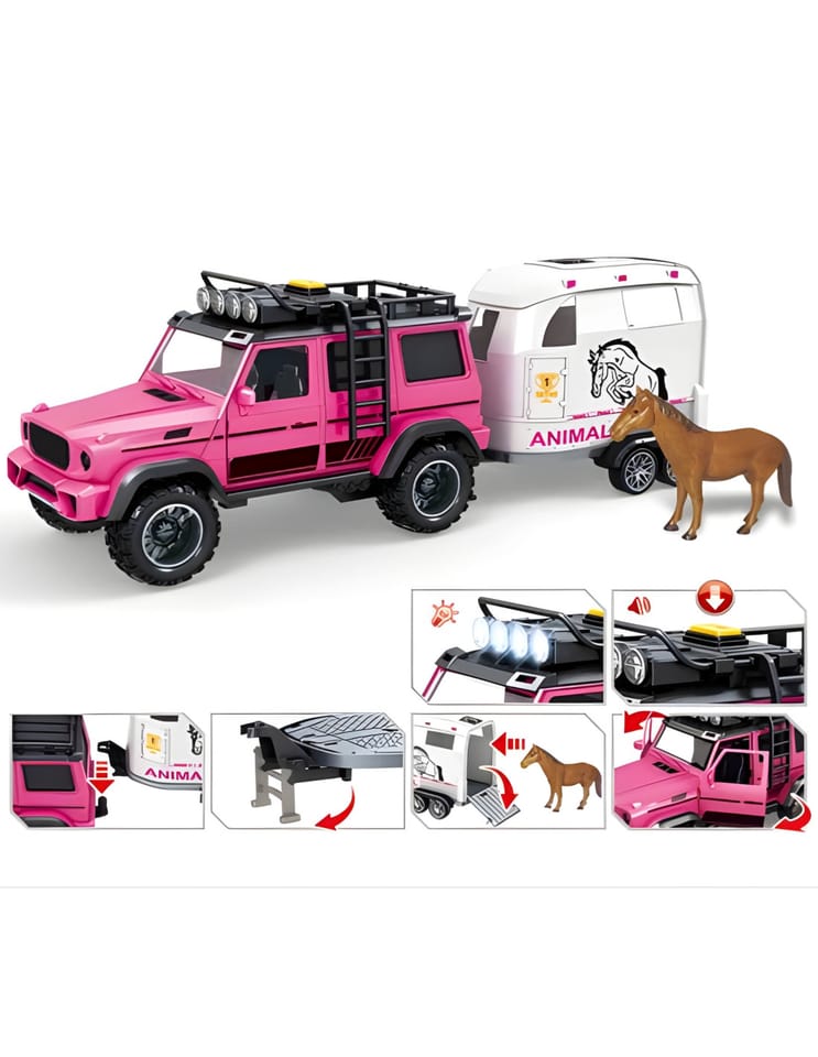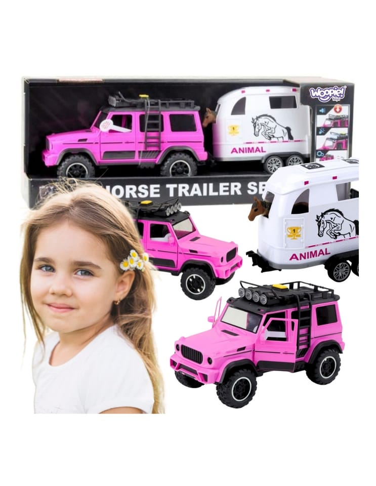 Wzbogać zabawę swojego dziecka o realistyczny zestaw różowego SUVa z białą przyczepa i figurką konia od WOOPIE! - zachwycają detalami i kolorystyką. Samochód wyposażony jest w efekty świetlne i dźwiękowe oraz otwierane drzwi, które zwiększają interaktywność zabawy. Odpinana przyczepa pozwala na zabawę samochodem, przyczepą i koniem osobno, co daje wiele możliwości twórczej zabawy. Idealny prezent dla małych miłośników zwierząt, pojazdów terenowych i kreatywnych zabaw w gospodarstwo. To zestaw, który rozwija wyobraźnię, kreatywność i umiejętności manualne dziecka.