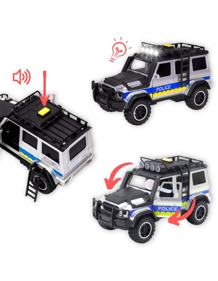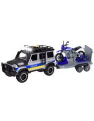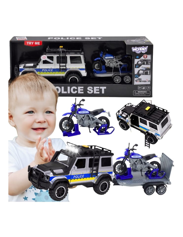 Wzbogać zabawę swojego dziecka o realistyczny zestaw policyjny od marki WOOPIE! Ten dynamiczny zestaw łączy w sobie funkcjonalność i emocjonującą zabawę. W skład zestawu wchodzi duży SUV z efektem świateł i dźwięków oraz przyczepa z motocyklem policyjnym. Otwierane drzwi w samochodzie oraz ruchomy motocykl zwiększają interaktywność zabawy. Idealny wybór dla małych miłośników służb mundurowych, motoryzacji i kreatywnej zabawy w akcje ratunkowe!