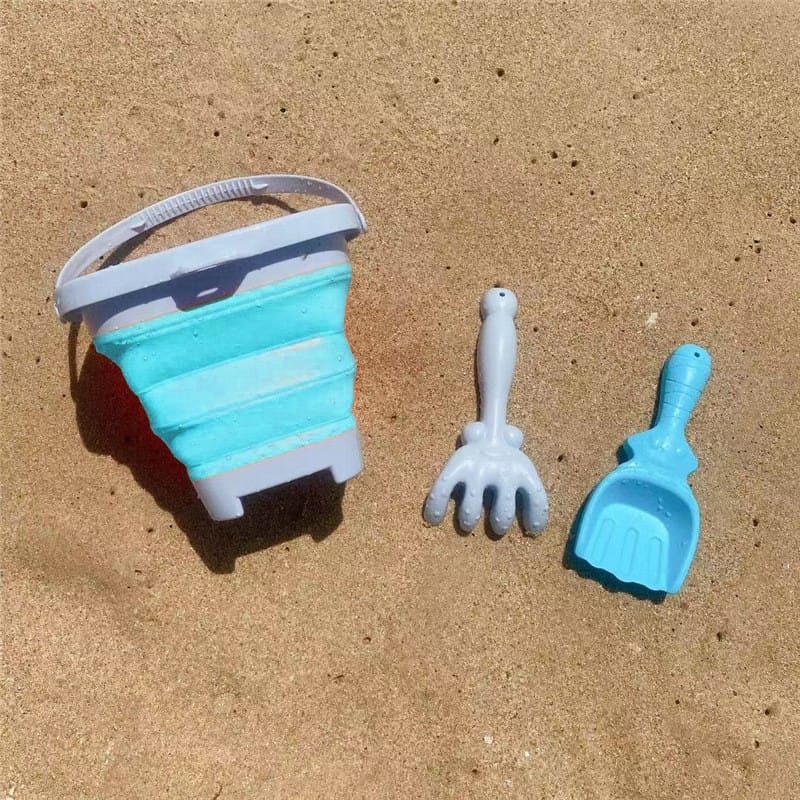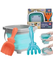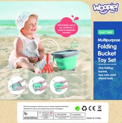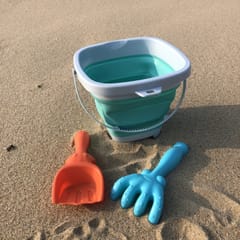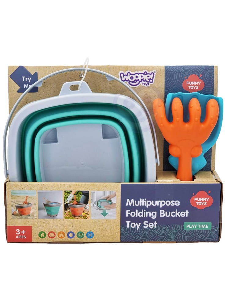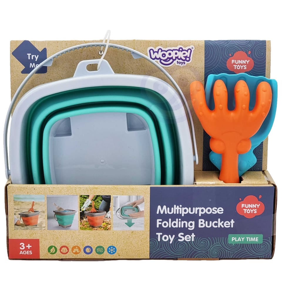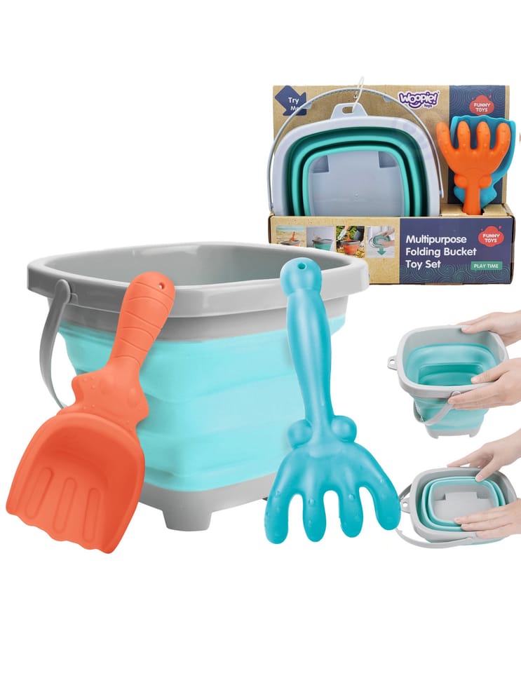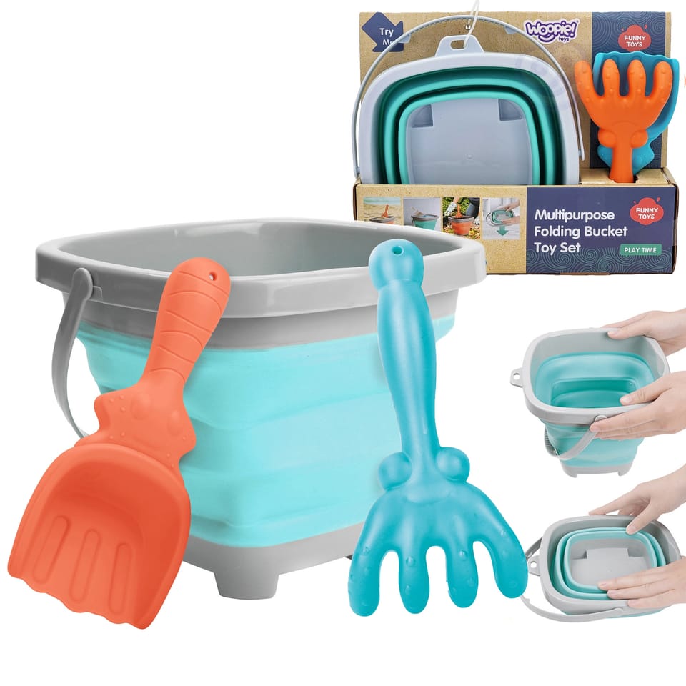 Silikonowe wiaderko z grabkami i łopatką od marki WOOPIE. Fantastyczne wiaderko do piaskownicy, na plażę lub do ogrodu, dzięki któremu dzieci miło spędzą czas na świeżym powietrzu. Wiaderko, dzięki składanej konstrukcji, zajmuje niewiele miejsca, jest łatwe w transporcie i wygodne do przechowywania. Zestaw zmieści się do dziecięcego plecaczka, do wózka czy plażowej torby.Góra, spód i rączka wiaderka są plastikowe, a ścianki wykonane są z grubego silikonu składanego harmonijkowo. Plastikowe są również grabki i łopatka.