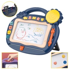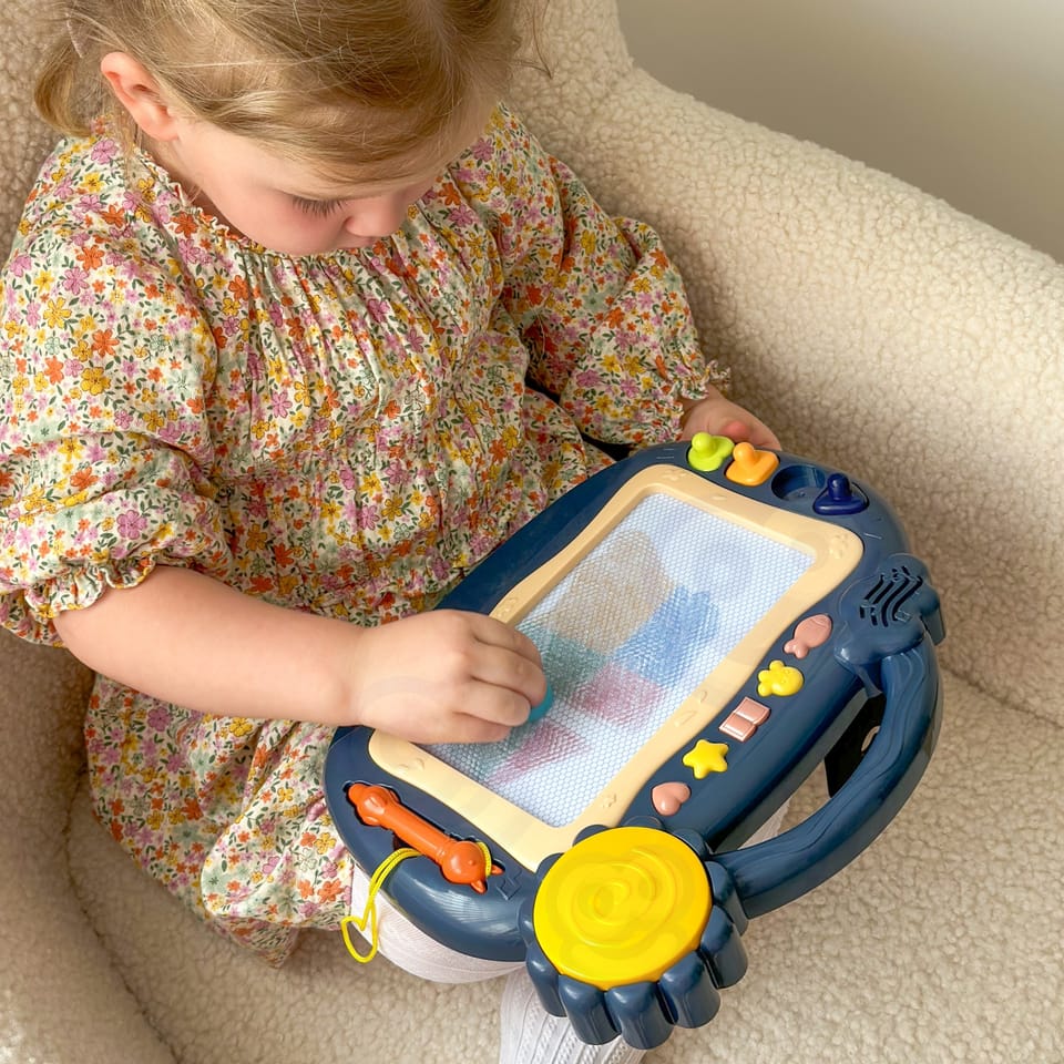 Znikopis Tablica Magnetyczna daje możliwość kreatywnej zabawy na długi czas! Tablica zachęca do pisania i rysowania. Rysowanie pozwoli wyciszyć i uspokoić się Twojemu dziecku. Znikopis pozwala na tworzenie nieskończonej ilość obrazków – wystarczy przejechać specjalnym suwakiem, a rysunek zniknie i można rysować od nowa! Zestaw dodatkowo zawiera wygodny długopis oraz aż 4 stempelki, które urozmaicą dzieło. Dodatkowo 5 multi funkcyjnych guzików, które mają ponad 400 opcji dźwiękowych, w tym: efekty dźwiękowe, taneczne piosenki dla dzieci, elektroniczne dźwięki, alfabet angielski oraz bęben. Tablica posiada wygodny uchwyt, dzięki czemu dziecko może zabrać ją wszędzie oraz posiada możliwość wystawienia nóżek, które ułatwia dziecku pisanie przy stole. Znikopis rozwinie u dziecka zdolności manualne, wyobraźnie, kreatywność oraz da szansę na rozwinięcie artystycznej strony dziecka!