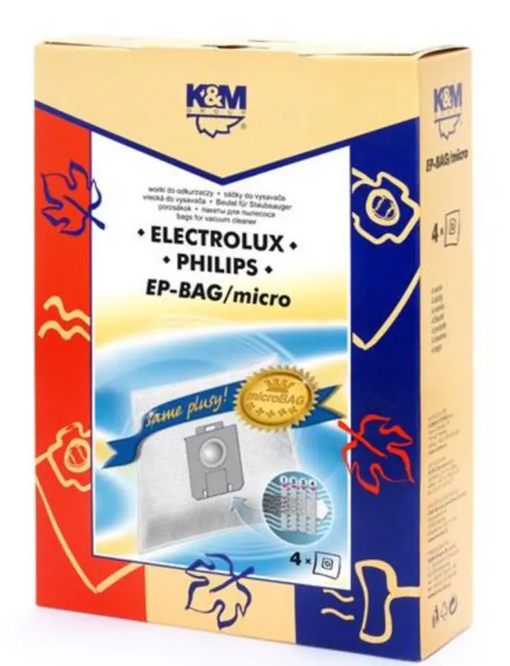 Worki micro wykonane są z czterowarstwowej, specjalistycznej włókniny filtracyjnej, dzięki czemu odkurzacz nie traci siły ssania (co ma miejsce w przypadku worka papierowego, w miarę jego napełniania się) i zużywa mniej prądu. Powietrze wychodzące z odkurzacza podczas pracy jest rzeczywiście oczyszczone z najmniejszych drobin kurzu i roztoczy. Zastosowana dodatkowa warstwa chroni ścianki worka przed rozerwaniem. Worki micro są bardzo plastyczne i idealnie dopasowują się do komory odkurzacza, co pozwala na jego lepsze wypełnienie. Tym samym zwiększa się czas użytkowania takiego worka. Ocenia się, że do zebrania zanieczyszczeń, mieszczących się w 5 tradycyjnych workach z papieru (standardowa zawartość kompletu), wystarczą zaledwie 3 worki micro. Posiada zamknięcie higieniczne i uchwyt plastikowy. Zawartość opakowania: 4 szt.