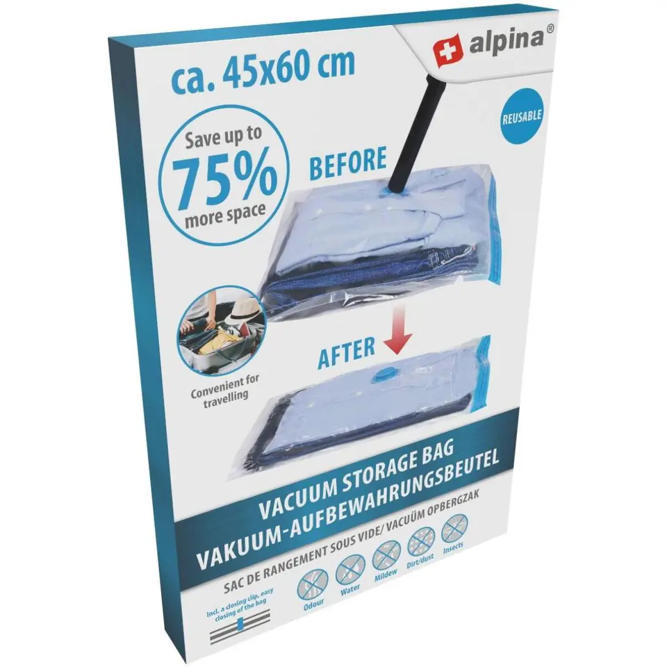 Skończył się sezon i chcesz zaoszczędzić miejsce w szafie? A może chcesz przechowywać pościel lub koce w szczelnym niedostępnym dla różnych drobnoustrojów i owadów miejscu. WOREK TORBA PRÓŻNIOWA DO PRZECHOWYWANIA UBRAŃ, POŚCIELI 60X80CM ALPINA to przede wszystkim ogromna oszczędność miejsca na Twoich półkach i w szafie, bo aż do 75%. To również doskonała metoda przechowywania dla alergików i nie tylko. Szczelnie zamknięta torba z pomocą specjalnego klipsa ochroni Twoje ubrania przed roztoczami, wilgocią i nieprzyjemnymi zapachami. Po spakowaniu rzeczy do torby i utworzeniu próżni z pomocą odkurzacza nie będziesz się już martwić, że np.: sweter czy zimowa kurtka będzie nieprzyjemnie pachnieć, a dodatkowo ich kolory dłużej zachowają świeżość. WOREK PRÓŻNIOWY DO PRZECHOWYWANIA UBRAŃ, POŚCIELI 45x60cm ALPINA doskonale ochroni Twoje rzeczy przed molami czy innymi insektami. Próżniowo spakowane ubrania to również świetne rozwiązanie podczas przeprowadzki czy podróży, dzięki oszczędności miejsca więcej spakujesz do walizki lub torby. Nie zwlekaj z zakupem, dołącz do grona zadowolonych klientów!