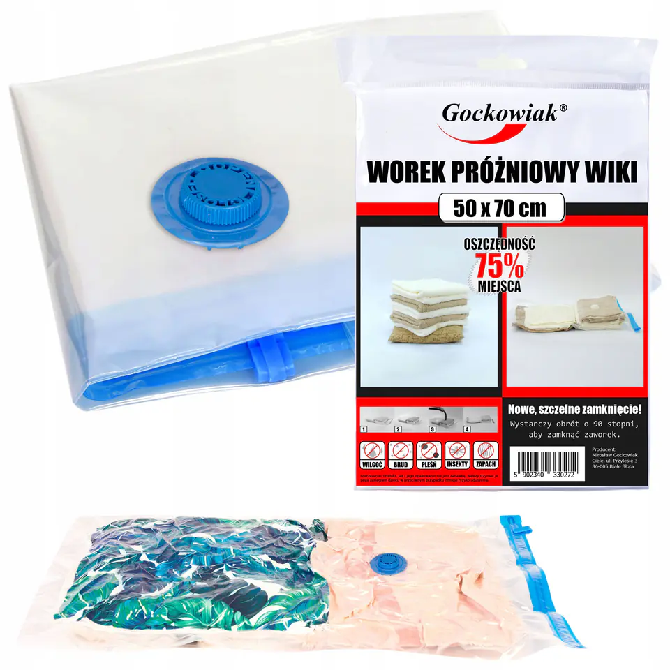 Worek próżniowy WIKI 50 x70 cm 1 sztukaRozmiar: 50x70 cm⭐Na odzież, koce, pościele⭐Oszczędność miejsca do 75%⭐Doskonały w podróży⭐ ✨Worek próżniowy Wiki – Idealny sposób na oszczędzanie miejsca!✨Szukasz skutecznego sposobu na zaoszczędzenie miejsca w swoim domu? Worek próżniowy Wiki jest odpowiedzią na Twoje potrzeby! Ten rewolucyjny produkt pozwoli Ci oszczędzić nawet do 75% miejsca, dzięki czemu Twoje ubrania, pościel czy koce zajmą znacznie mniej miejsca. Wykonany z wytrzymałego nylonu i polietylenu, zapewnia wielokrotne użytkowanie i ochronę przed czynnikami zewnętrznymi. Idealny w czasie przeprowadzek lub podróży, gwarantuje, że przechowywane przedmioty pozostaną bezpieczne i tak samo atrakcyjne jak w dniu zapakowania.✅Zaoszczędź do 75% miejsca: Dzięki workowi próżniowemu Wiki wykorzystasz każdy centymetr przestrzeni w swojej szafie czy walizce. To idealne rozwiązanie dla tych, którzy cenią porządek i przestrzeń.✅Wytrzymałe materiały: Nylon i polietylen zapewniają trwałość i możliwość wielokrotnego użytku. Nie musisz martwić się o szybkie zużycie czy uszkodzenia.✅Perfekcyjna ochrona: Twoje rzeczy będą bezpieczne przed wilgocią, brudem, pleśnią, insektami oraz niechcianymi zapachami. Worek próżniowy Wiki to gwarancja czystości i świeżości na dłużej.✅Idealny do różnych przedmiotów: Niezależnie od tego, czy potrzebujesz przechować ubrania, pościel czy koce, ten worek próżniowy spełni Twoje oczekiwania. Uniwersalny rozmiar 50 x 70 cm sprawia, że jest on niezwykle praktyczny.✅Łatwość użycia: Użycie worka jest banalnie proste – wystarczy odkurzacz. Nie potrzebujesz żadnych dodatkowych narzędzi ani umiejętności, aby skorzystać z zalet przechowywania próżniowego.✅Doskonały w podróży: Kompresuje odzież, pościel, i inne tekstylia, sprawiając, że stają się one łatwiejsze do spakowania i zajmują mniej miejsca w bagażu. To doskonały wybór dla osób, które chcą zabrać więcej rzeczy nie zwiększając wielkości swojego bagażu. ✔️Specyfikacja:materiał: nylon, polietylenrozmiar: 50x70 cmprzeznaczenie: przechowywanie odzieży, tekstyliów, pościeli itpwaga: ok 70g ✔️Doskonałe w podróżyWorki próżniowe Wiki to idealny towarzysz każdej podróży, umożliwiając maksymalne wykorzystanie przestrzeni w Twojej walizce. Kompresując ubrania i tekstylia, pozwalają zaoszczędzić cenną przestrzeń, dzięki czemu możesz zabrać więcej niezbędnych rzeczy bez konieczności pakowania dodatkowych bagaży. Co więcej, dzięki ochronie przed wilgocią, brudem i innymi niechcianymi niespodziankami, Twoje rzeczy pozostają bezpieczne i czyste przez cały czas trwania podróży. Łatwe w użyciu, wystarczy podłączyć odkurzacz i w kilka chwil Twoje ubrania są gotowe do spakowania. Bez względu na to, czy wybierasz się na krótki wypad za miasto, czy długą, zagraniczną podróż, worki próżniowe Wiki sprawią, że pakowanie stanie się łatwiejsze, szybsze i bardziej efektywne. ✔️Sposób użycia:Rzeczy przeznaczone do przechowywania należy umieścić w worku. Nie należy pakować zbyt wiele rzeczy do jednego worka.Pomiędzy rzeczami a krawędziami worka powinna pozostać wolna przestrzeń. Między rzeczami a zapięciem należy pozostawić ok. 10 cm wolnej przestrzeni. Rzeczy przeznaczone do przechowywania muszą być czyste i sucheNastępnie należy dokładnie/szczelnie zamknąć worek korzystając z załączonego suwaka.Za pomocą odkurzacza należy odessać powietrze. Zawór pasuje do większości węży od odkurzacza.Na koniec należy zakręcić korek worka. ➡️To takie proste, wystarczy tylko odkurzacz!⬅️Ubrania przechowywane w workach próżniowych Wiki, bez dostępu powietrza, zachowują swoją świeżość i wygląd nowych na znacznie dłużej. Co więcej, proces przechowywania próżniowego jest niezwykle prosty i dostępny dla każdego – wystarczy podłączyć odkurzacz do specjalnego zaworu worka Wiki, aby w kilka chwil usunąć z niego całe powietrze. Ta metoda nie tylko przedłuża życie Twoich ubrań, ale także jest wygodna i efektywna, co czyni ją idealnym rozwiązaniem dla każdego, kto ceni sobie zarówno porządek, jak i stan swojej garderoby. ✔️Przechowywane rzeczy są zabezpieczone przed:wilgociąbrudempleśniąinsektamizapachami ✔️Oszczędność Miejsca nawet do 75%!Worki próżniowe Wiki to rewolucyjne rozwiązanie dla tych, którzy chcą maksymalnie wykorzystać dostępną przestrzeń w swoich szafach, walizkach czy piwnicach. Dzięki możliwości kompresji zawartości i usunięcia z niej powietrza, worki te umożliwiają oszczędność miejsca nawet o 75%. To oznacza, że możesz przechowywać znacznie więcej ubrań, pościeli czy koców w tym samym miejscu, co wcześniej. Proces jest niezwykle prosty – wystarczy załadować worek, podłączyć odkurzacz i obserwować, jak objętość Twoich rzeczy zmniejsza się przed Twoimi oczami. Tak imponująca oszczędność miejsca czyni worki próżniowe Wiki idealnym wyborem dla każdego, kto szuka skutecznego sposobu na organizację przestrzeni w domu czy podczas podróży.UWAGA | Przedstawione kolory należy traktować poglądowo - mogą odbiegać od rzeczywistych ze względu na różne ustawienia monitorów oraz proces obróbki zdjęć • Rzeczywiste wymiary mogą się nieznacznie różnić od podanych w opisie. Tolerancja błędów może wynosić +/- 5%