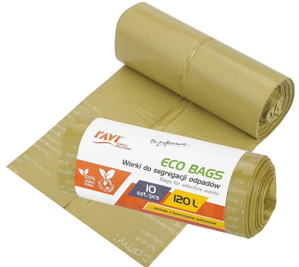 Worki do segregacji odpadów ECO BAGS są wykonane w 100% z surowców wtórnych. Są produktem służącym do pomocy podczas domowej segregacji odpadów. Żółte worki są przeznaczone do wrzucania do nich metali i różnego rodzaju tworzyw sztucznych. Worki ECO BAGS są przyjazne dla środowiska, a ich pojemność 120L wystarczy na długo. Worki są sprzedawane po 10 sztuk. CECHY PRODUKTU: