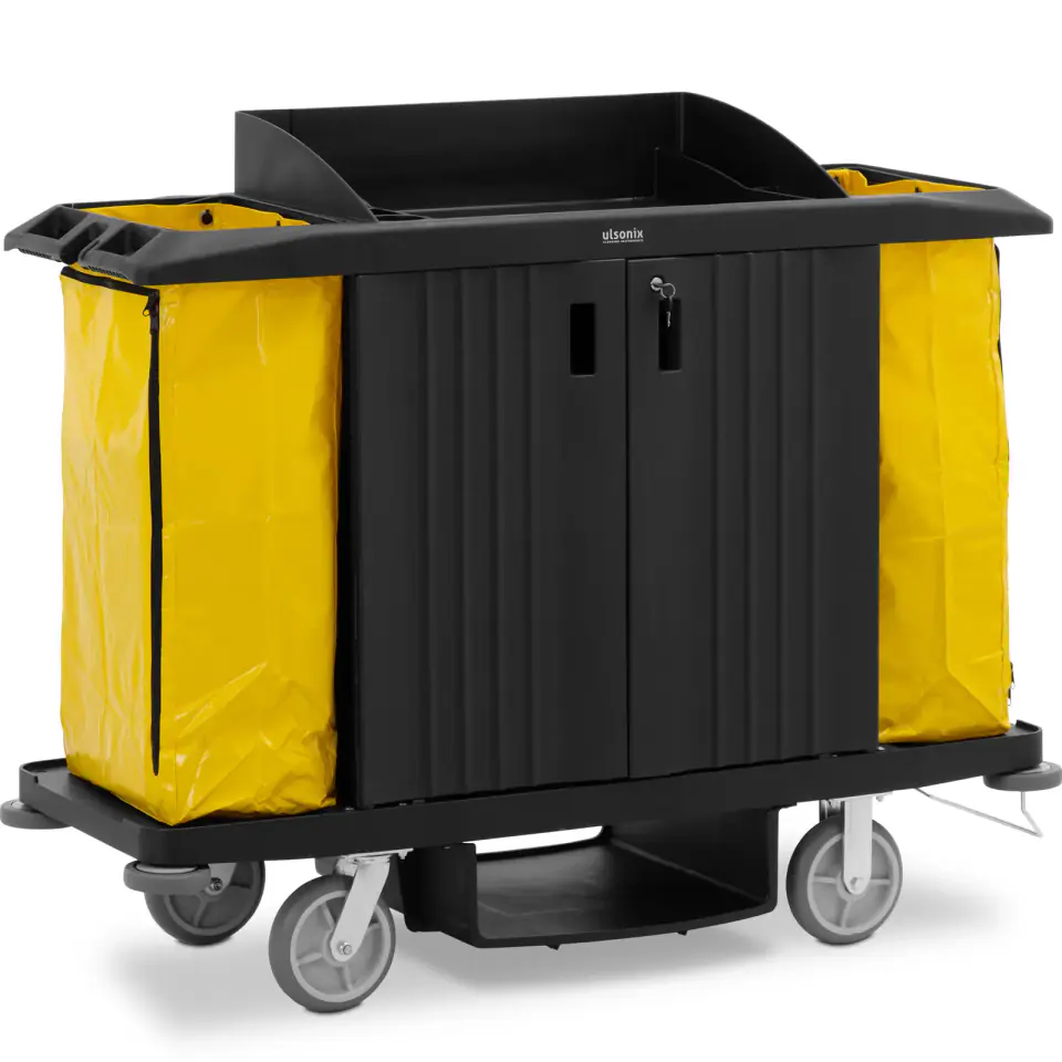 Kod producenta: 10050460Wózek hotelowy marki Ulsonix to uniwersalne narzędzie do efektywnego sprzątania budynków. Sześć półek pozwala przechować środki czystości, narzędzia pracy i wszystko, co potrzebne. Sprawdzi się w hotelu, szpitalu czy kompleksie biurowym. Nośność wózka wynosi 250 kg. Jest on wyjątkowo zwrotny i wydajny podczas sprzątania. Najważniejsze narzędzia, takie jak szczotki, ściereczki czy worki na śmieci, można przechować na górnej półce i zawsze będą pod ręką. Podzielone obszary zapewniają porządek, a krawędź półki zapobiega staczaniu się przewożonych sprzętów. Górna półka wytrzymuje obciążenie do 50 kg. Szafka z dwoma przegródkami znajdująca się pod spodem oferuje dodatkową przestrzeń na środki czyszczące i inne przybory do sprzątania. Półka zniesie obciążenie do 25 kg, podczas gdy dolną sekcję można z łatwością obciążyć do 50 kg. Pod szafką znajduje się również otwarty schowek o nośności 25 kg. Drzwi wózka hotelowego zamkniesz na dwa klucze, dzięki czemu łatwo można zabezpieczyć żrące środki i narzędzia przed nieupoważnionym dostępem. Dwie torby o pojemności 91,6 l umieszczone zostały po bokach wózka do sprzątania. Wykonano je z mocnego materiału odpornego na rozdarcia. Z łatwością można go wyczyścić wodą z mydłem. Możesz bez problemu wyjąć zebrane pranie lub pełne worki na śmieci, otwierając zamki w nylonowych workach o wymiarach 44 x 26 x 80 cm. Każda z półek bocznych ma nośność 50 kg.Cechy produktu: