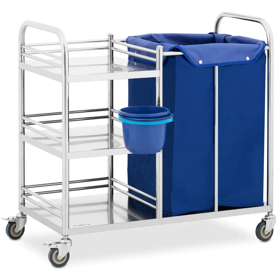Kod producenta: 10030865Wózek na pranie marki Steinberg Systems nadaje się do pracy w szpitalach, laboratoriach, hotelach, placówkach opiekuńczych czy domach wypoczynkowych. 3 półki o wymiarach 34,5 x 42 x 25 cm pozwalają na przechowywanie podręcznych akcesoriów o wadze do 30 kg. Ramka z trzech stron zapobiega przypadkowemu ześlizgnięciu przedmiotów. Odpinany worek na pranie wykonany został z mocnego i wytrzymałego materiału Oxford, pomieści do 20 kg brudnego prania. Konstrukcję wózka wykonano ze stali nierdzewnej o wytrzymałości do 50 kg. Użyte materiały są łatwe w pielęgnacji i wyjątkowo trwałe. Kółka wykonano z tworzywa sztucznego PVC, są ciche i delikatne.Cechy produktu: