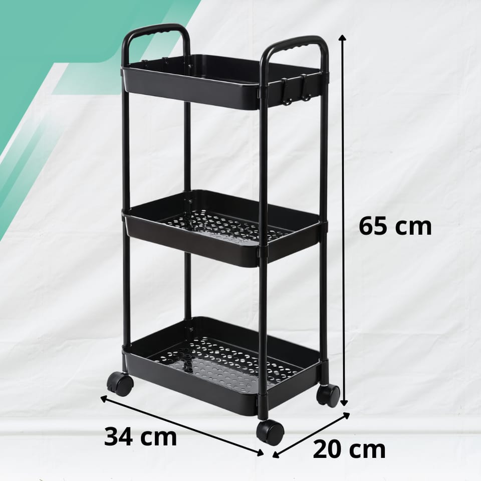 Wózek wyposażony jest w trzy półki o zwiększonej powierzchni użytkowej, które pomieszczą naczynia, przybory kuchenne, drobne urządzenia AGD lub artykuły gospodarstwa domowego. Kółka zapewniają płynny i cichy ruch.