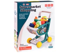 Wózek w całości wykonany jest z plastiku, ma szerokie koła wygodną rączkę do prowadzenia. Warzywa/owoce także są plastikowe w atrakcyjnych kolorach.
