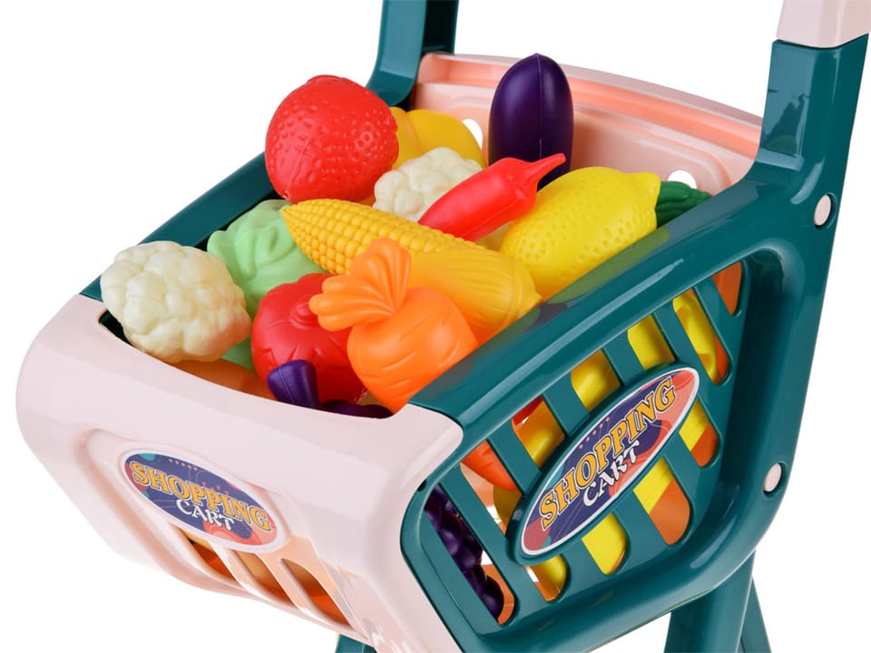 Duży wózek na zakupy wypełniony warzywami i owocami to idealny sprzęt do zabawy w sklep. Dzieci uwielbiają naśladować dorosłych w codziennych czynnościach, dlatego ten super wózek z warzywami przypadnie do gustu każdemu małemu smykowi.