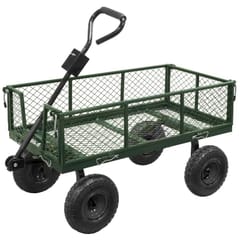 Wózek został wykonany z solidnej stali oraz siatki ogrodowej, co gwarantuje jego wytrzymałość i trwałość nawet przy intensywnym użytkowaniu w warunkach zewnętrznych.