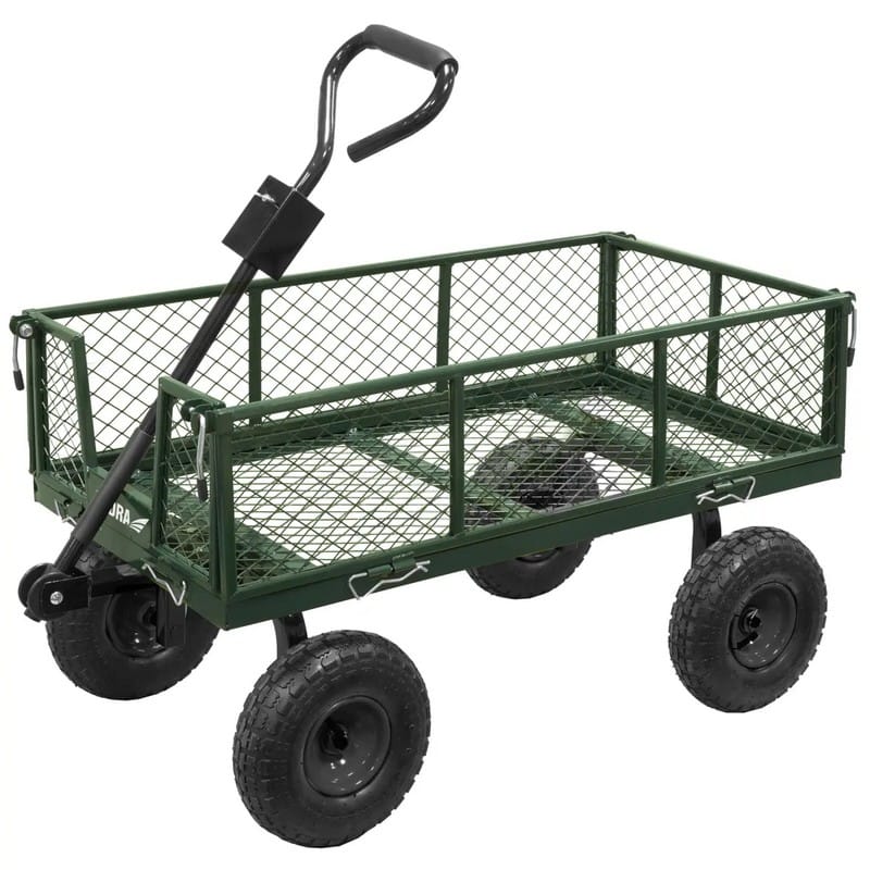 Wyposażony w cztery duże, gumowe koła umożliwia łatwe poruszanie się po nierównym terenie, zapewniając stabilność transportowanego ładunku.